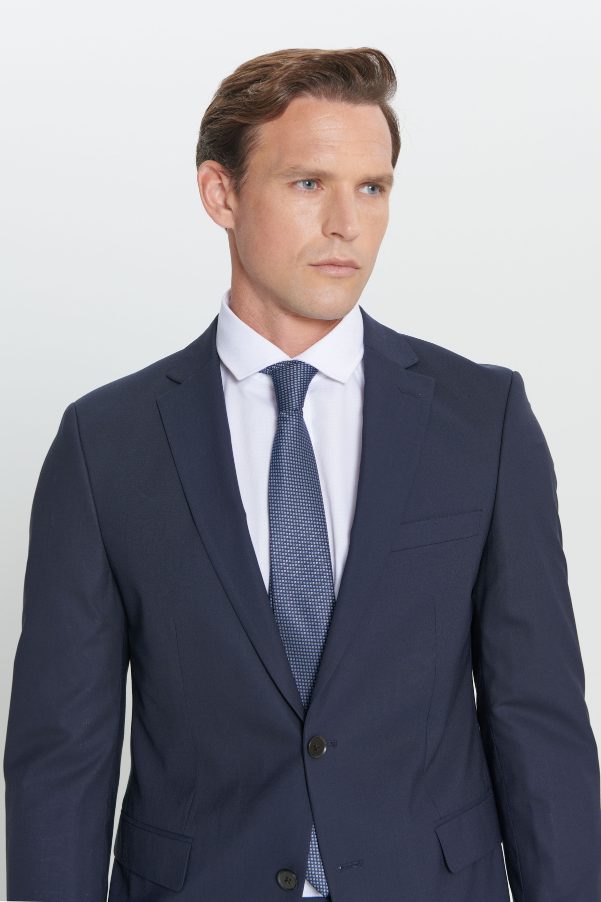 %51 Polyester, %24 Viskoz, %23 Yün, %2 Elastan, Düz Lacivert, Slim Fit, Klasik Model, Mono Yaka, Uzun Kol, Normal Bel, Dar Paça, Tek Yırtmaç, Nano Takım Elbisenin Mucizevi Kumaşı, Nano Moleküller Sayesinde Leke, Kir ve Su Damlalarını Üzerinden Atar, Etkilenmez.