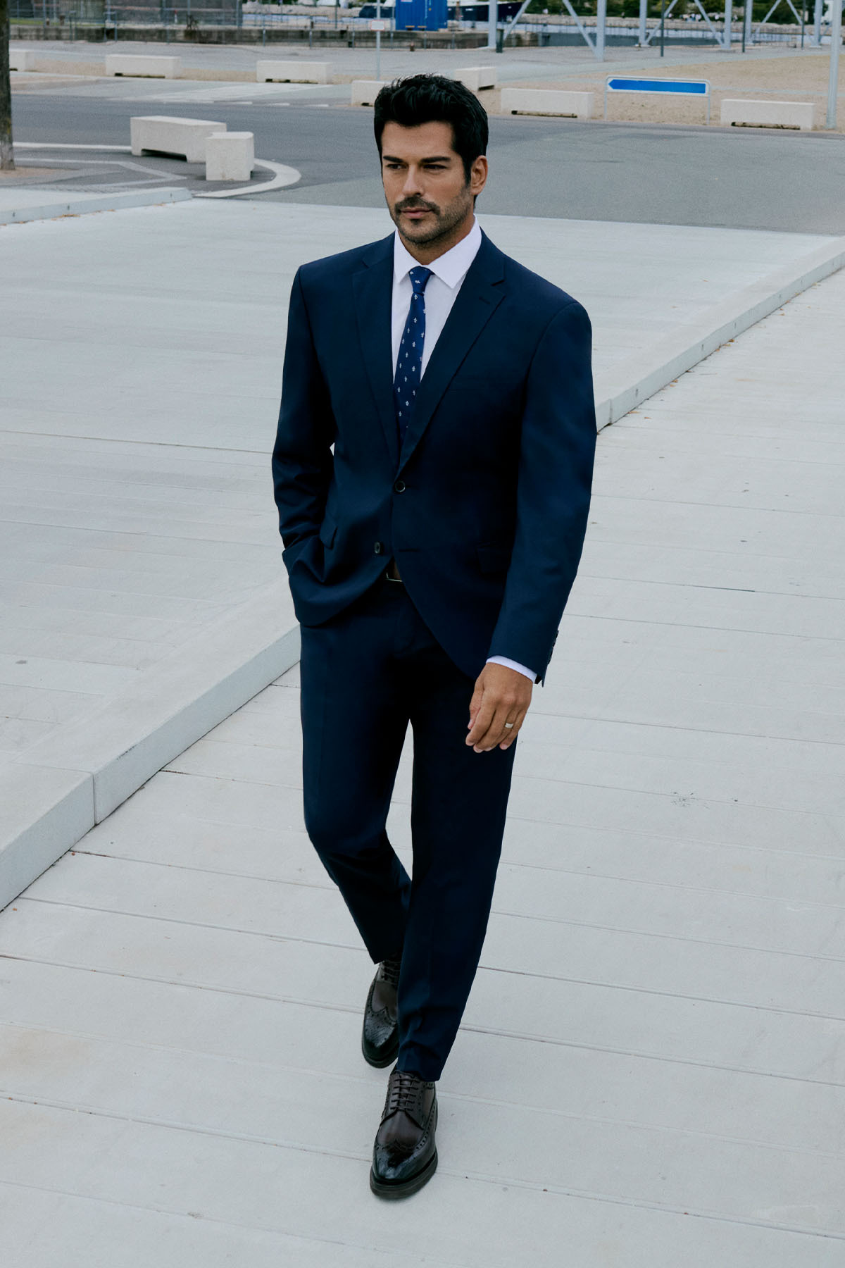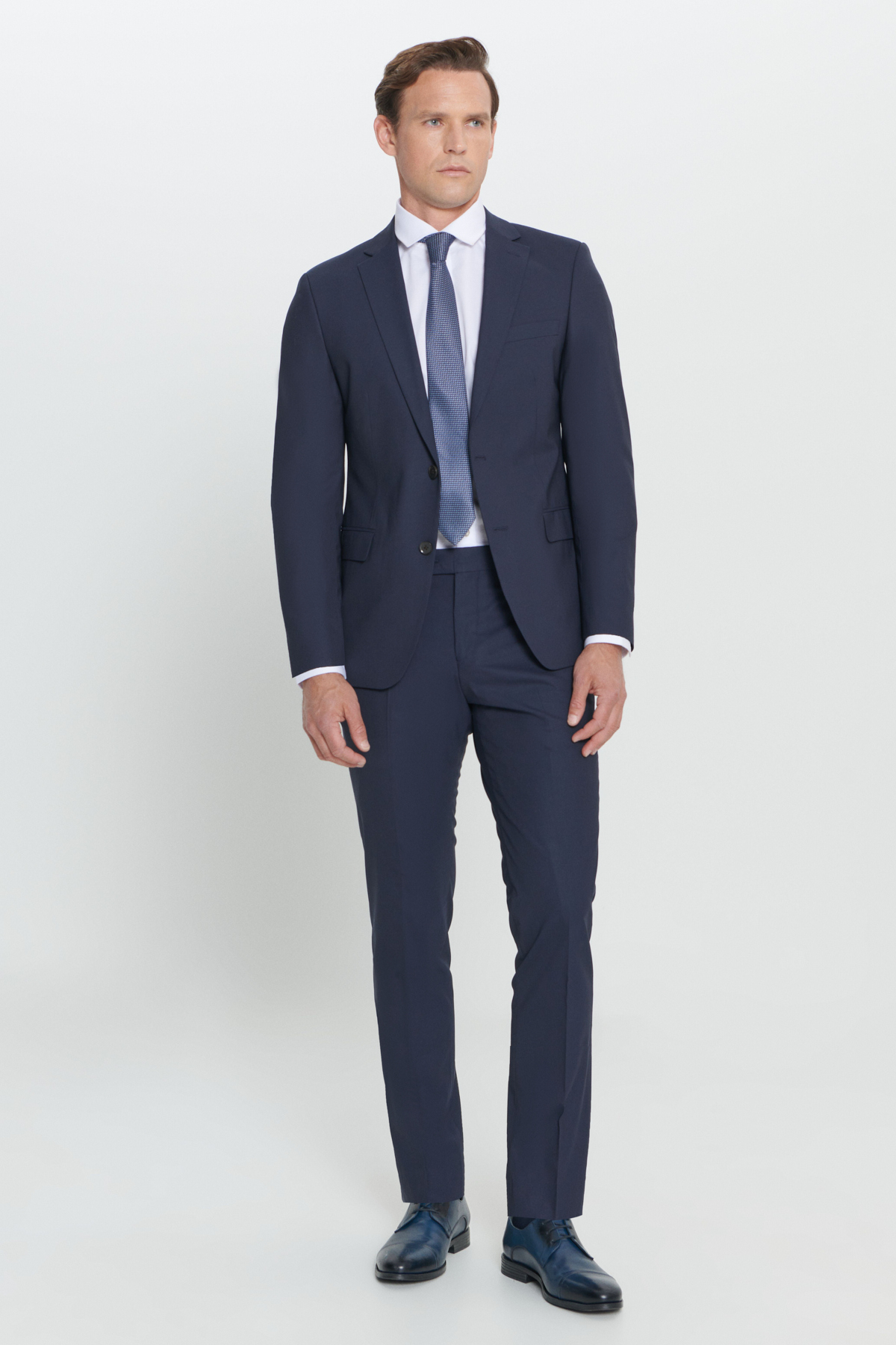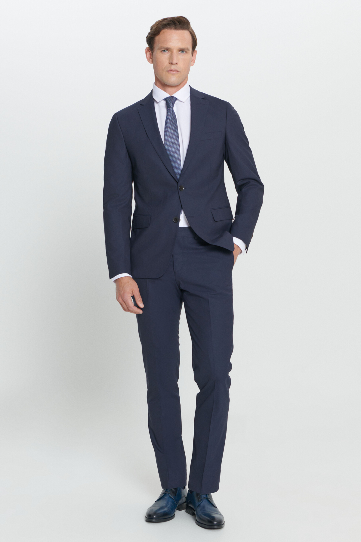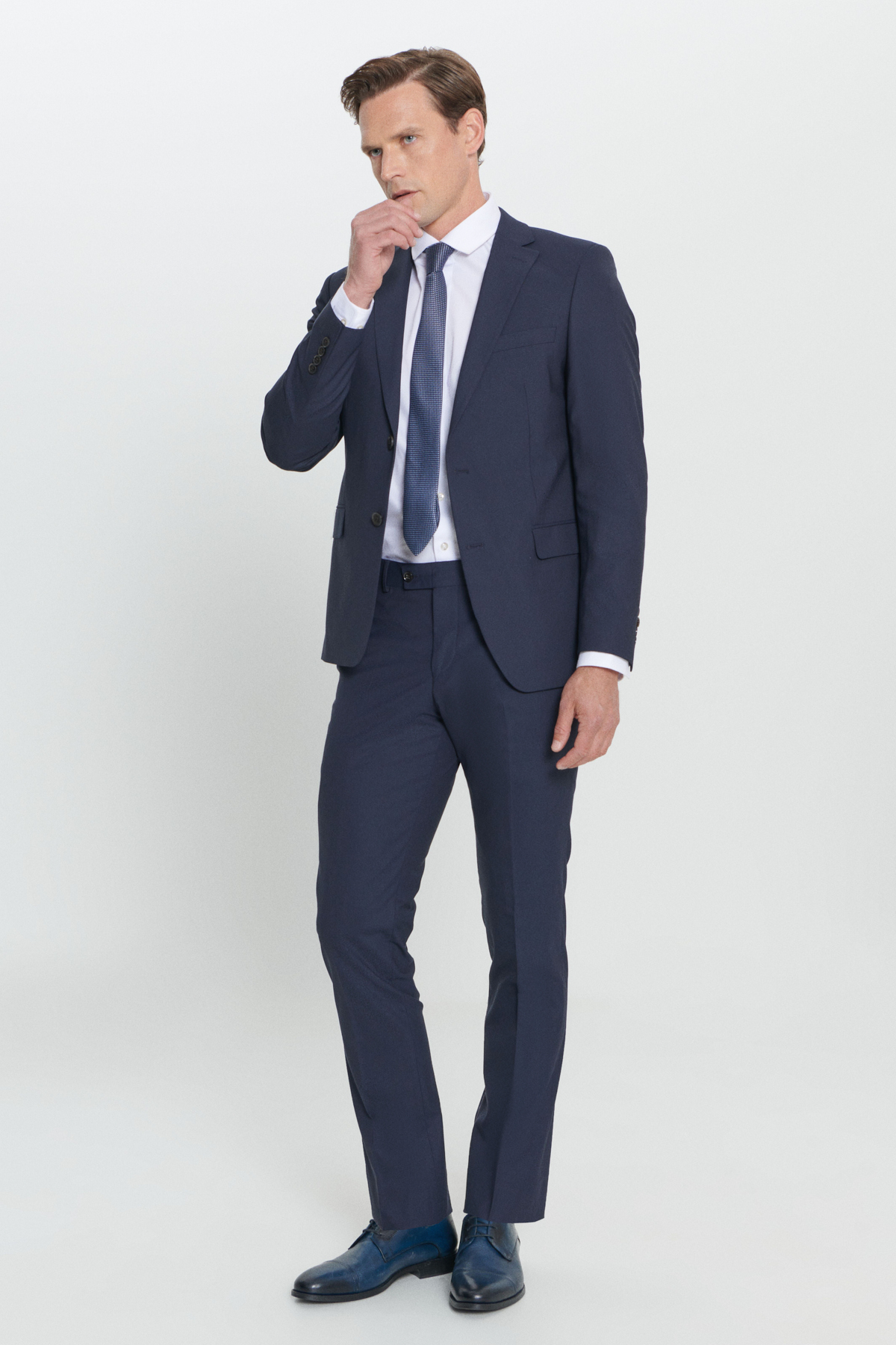 Mono yaka lacivert takım elbise, size özel dikilmiş hissi veren kusursuz kalıbıyla zamansız şıklık sunuyor.