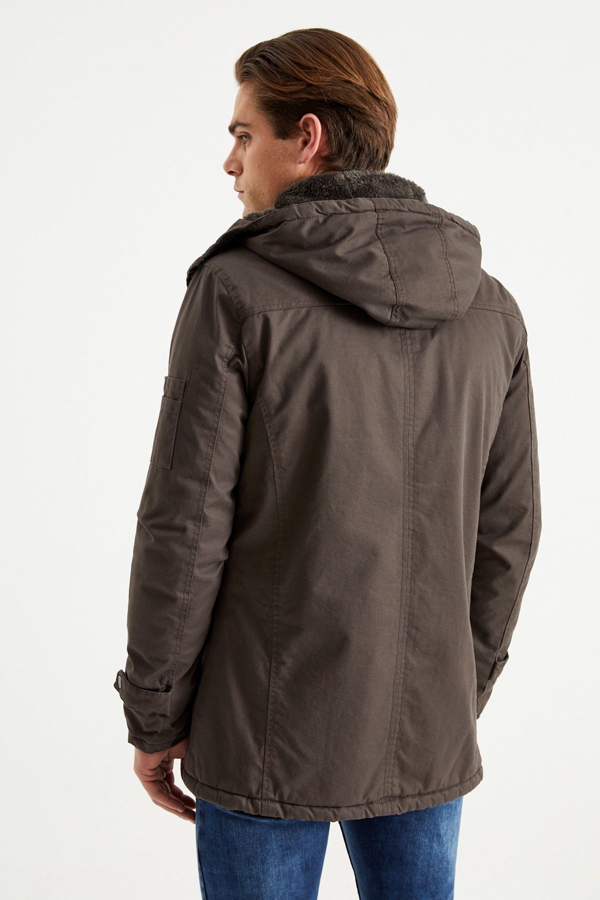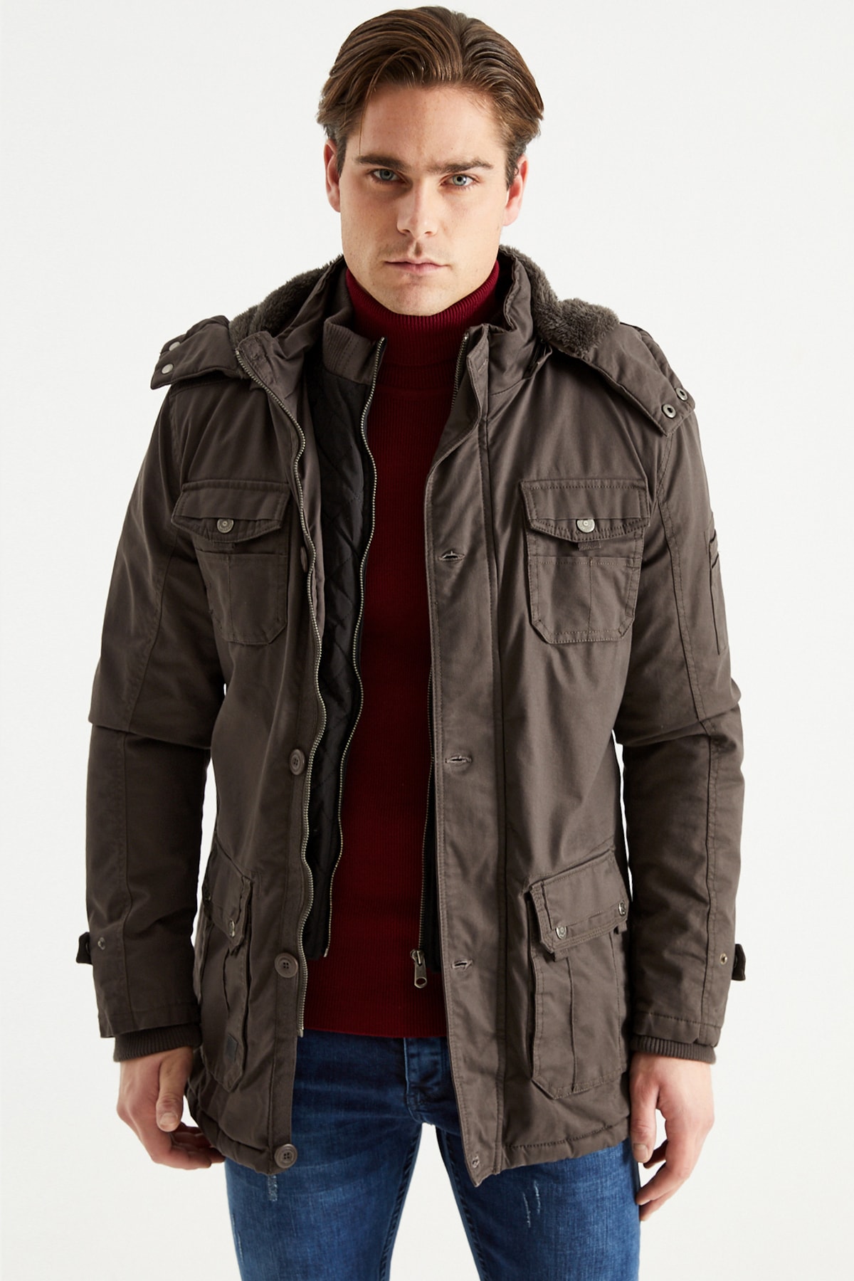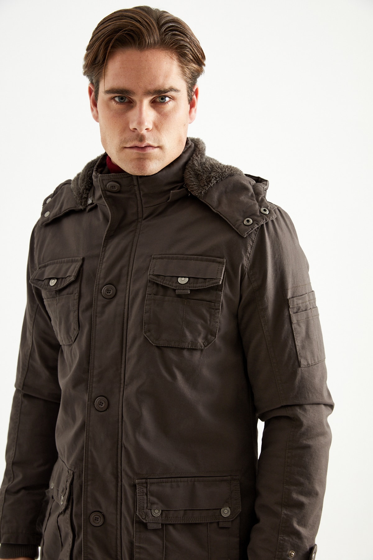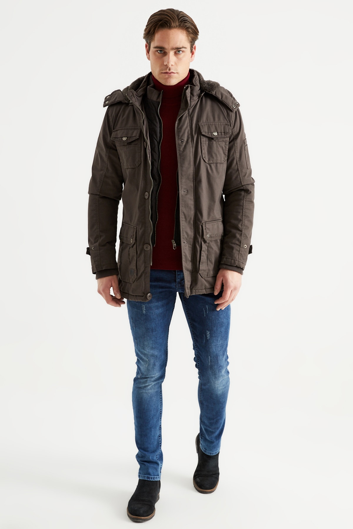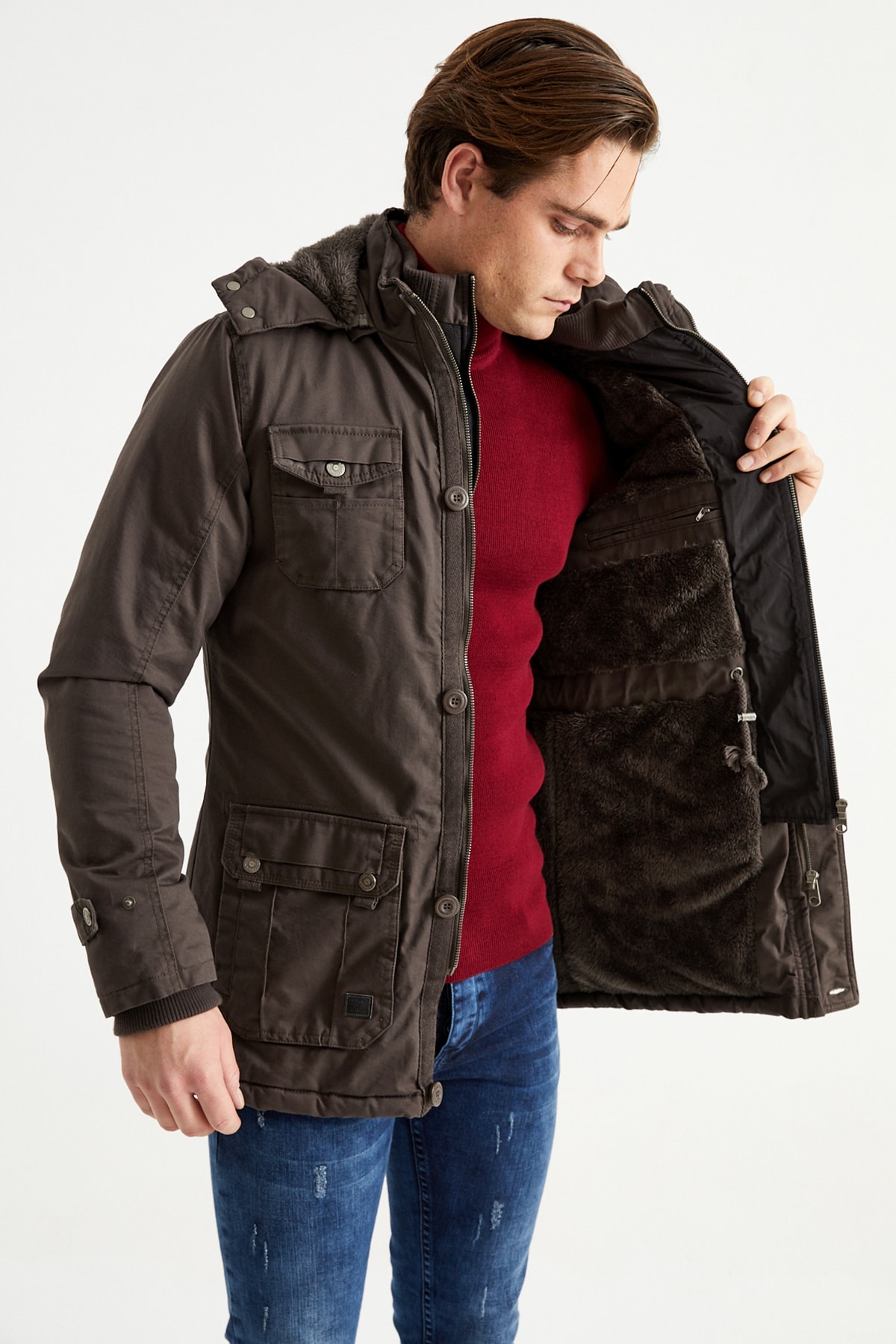 Kapüşonu çıkartılabilen, sıcak tutacak suni kürk astarlı kalın gabardin kaban.