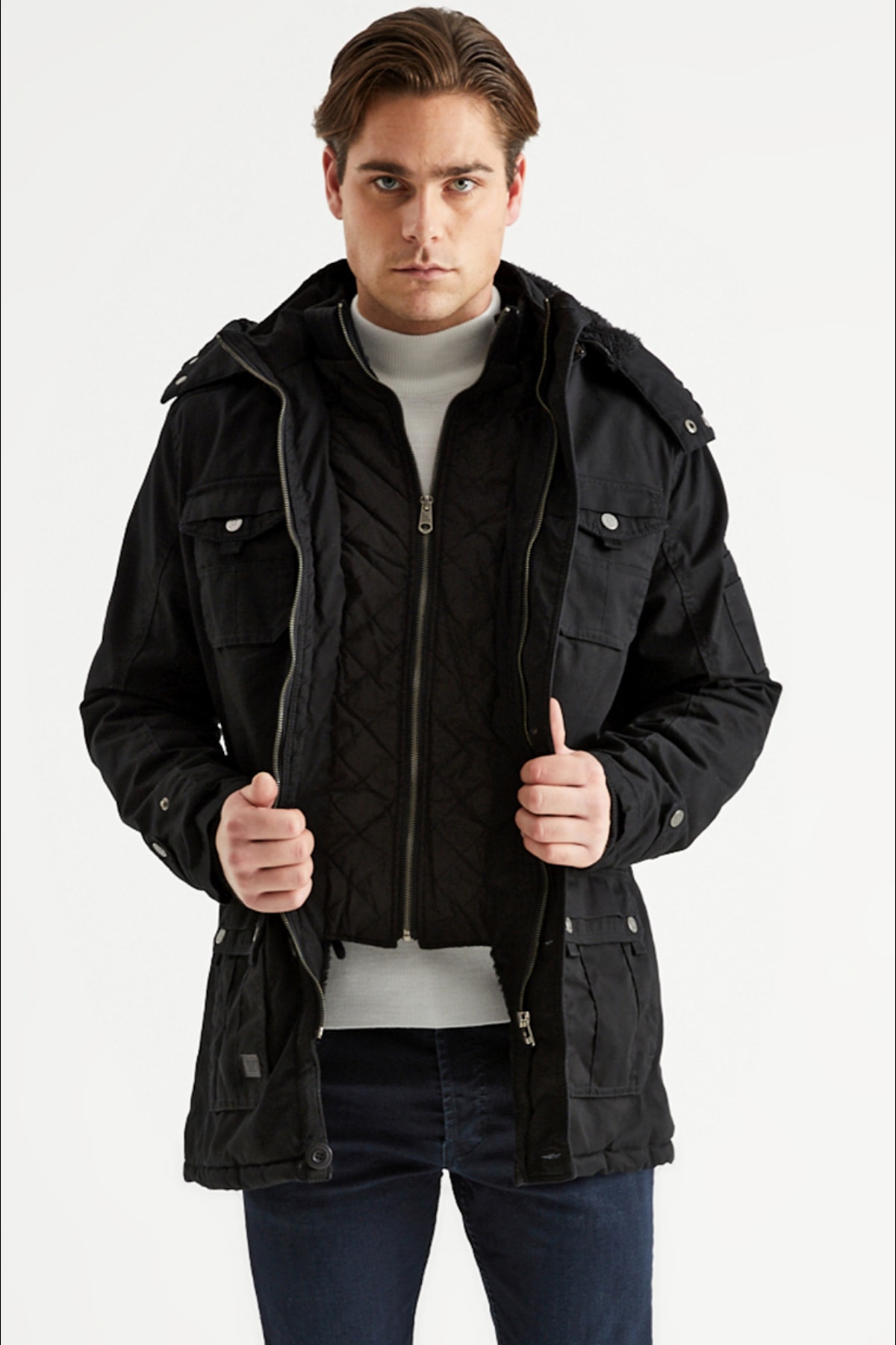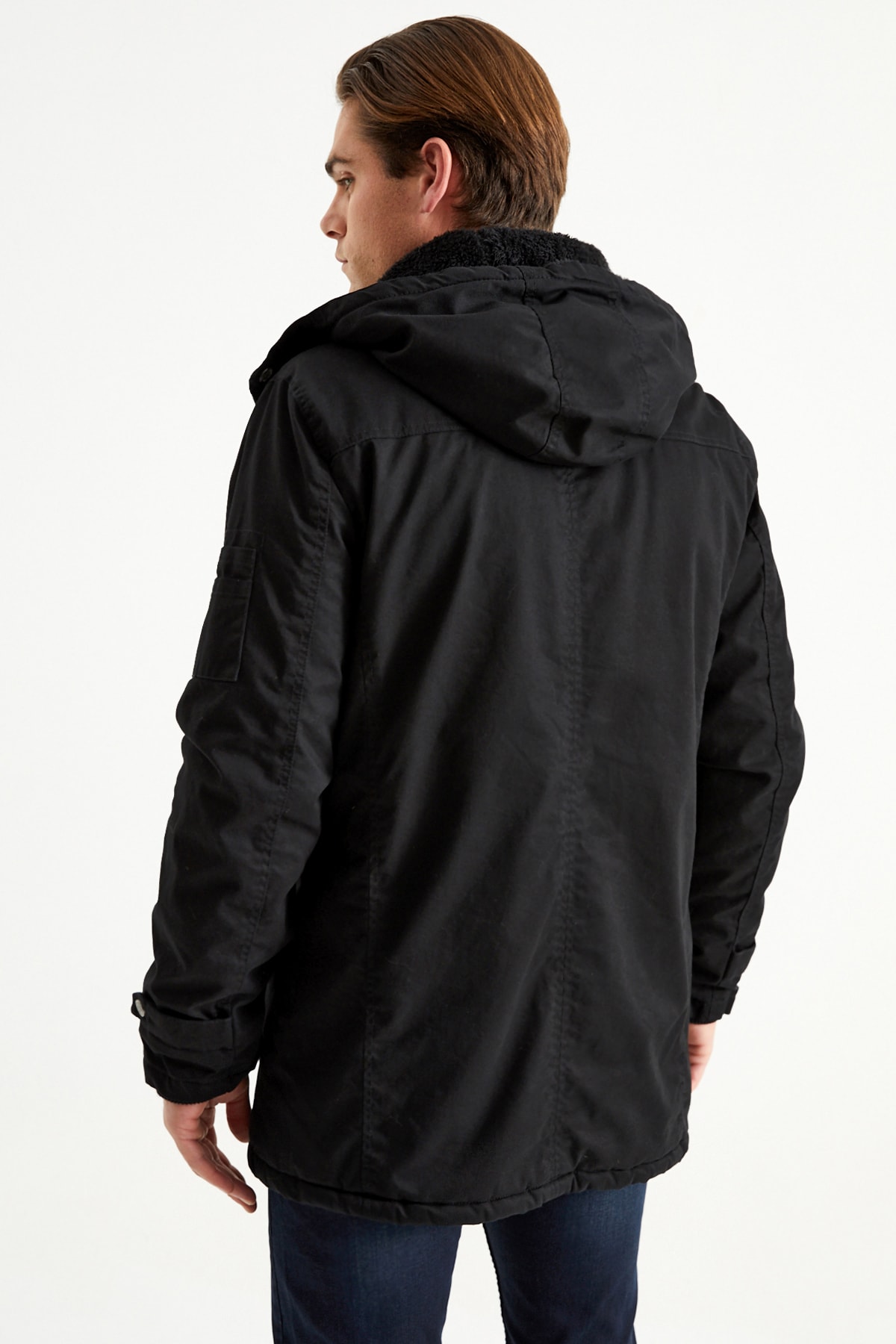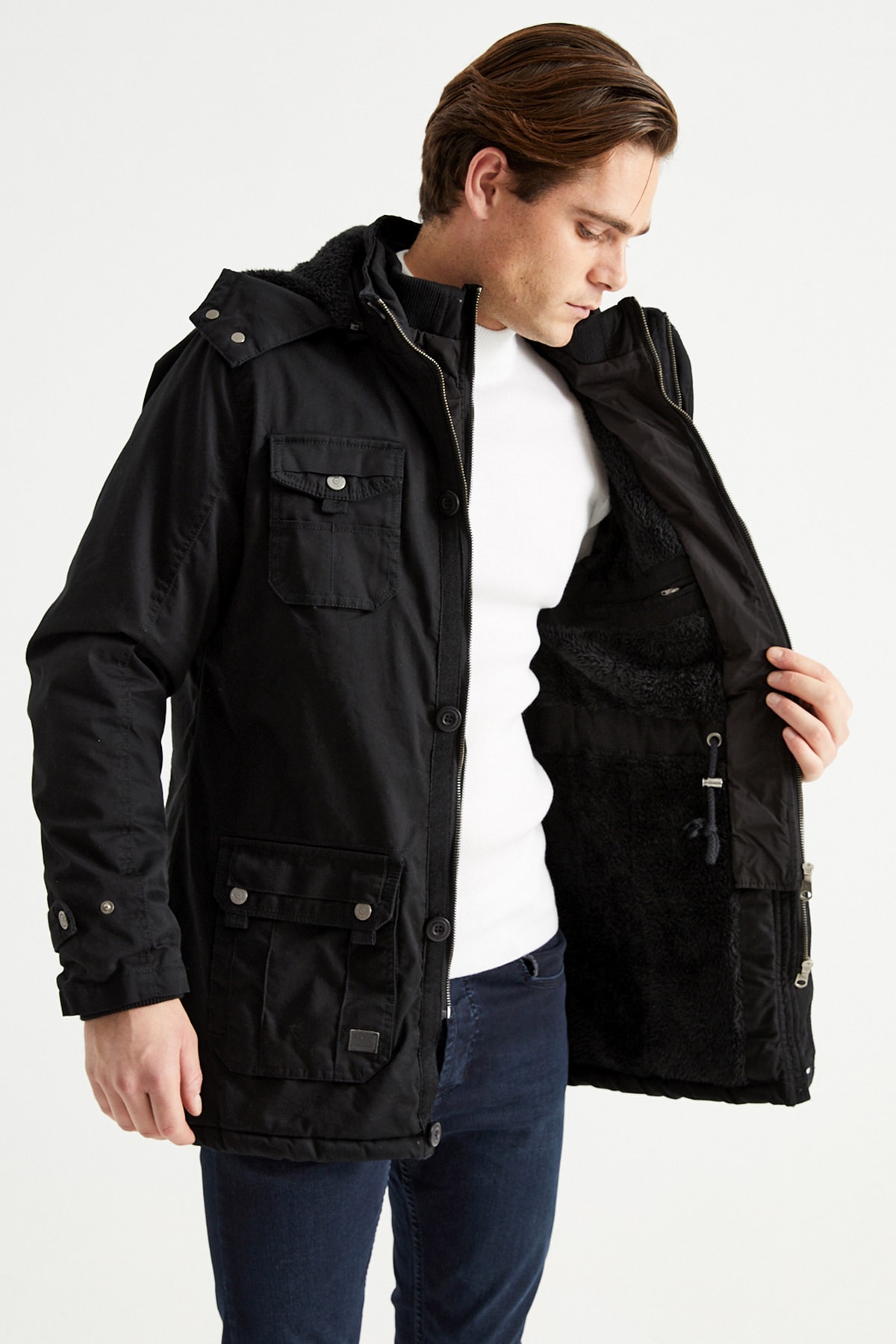 Erkek Siyah Kapüşonlu Kürk Astarlı Su Geçirmez Kaplamalı Kalın Kaban 2485