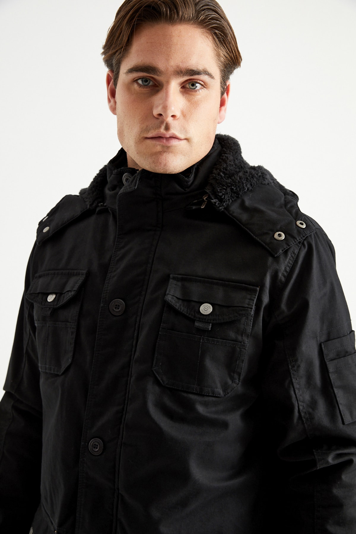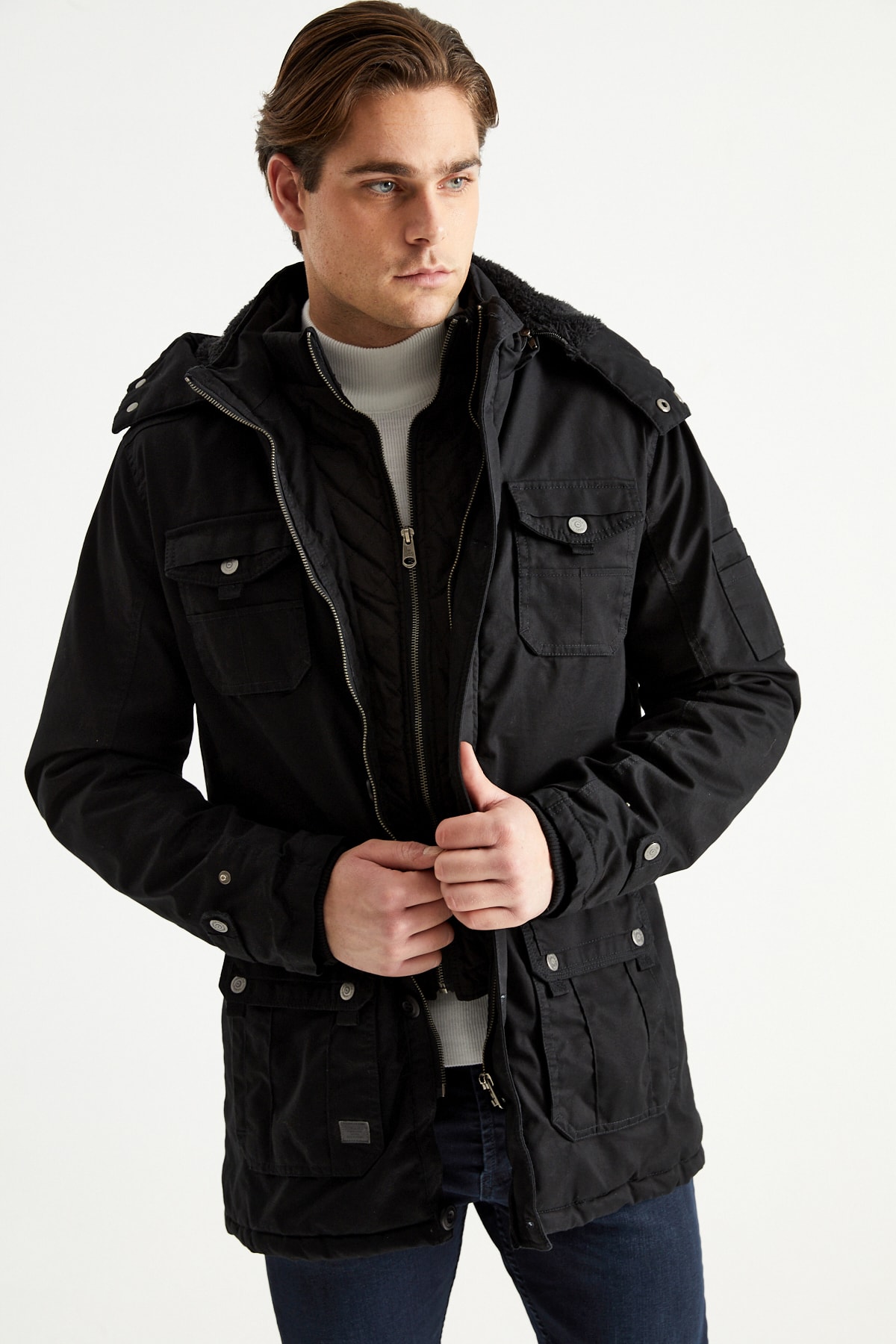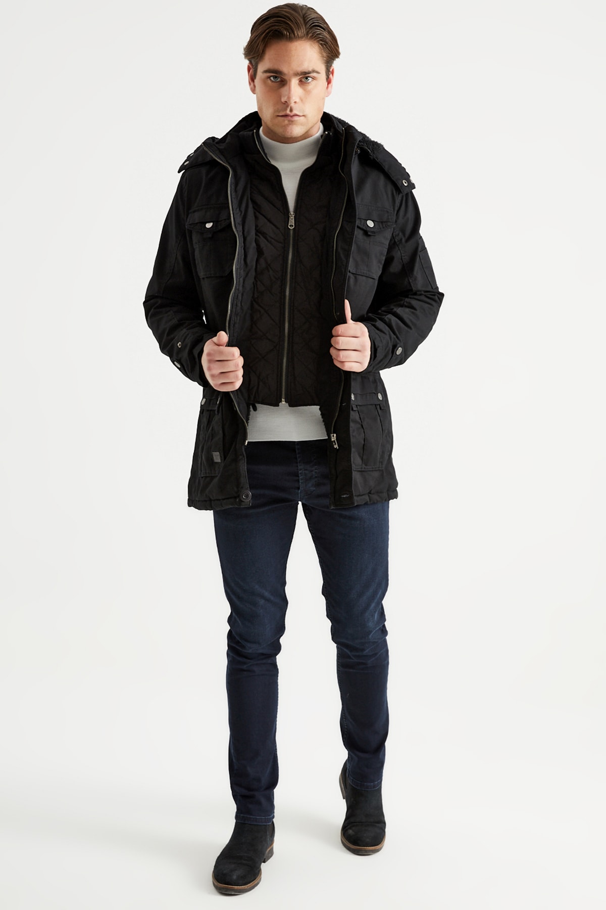Erkek Siyah Kapüşonlu Kürk Astarlı Su Geçirmez Kaplamalı Kalın Kaban 2485