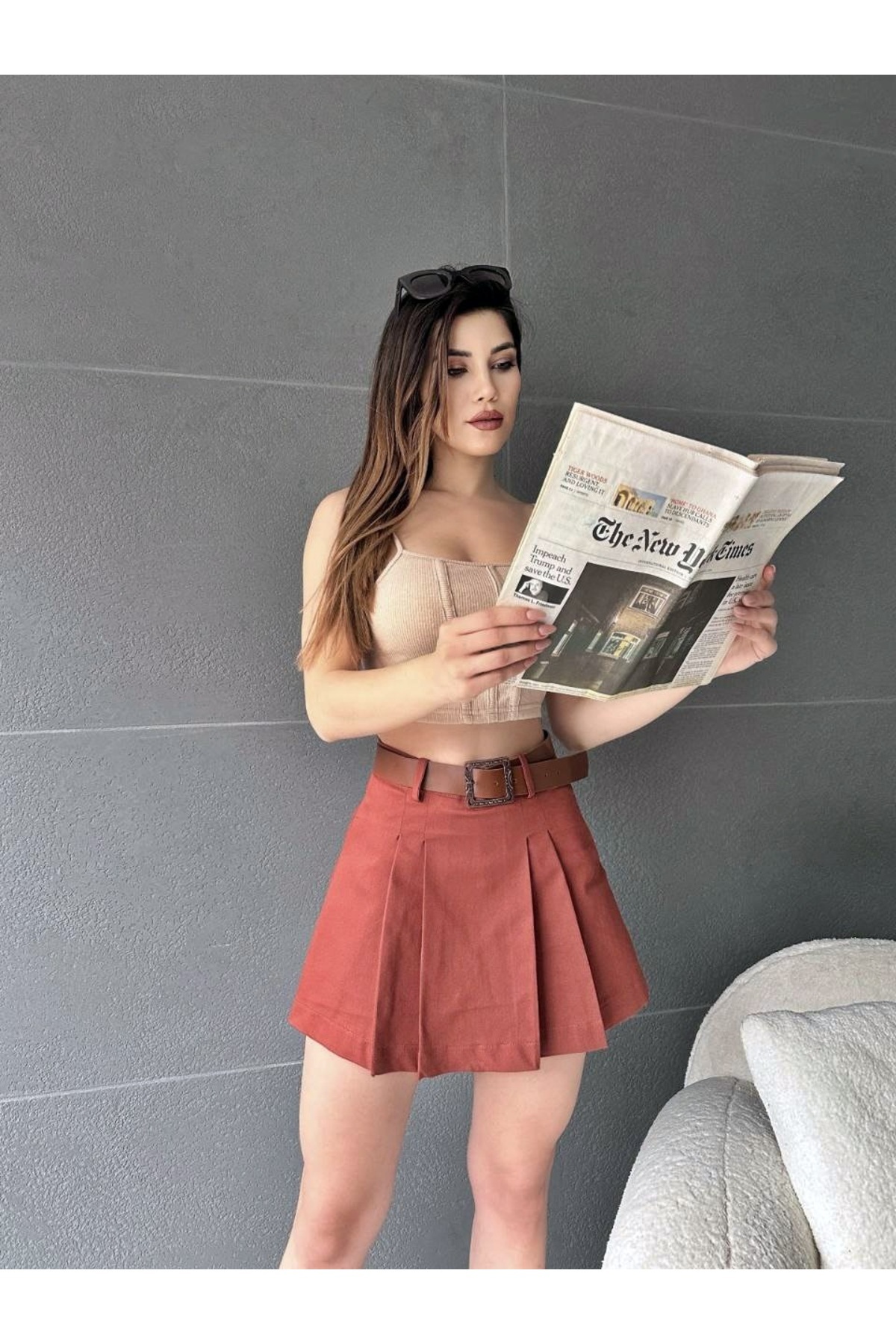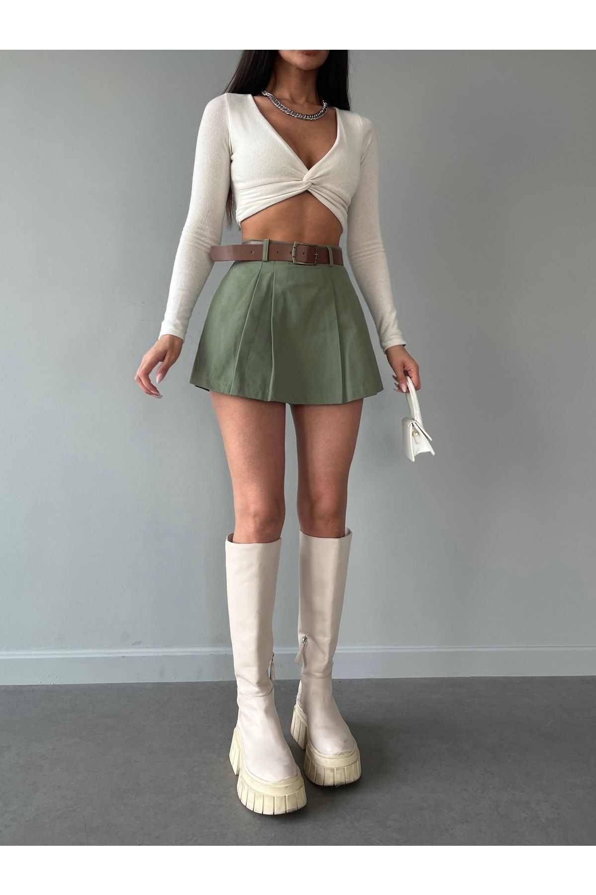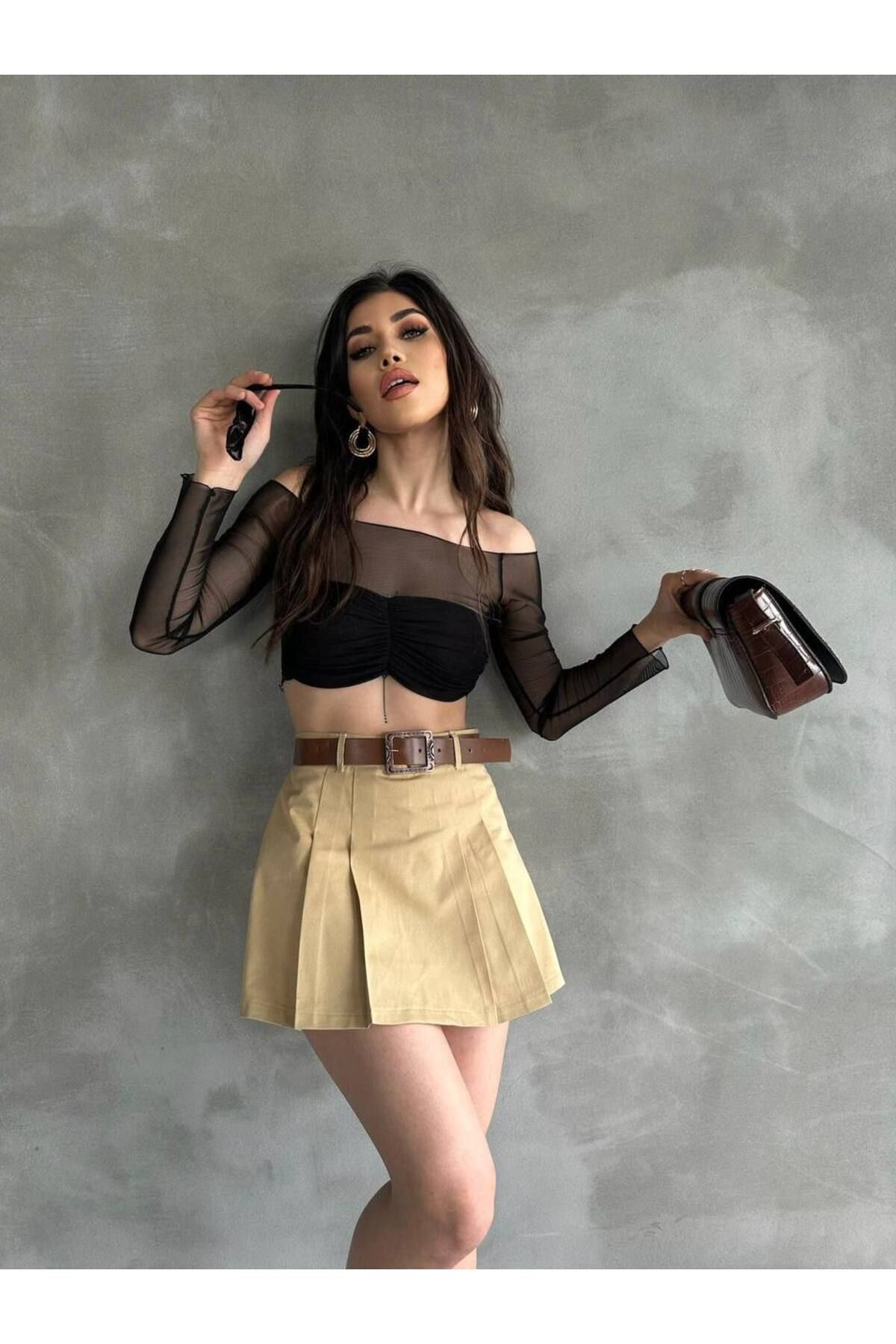 - Krem rengi, şık ve zarif bir görünüm sunan piliseli mini etek.