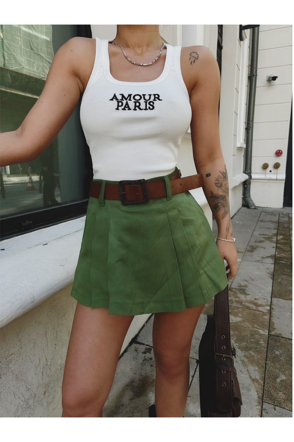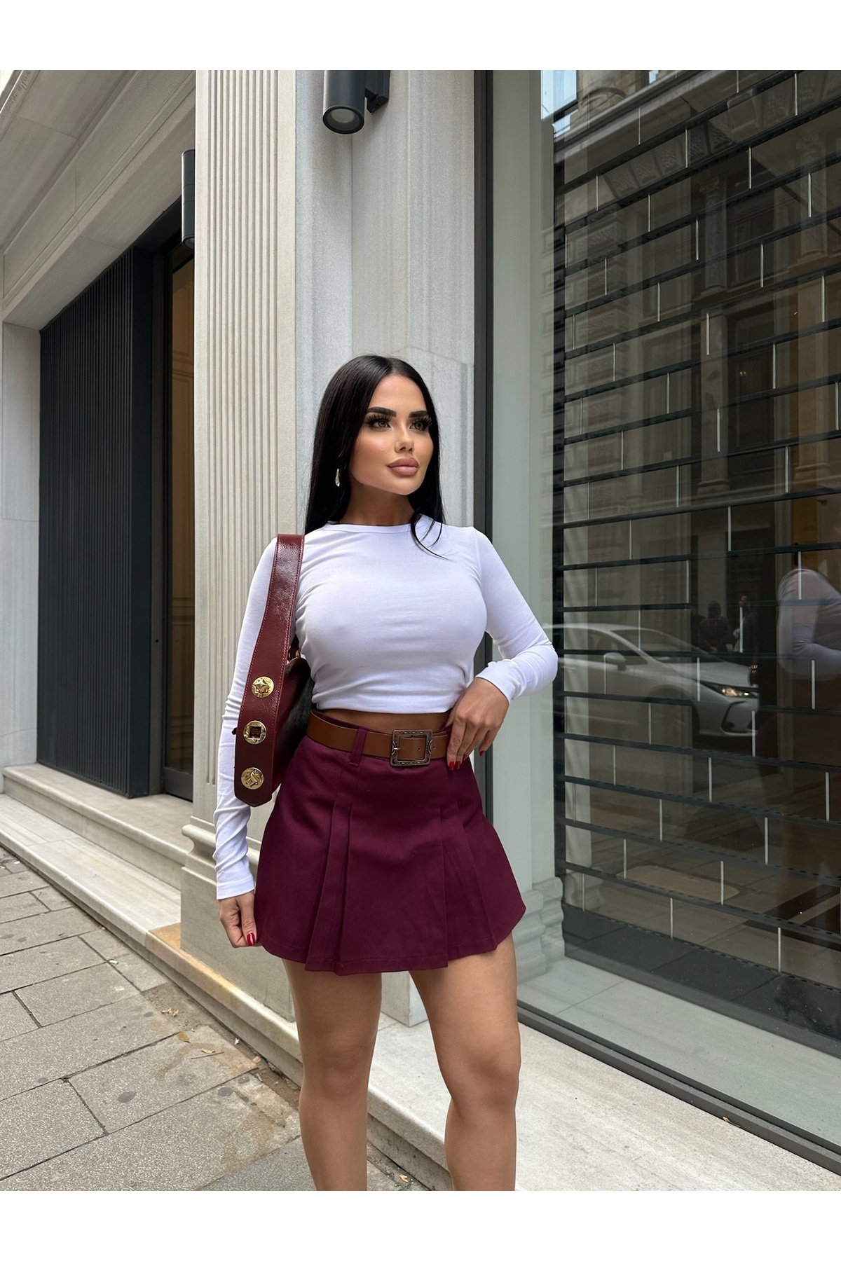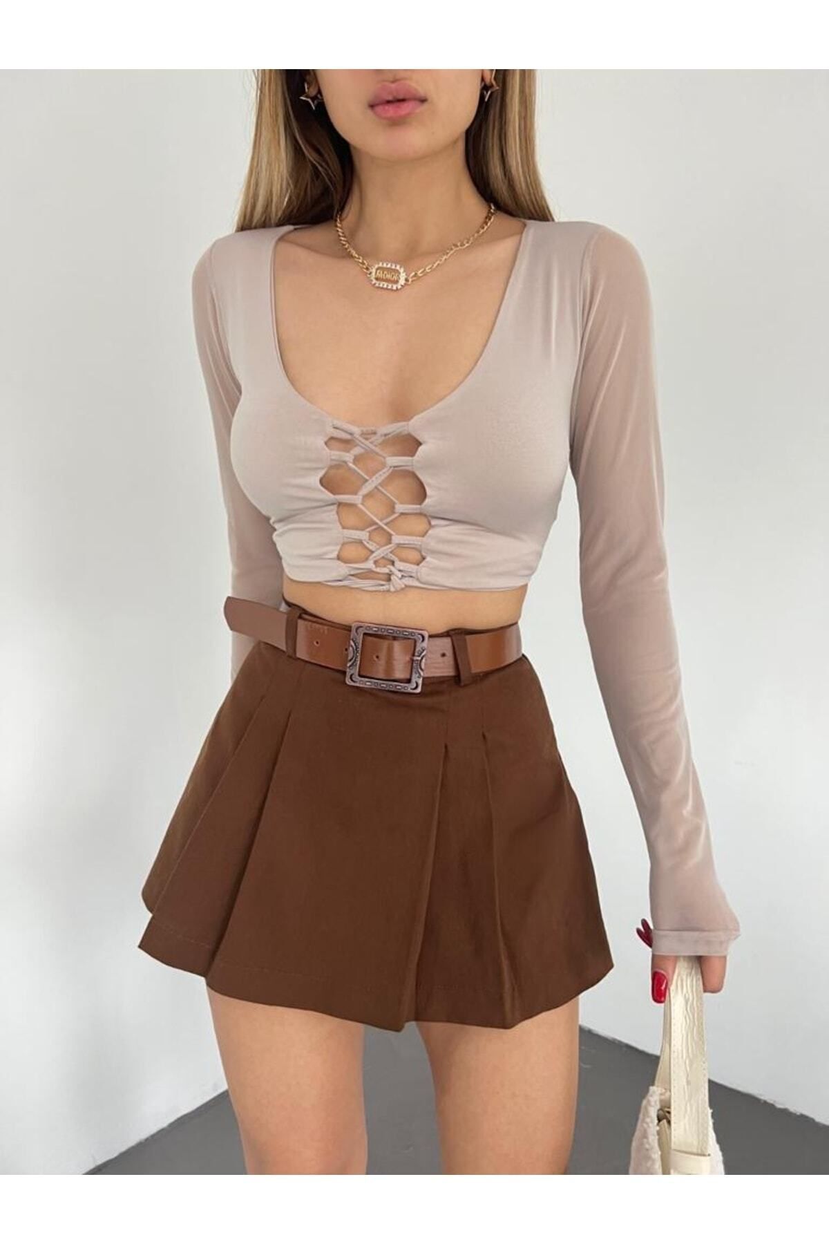 - Krem rengi, şık ve zarif bir görünüm sunan piliseli mini etek.