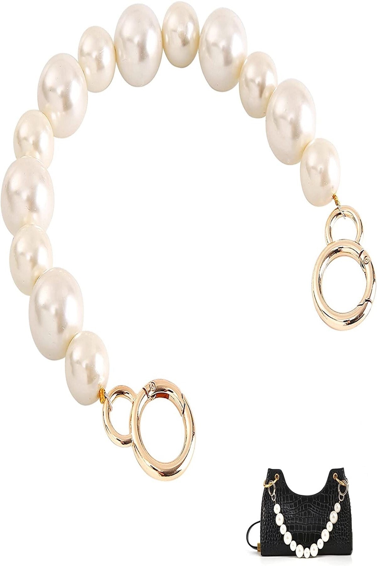 40 cm uzunluğunda, krem rengi inci boncuklarla süslenmiş, çift halkalı dizaynı sayesinde geniş ve rahat kullanım sunan çanta askısı