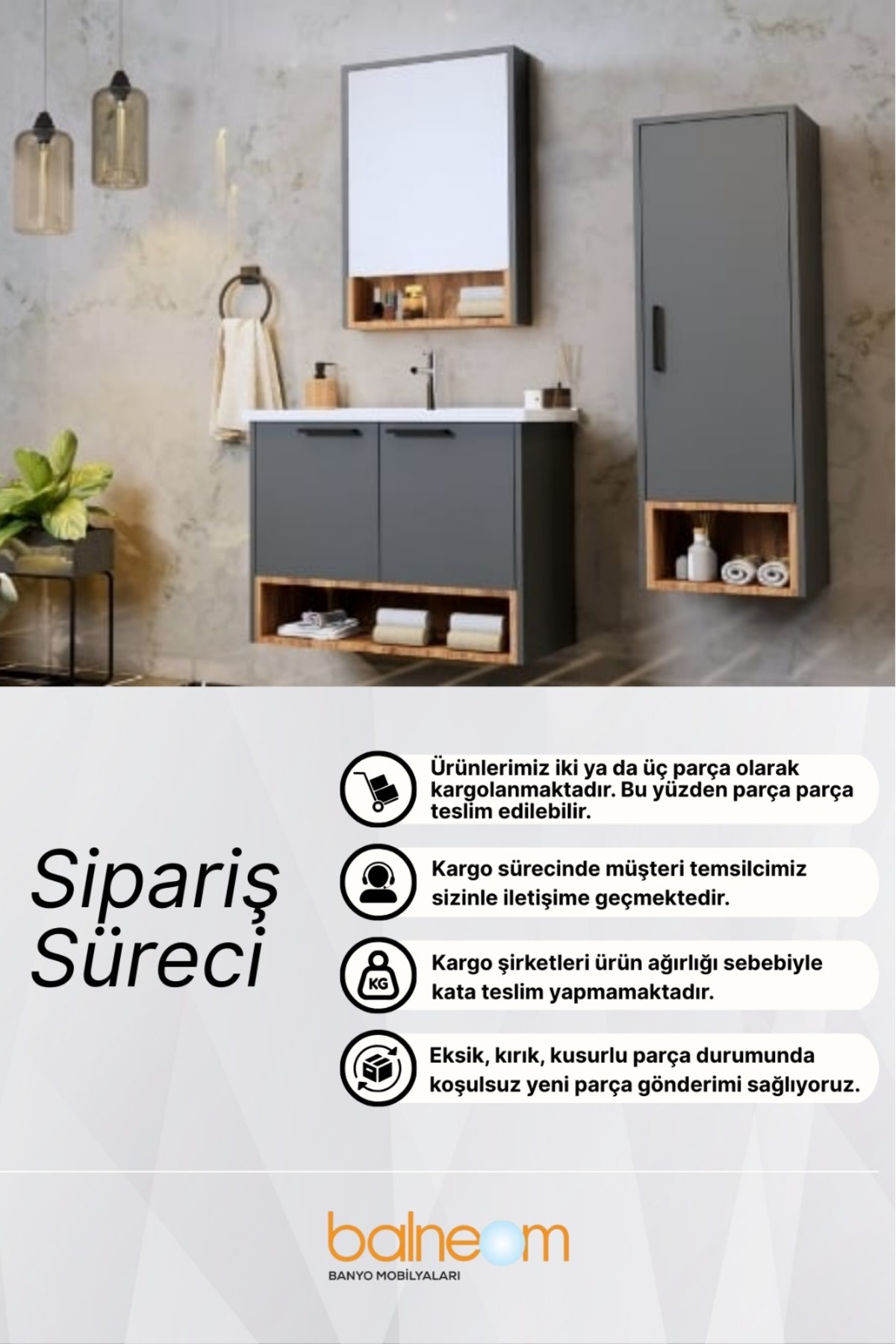 %100 MDF materyalden üretilen Balneom aynalı banyo dolabı takımı ayna, üst yan dolap ve alt modülden oluşur.