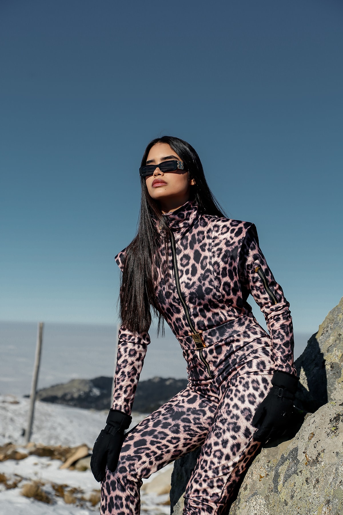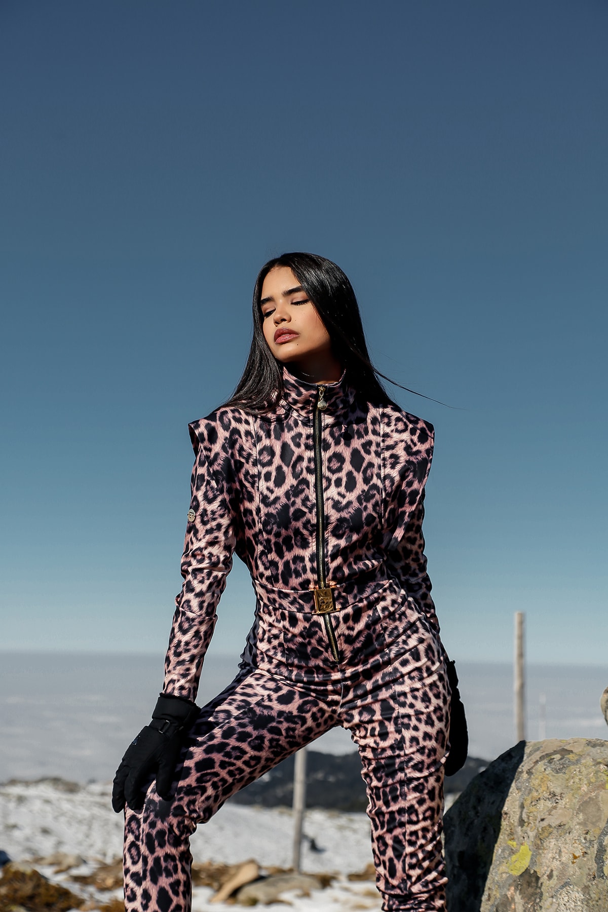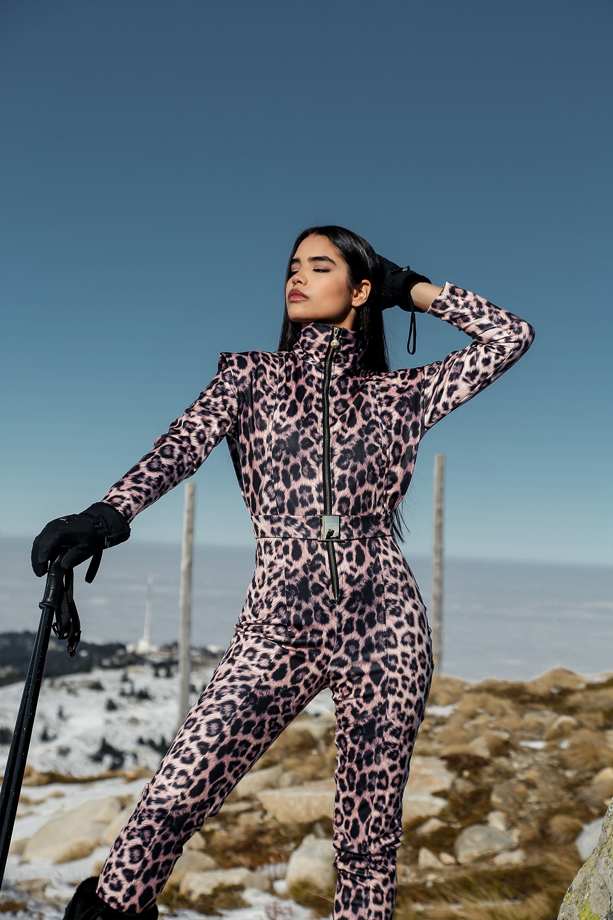 Dik yaka , su geçirmez üstü örtülü metal fermuar , leopar desenli , kayak tulumu 1.