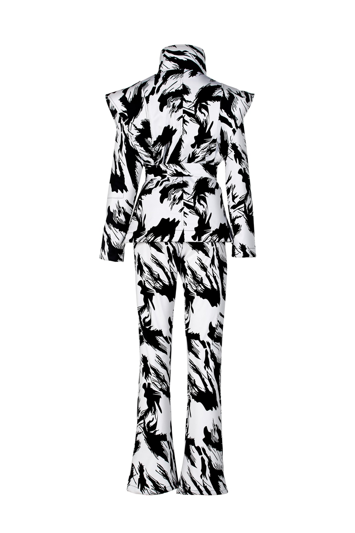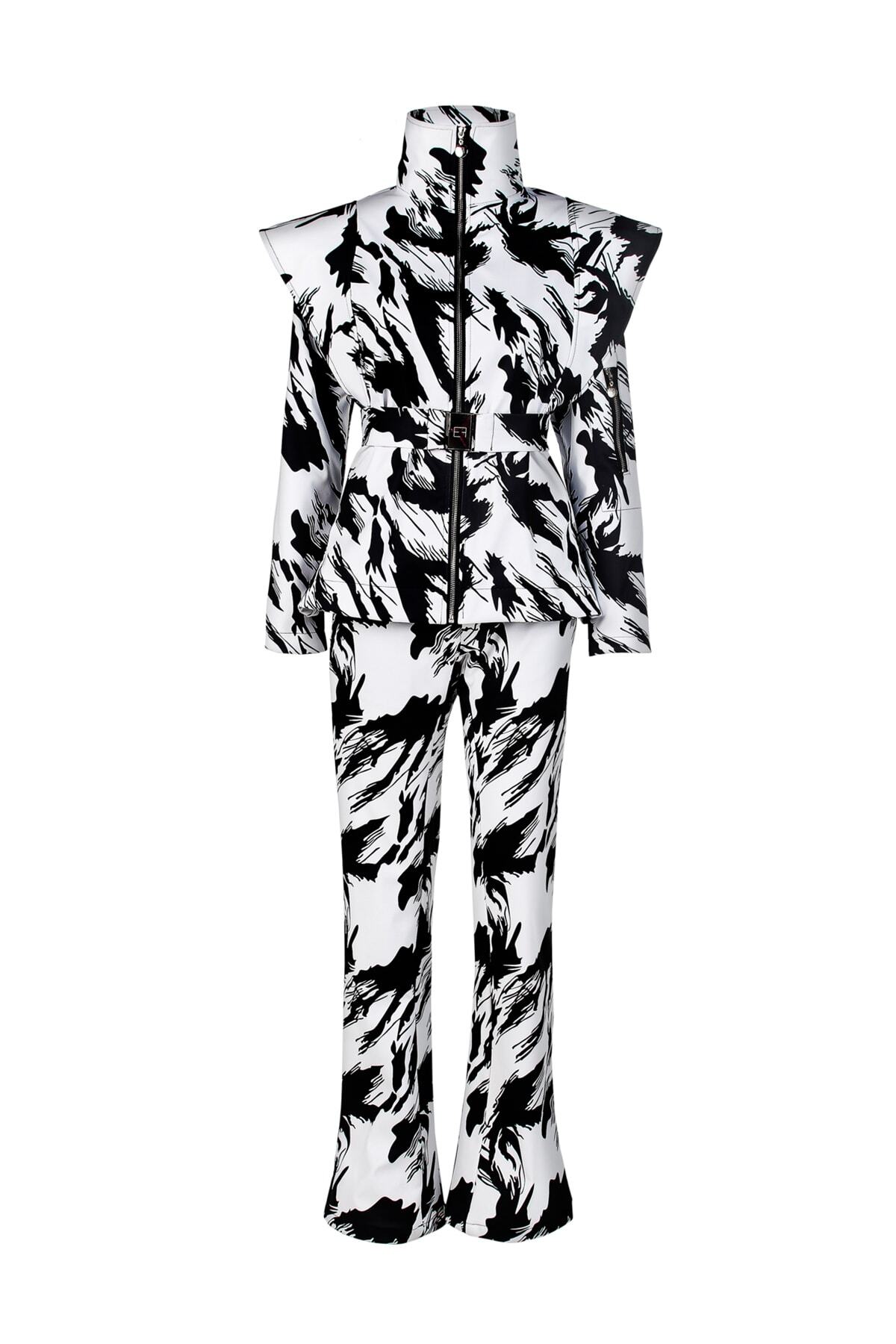 Dik yaka , su geçirmez astar , su geçirmez üstü örtülü metal fermuar , siyah beyaz desenli , tasarım kayak montu.