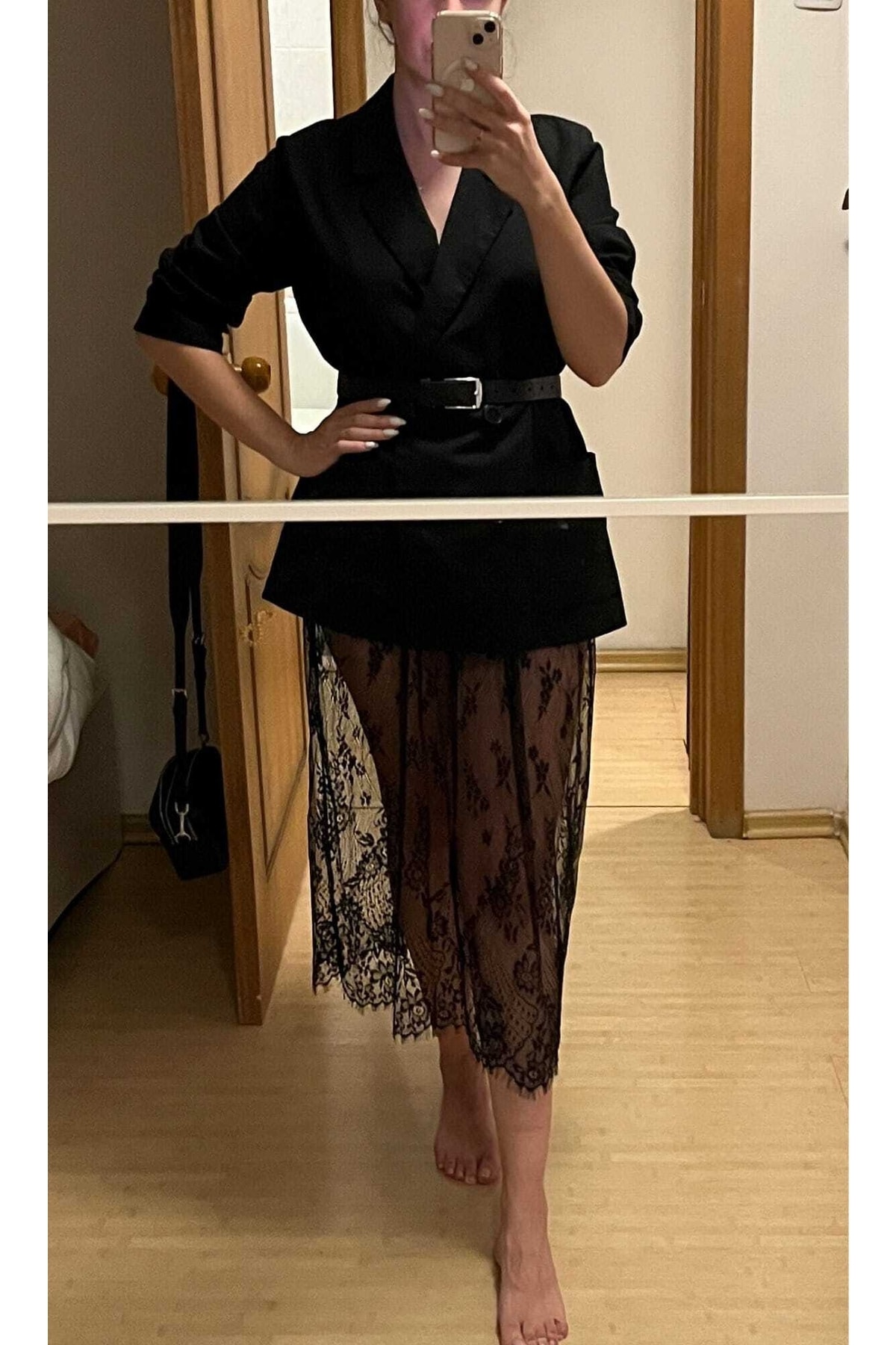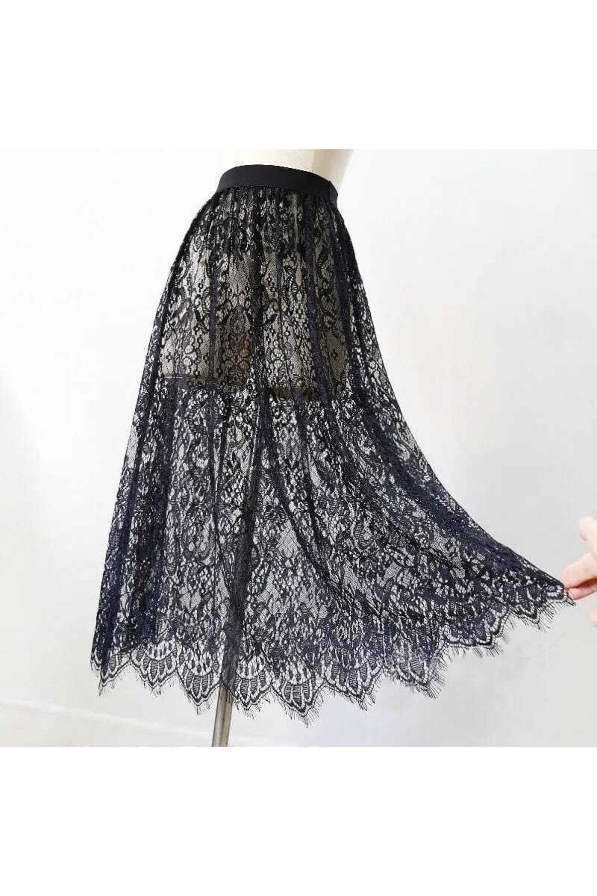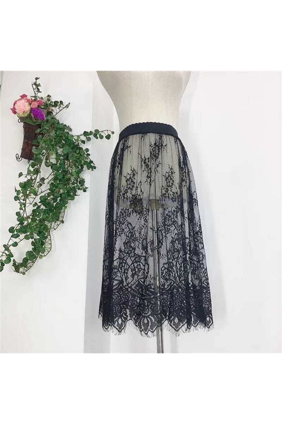 Herhangi bir özel etkinlik veya günlük kullanım için ideal olan bu etek, dantelin şeffaf yapısıyla feminenliği ön plana çıkarır.