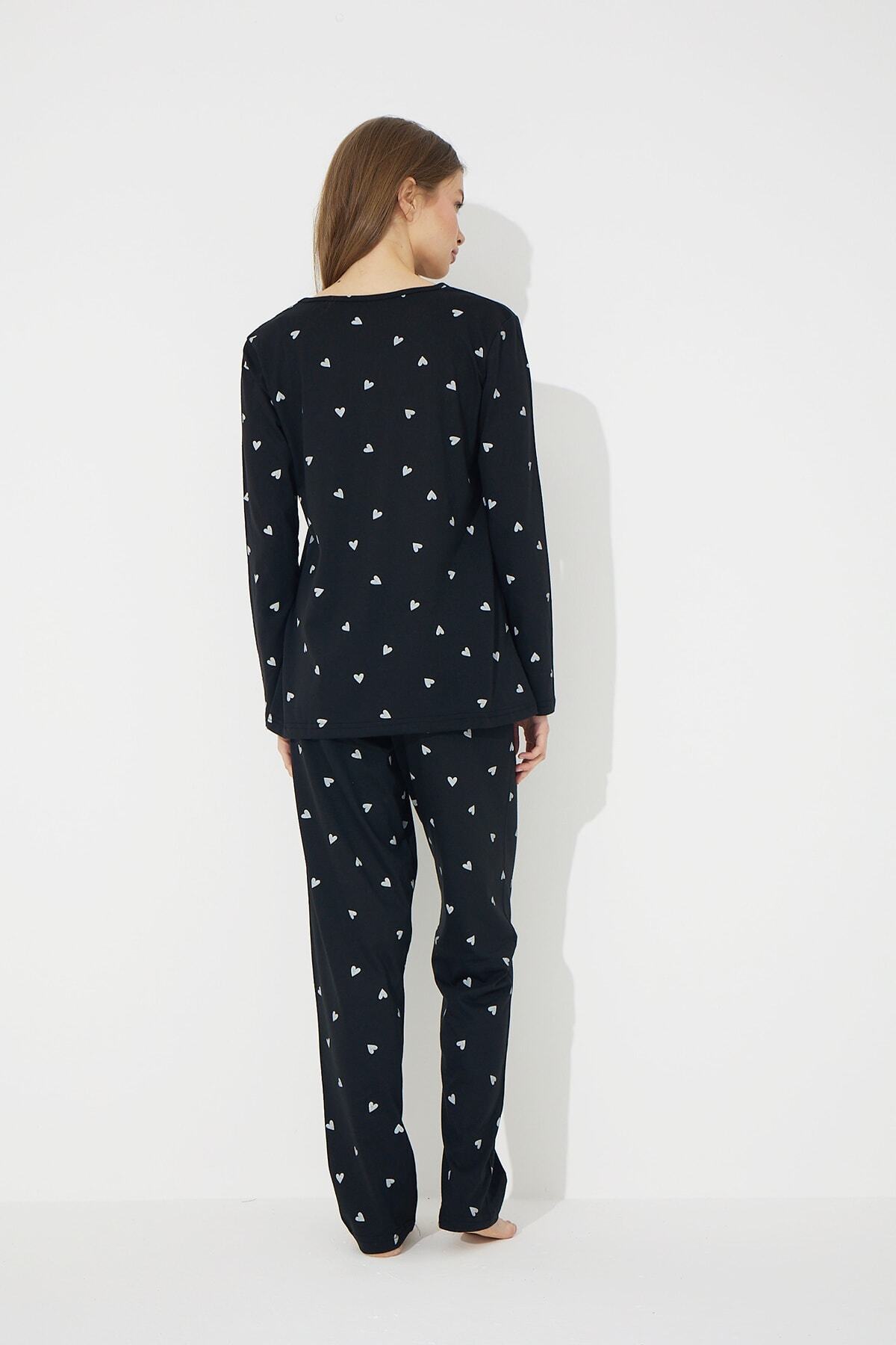 Siyah ve beyaz renklerin uyumlu kombinasyonu ile zarif bir görünüm sunan kalp deseni, ev giyiminize romantik bir dokunuş ekler.