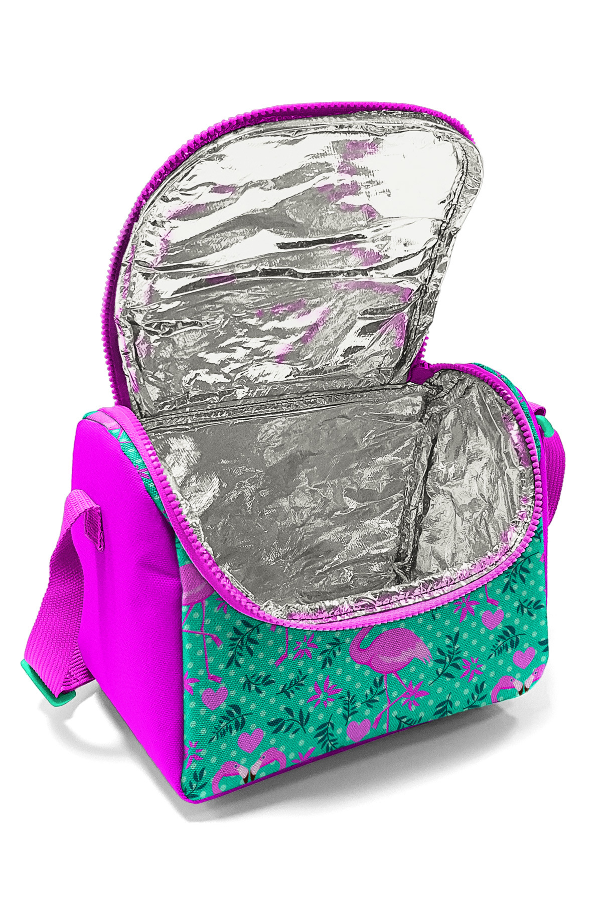 - Çocukların okula dönüş heyecanını artıran, su yeşili ve pembe flamingo desenleriyle süslenmiş şık bir tasarıma sahip beslenme çantası