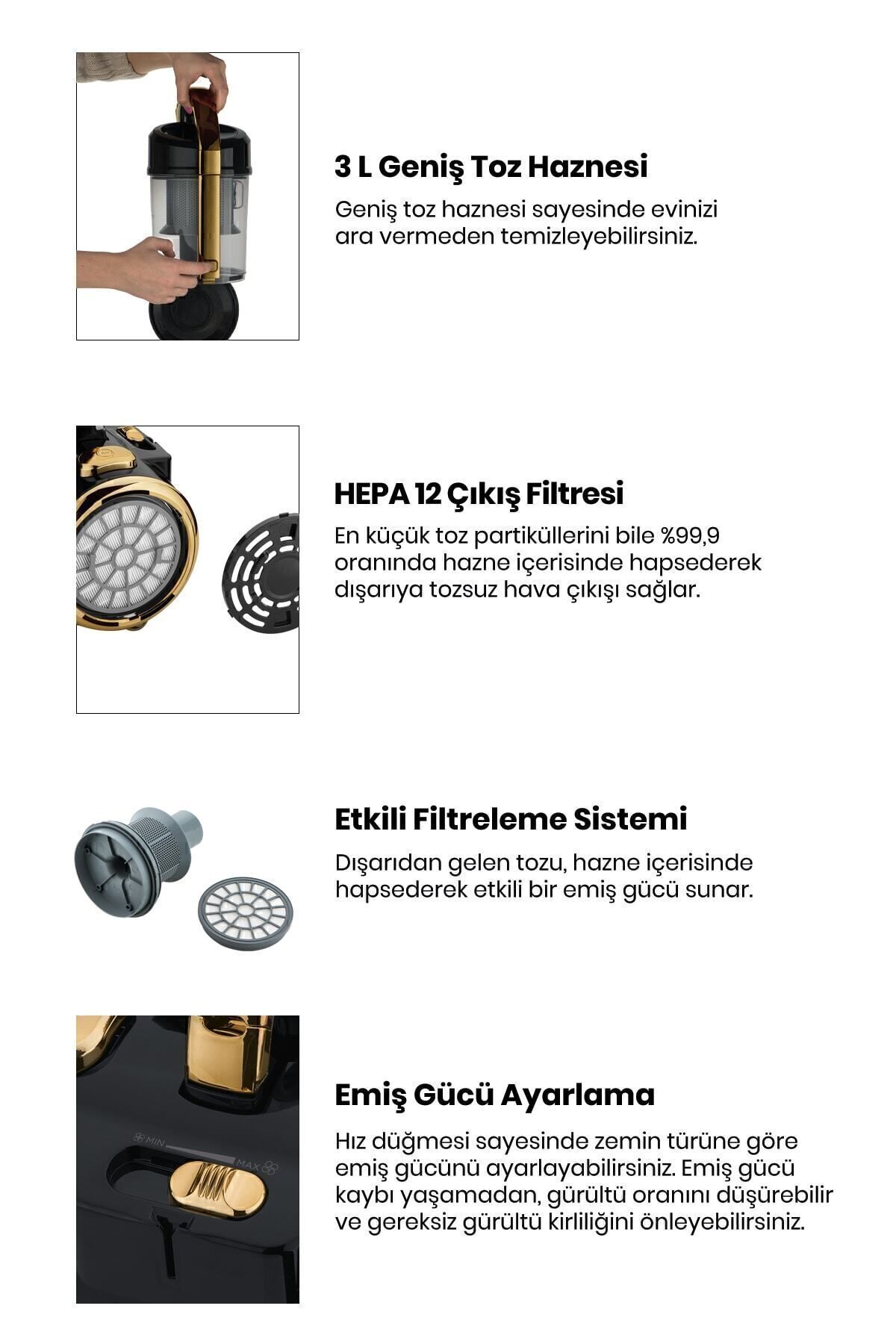 - 71 dBA ile 80 dBA arasında değişen ses seviyesi, rahatsız edici gürültüyü minimuma indirerek daha konforlu bir temizlik deneyimi sunar