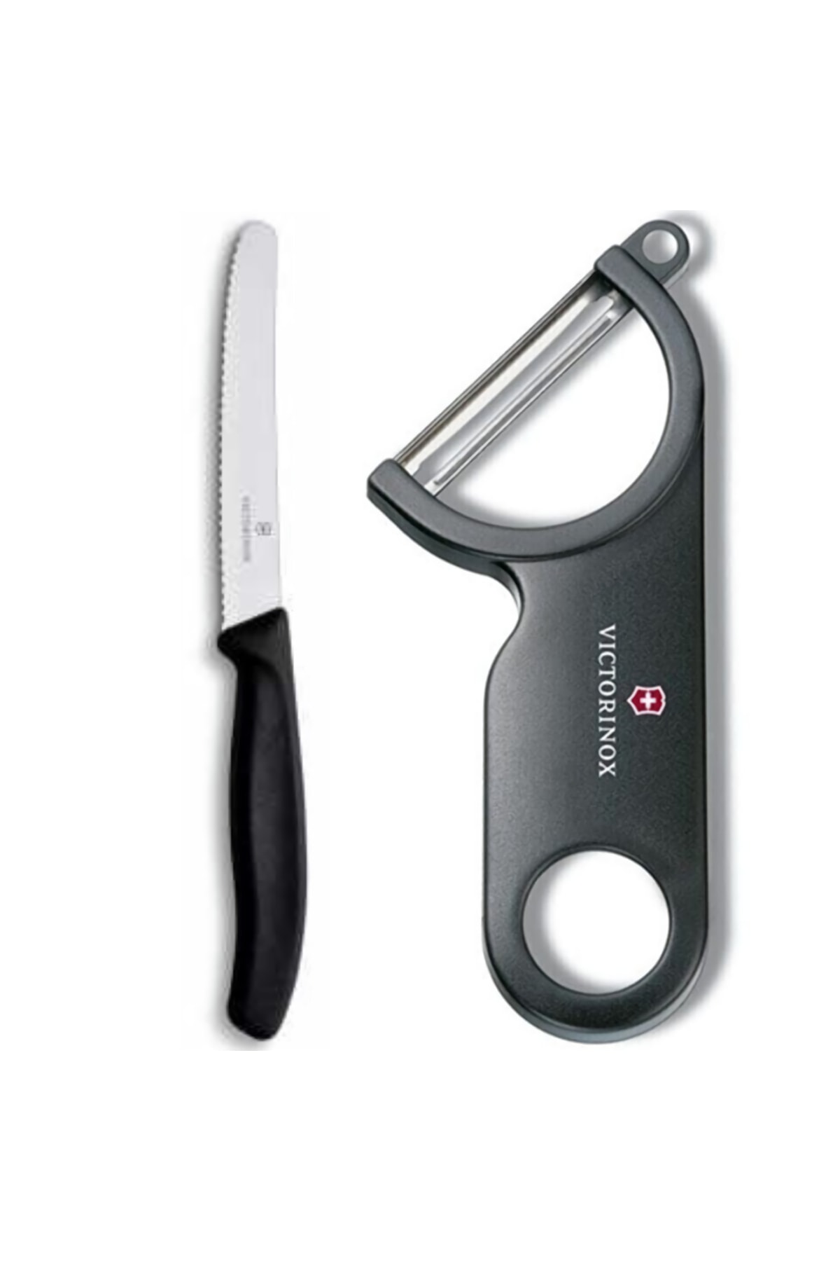 Siyah Soyacak Ve Doğrama Seti SET İÇERİĞİ: 1 adet Sİyah Patates Soyacağı 7.6073.3 1 Adet 6.7833 siyah domates bıçağı Victorinox Ürün Özellikleri Patates, salatalık, elma veya havuç hazırlarken kabuğun en ince tabakasını kolayca çıkarmasına olanak sağlar.