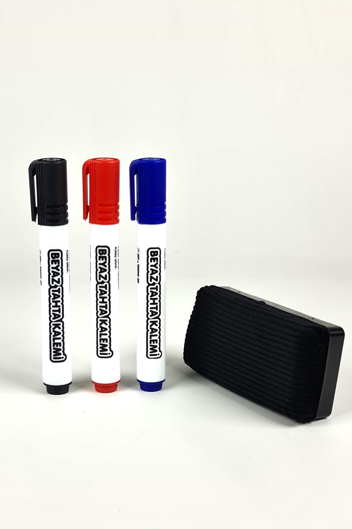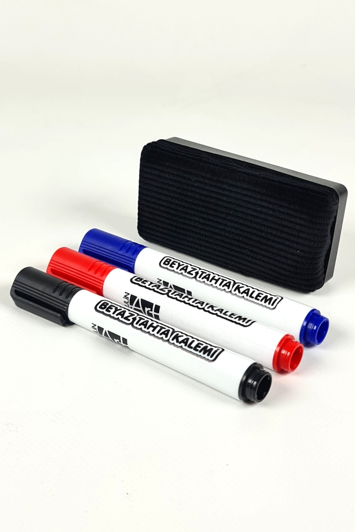 Üç adet tahta kalemi ve silgi içeren bu set, beyaz tahta üzerinde hızlı ve etkili notlar almanız için idealdir