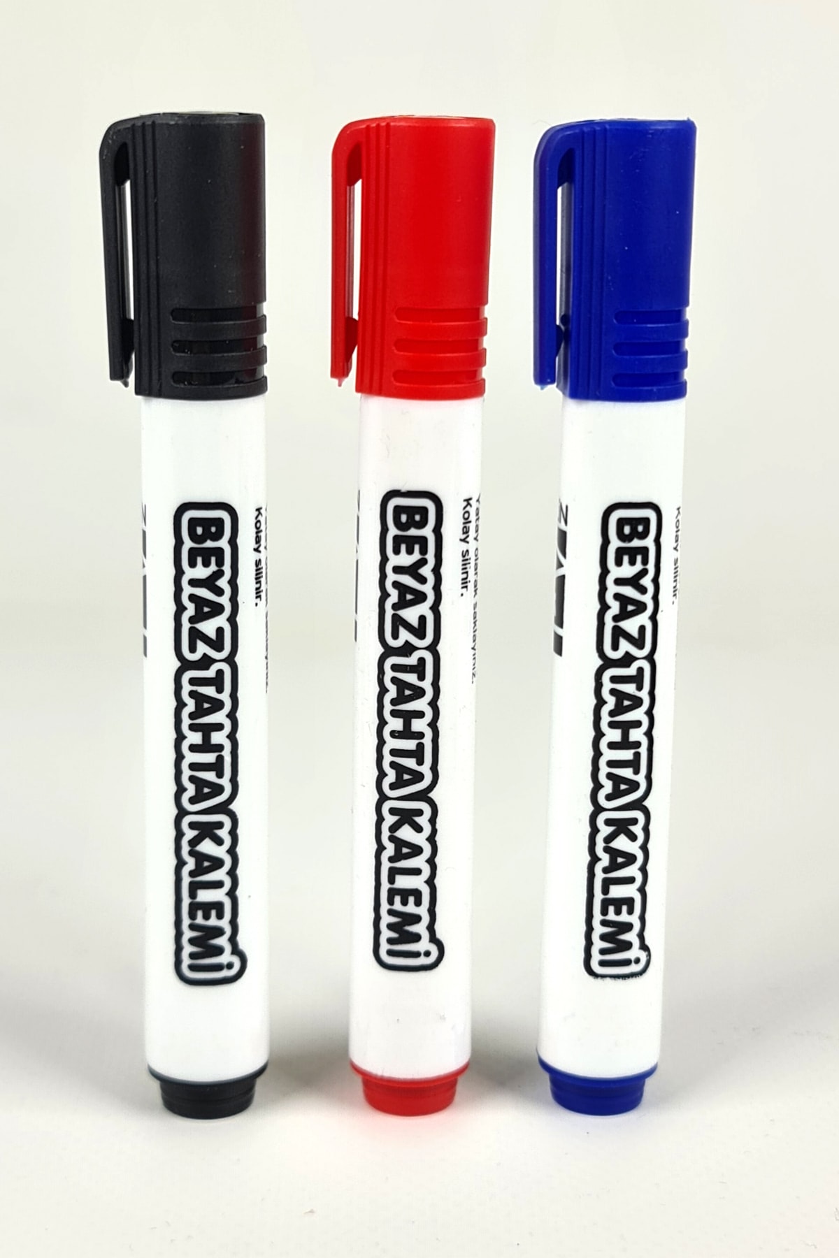 Renkli beyaz tahta kalemi seti, kırmızı, siyah ve mavi renk seçenekleriyle dikkat çeker ve farklı renklerle not almayı kolaylaştırır