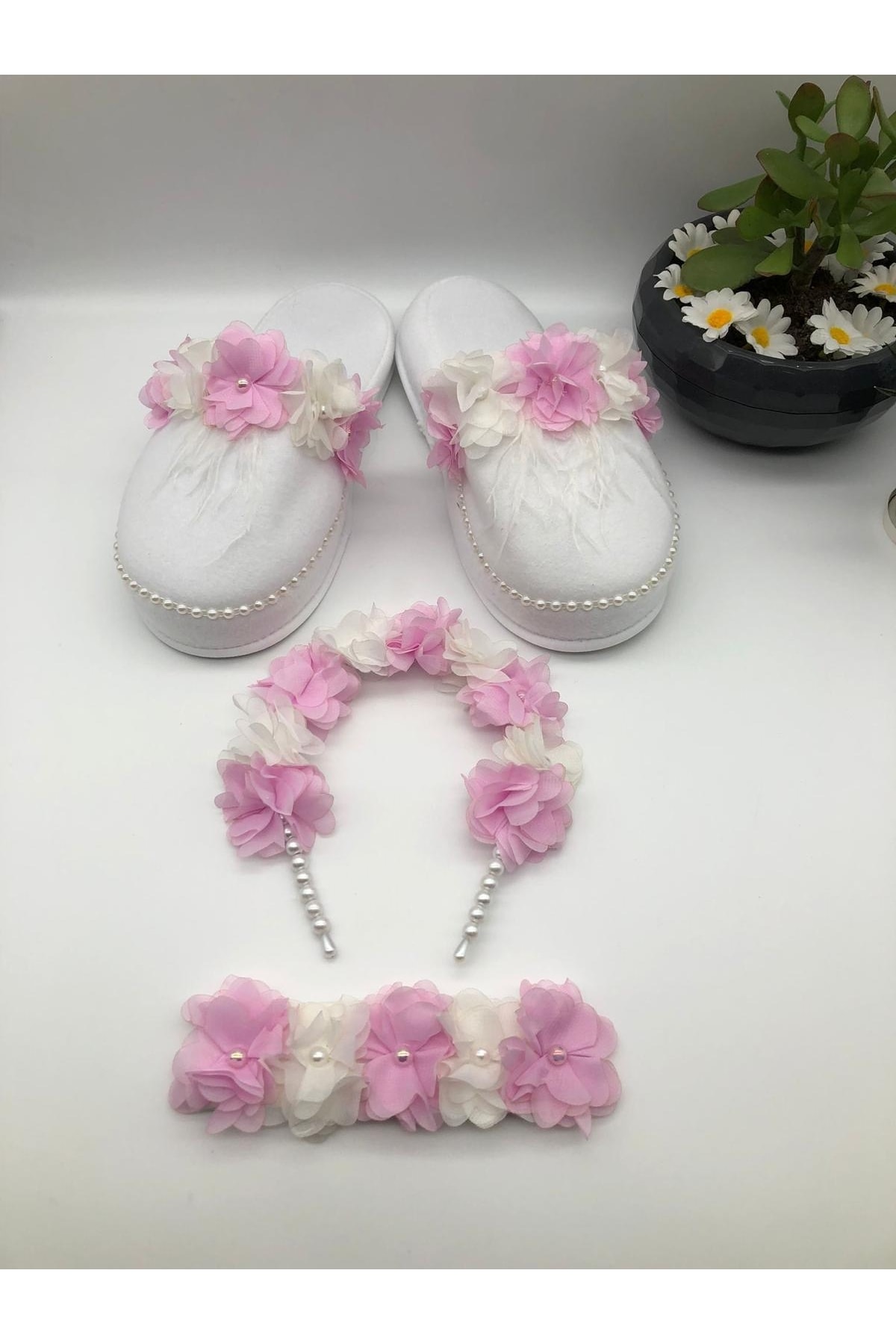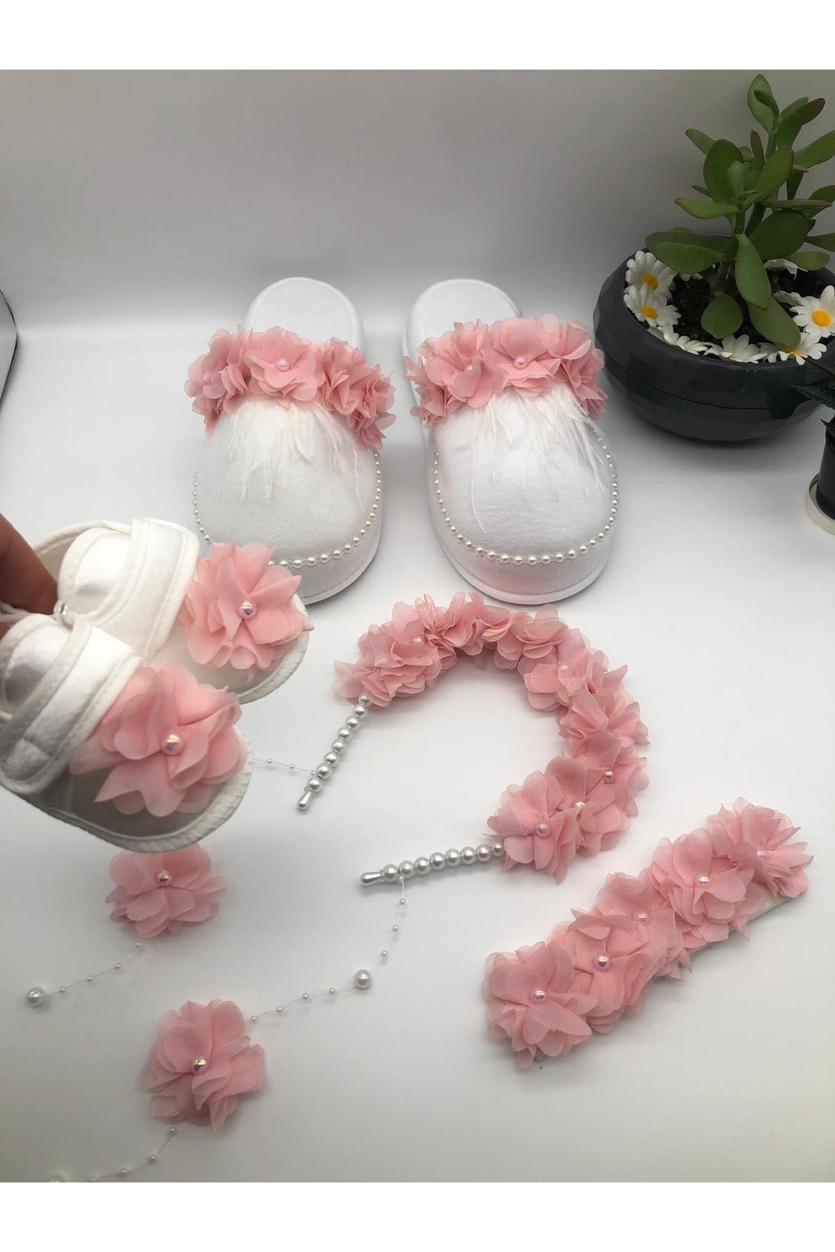Logusa Seti Pudra Pembesi Çiçekli Loğusa Seti Taç Terlik Bandana Patik Seti