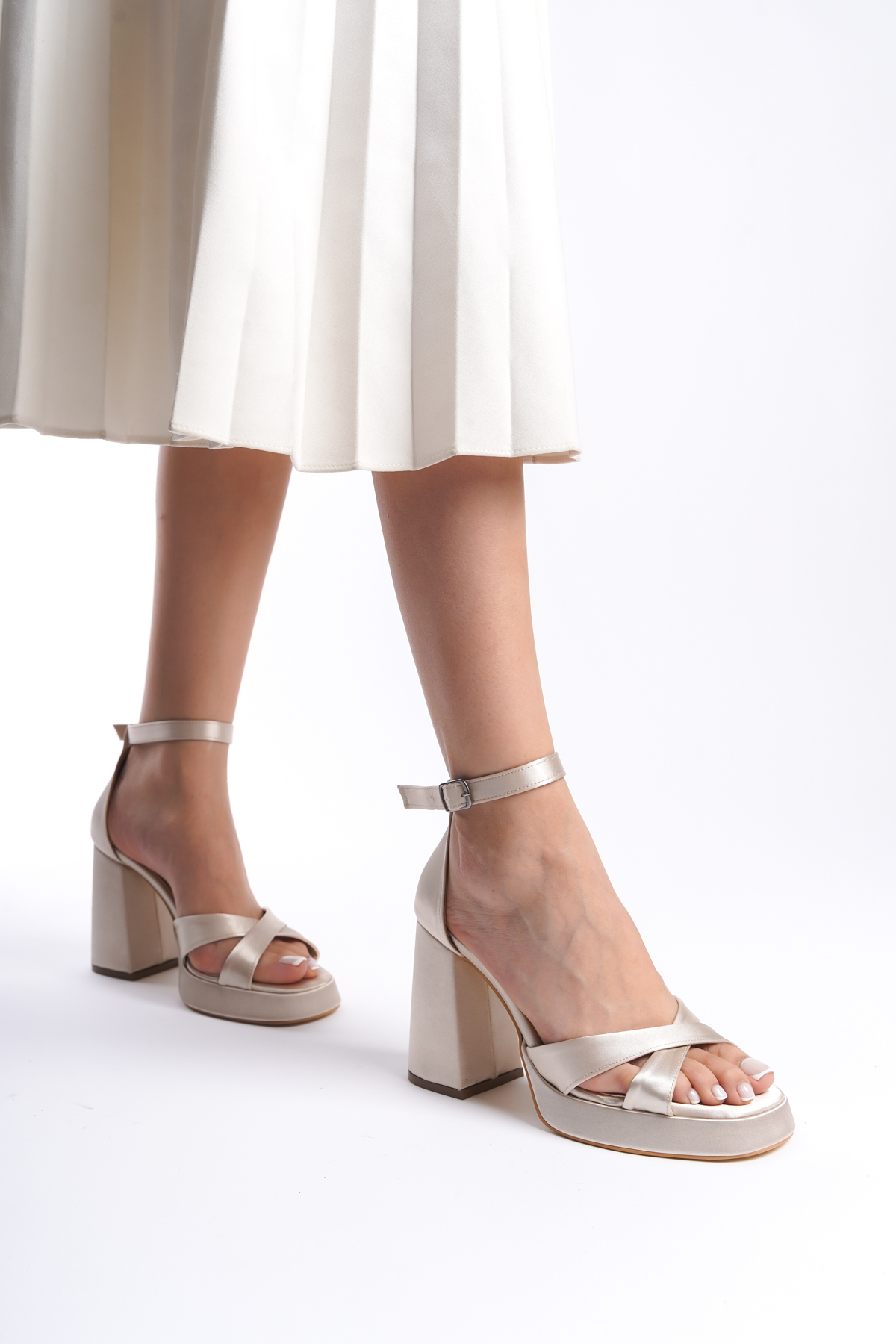 Saten materyali ile zarif bir görünüm sunan bu topuklu ayakkabı, şıklığınızı ön plana çıkarır