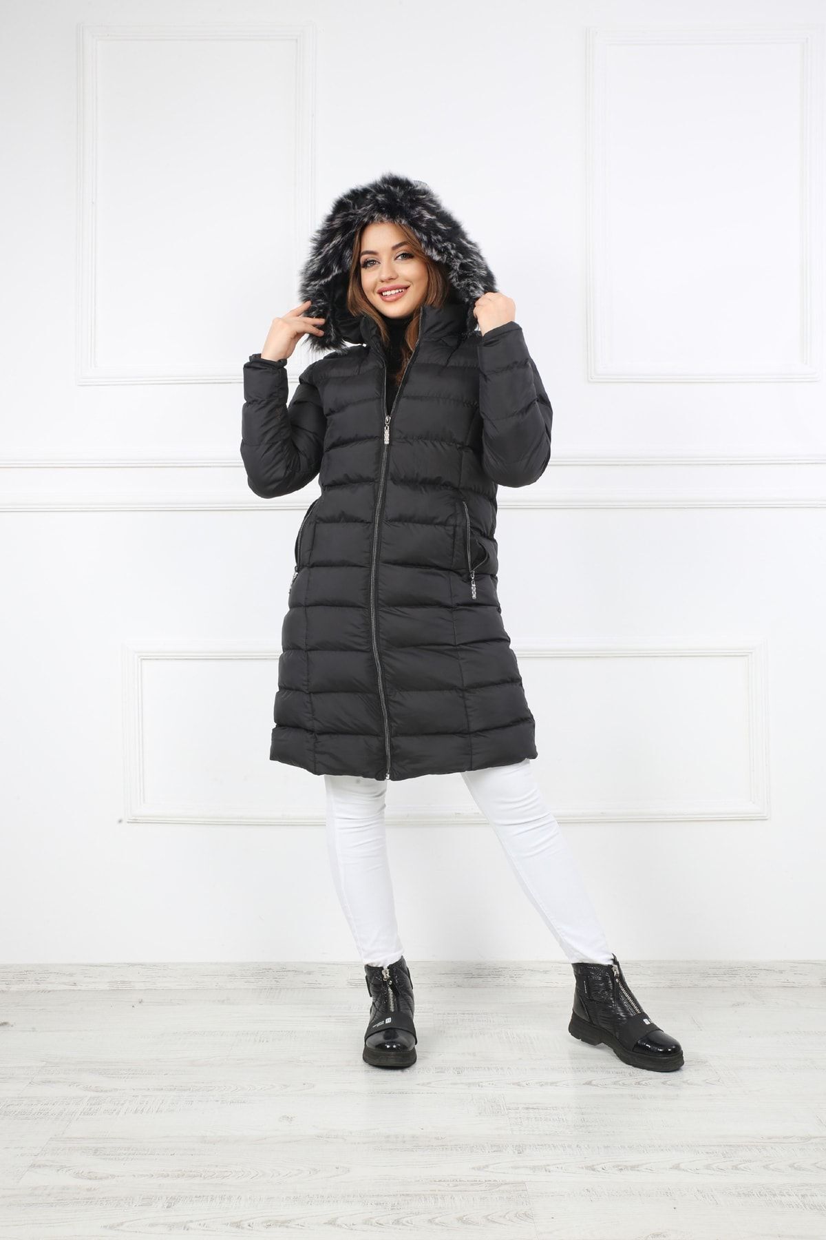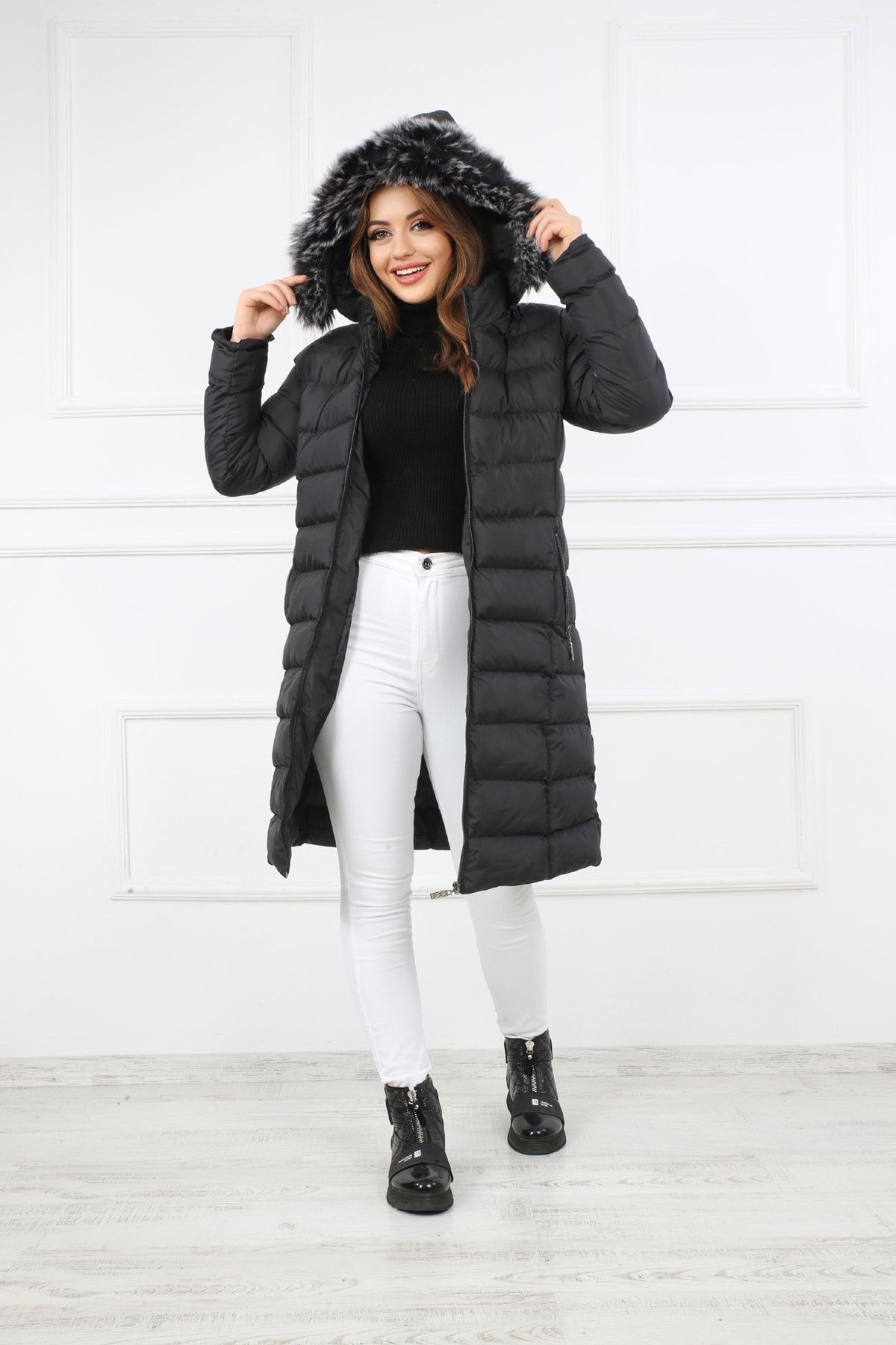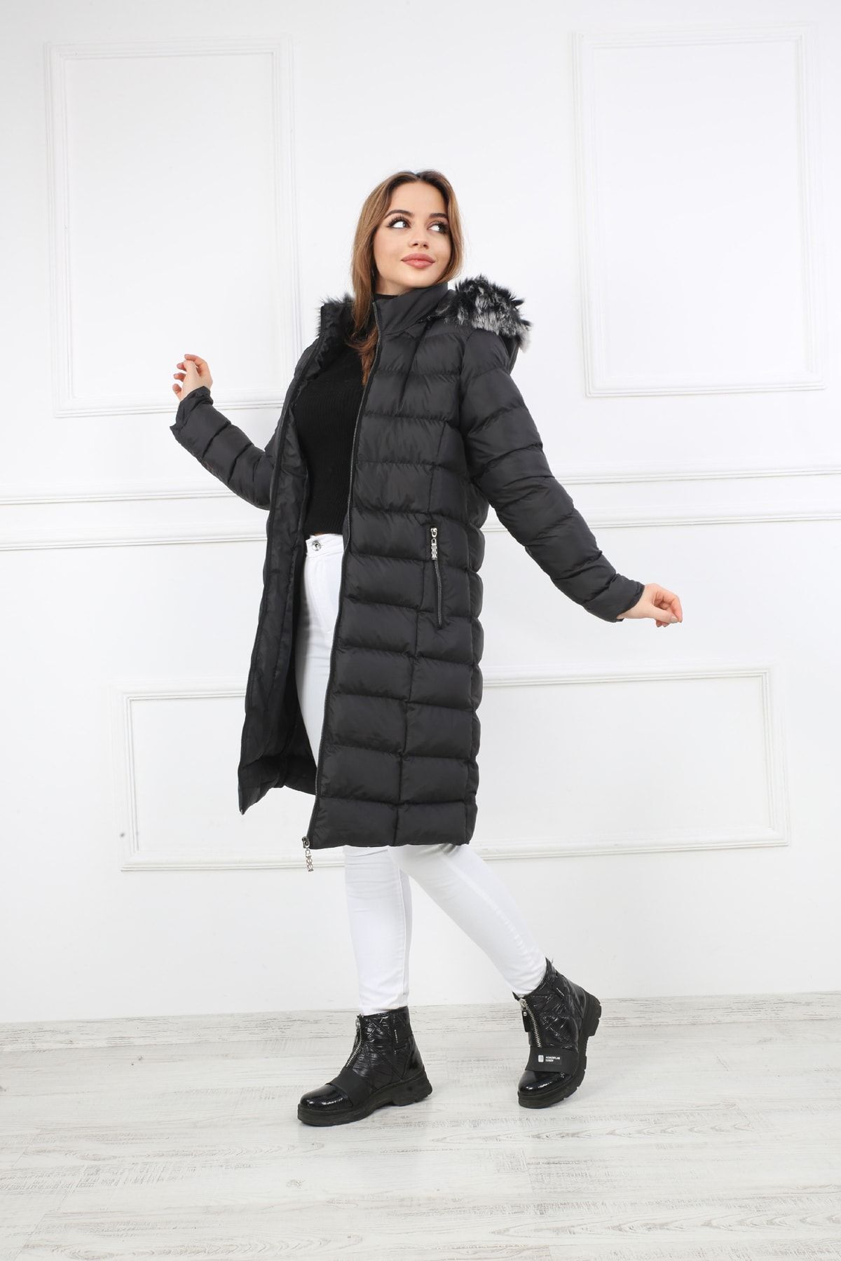 - Kalın yapısı ile soğuk havalarda sıcak tutan ve konforlu bir kullanım sunan siyah şişme mont kaban