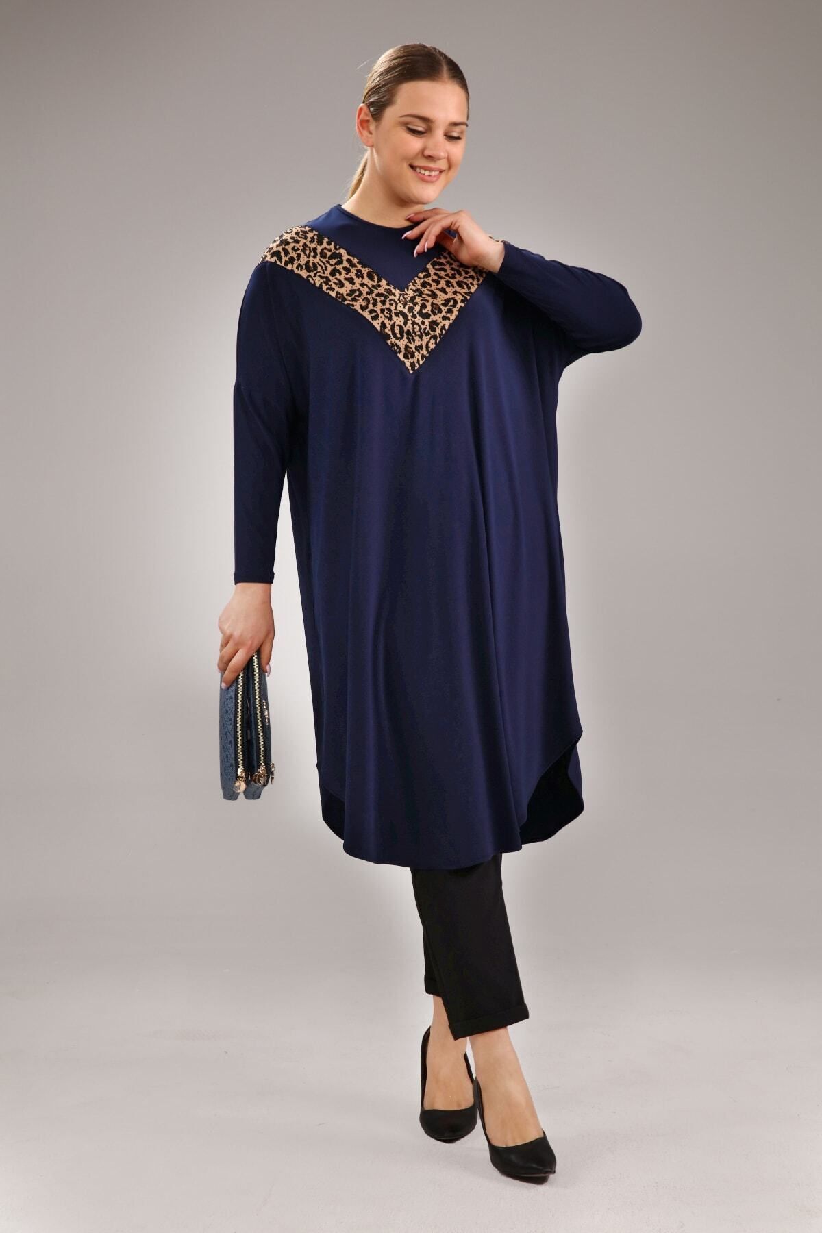 Kadin Buyuk Beden TunikYarasa Kol ve Pulpayetli Tunik Ürünümüz Lacivert, Leopar, Lacivert Leopar, Siyah ve Mürdüm Renktedir..