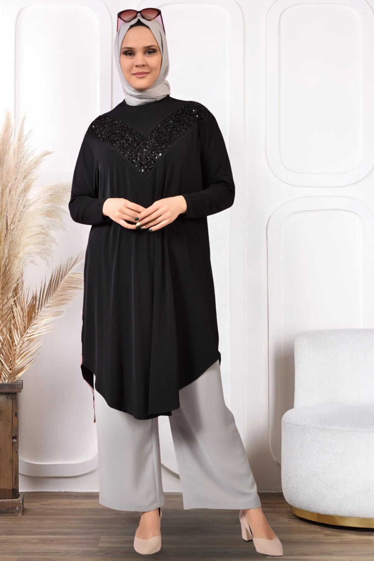 Siyah Kadin Buyuk Beden TunikModelimizin Üst Kısmı Pulpayet İşlemelidir