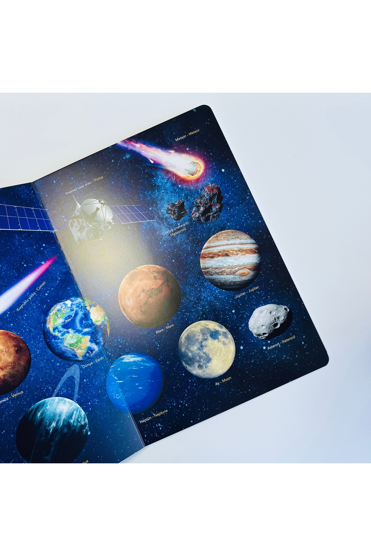 Güneş Sistemini gezegenleri yıldızları yakından tanımak ister misin? Peki yıldız sistemindeki birbirinden ilginç gök cisimlerinin isimlerini öğrenmek eğlenceli olmaz mı? Dünya'dan uzayı gözlemlemek uzay üssünde çalışan bir bilim insanı olmak ve hatta astronot olup uzaya gitmek ne kadar heyecan vericidir ne dersin? Bu soruların cevapları ve Uzayla ilgili görseller İngilizce karşılıklarıyla birlikte bu kitapta! İngilizce destekli
