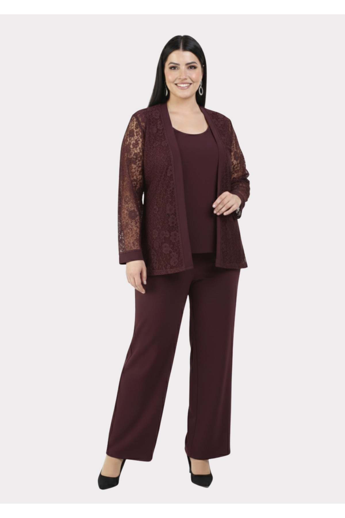 Büyük Beden Lacivert Renkli Dantel Ceketli Abiye Pantolon Bluz Takım