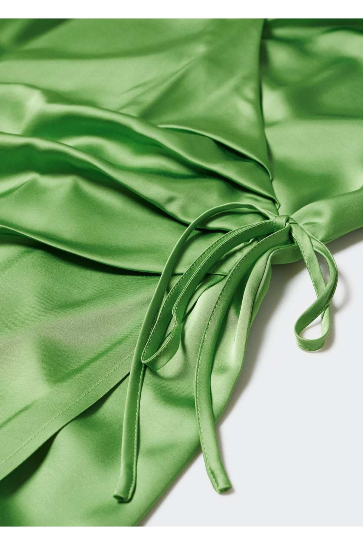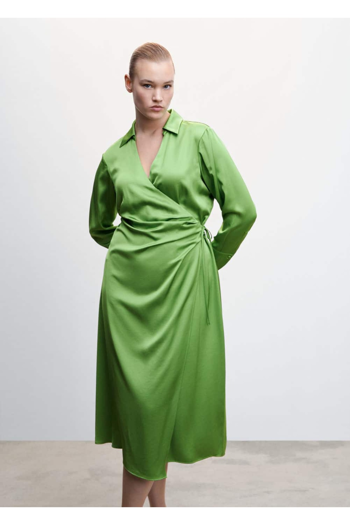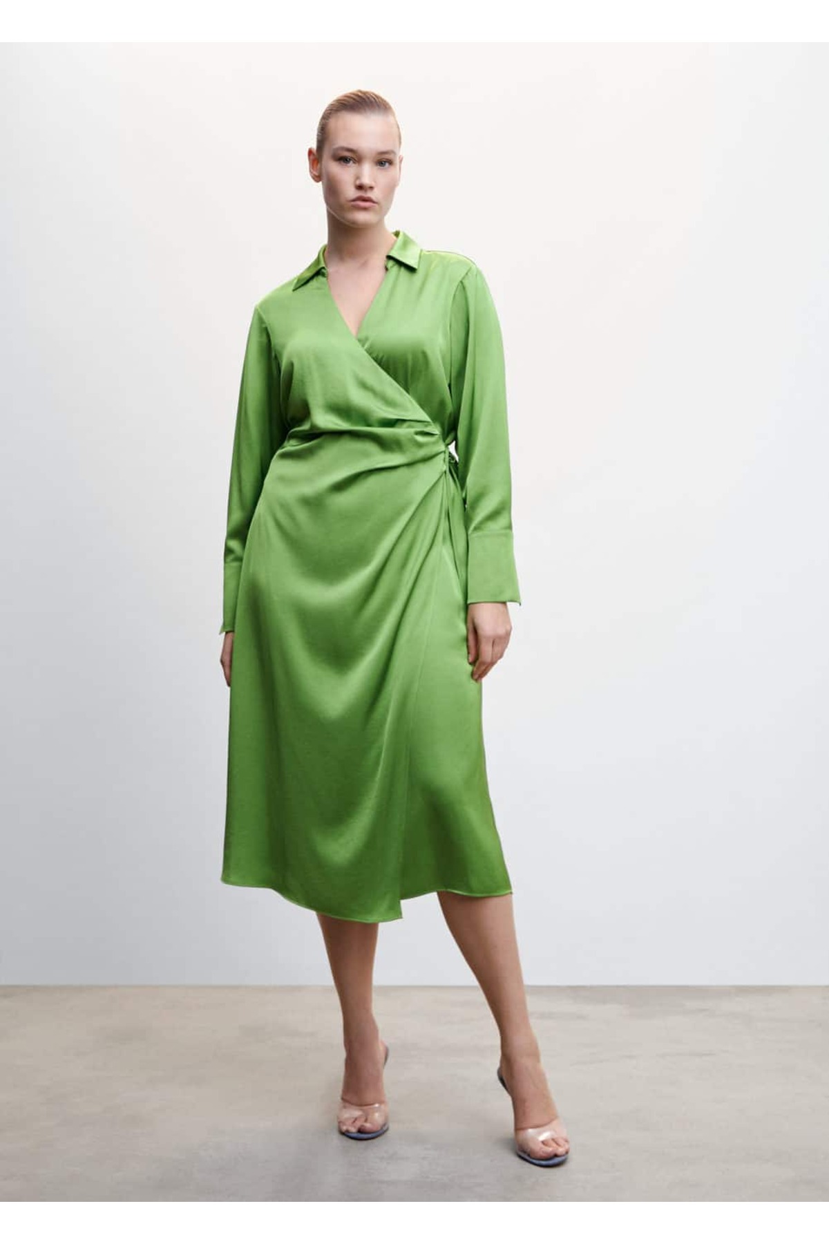 Dökümlü kumaş, Saten kumaş, Uzun model, Anvelop model, Gömlek tarzı V kesim yaka, Uzun kollu ve manşetleri düğmeli, Yandan fiyonk kapamalı, Astarlı, Drape detaylı, Büyük Beden Mevcuttur, Parti ve özel günler koleksiyonu, Geri dönüştürülmüş polyester, yeni kumaş üretmek için kullanılan polyester tekstil atıklarından, deniz atıklarından veya plastik PET şişelerden elde edilmektedir.