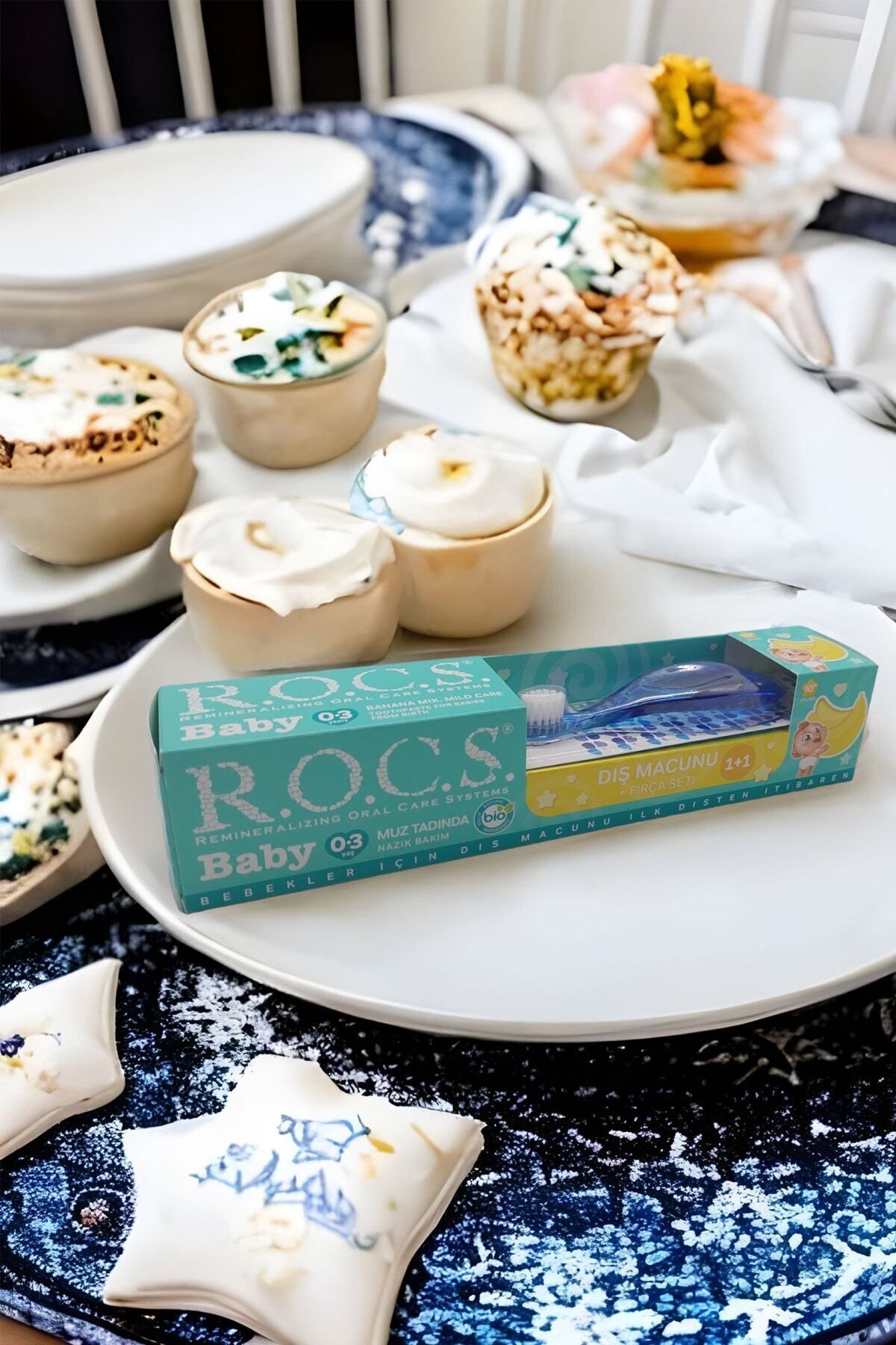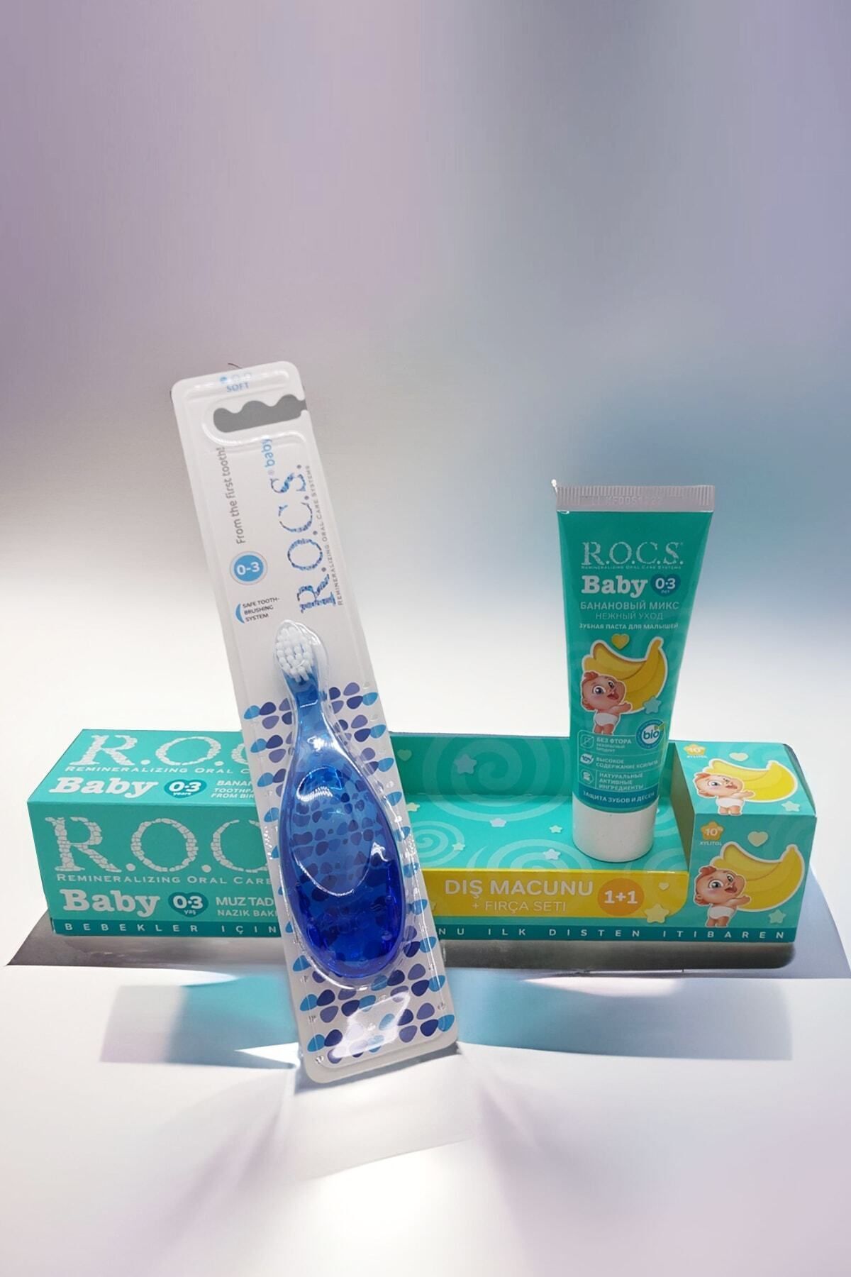 Rocs Baby 0-3 Yaş Muz Püresi Tadında Diş Macunu 45g + Diş Fırçası Seti · ROCS Baby 0-3 Yaş Muz Tadında Diş Macunu MAVİ renkli bebek diş fırçası ile avantajlı fiyata set olarak sunuluyor.