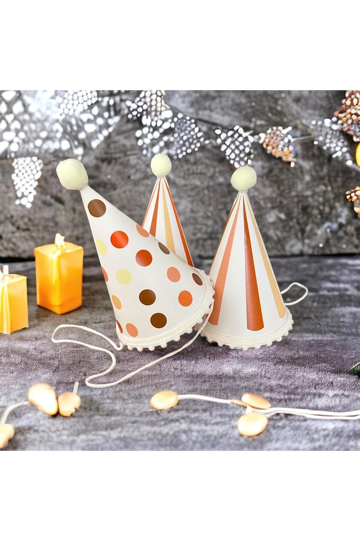 Krem karamel retro renkleriyle dikkat çeken parti şapkası, renkli ve eğlenceli bir görünüm sunar