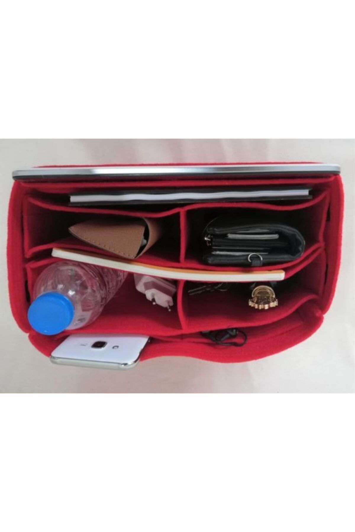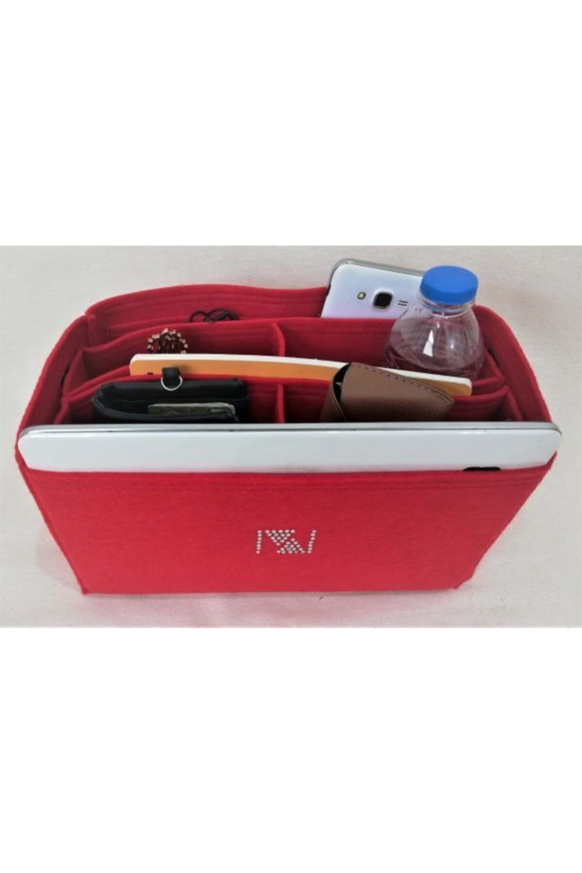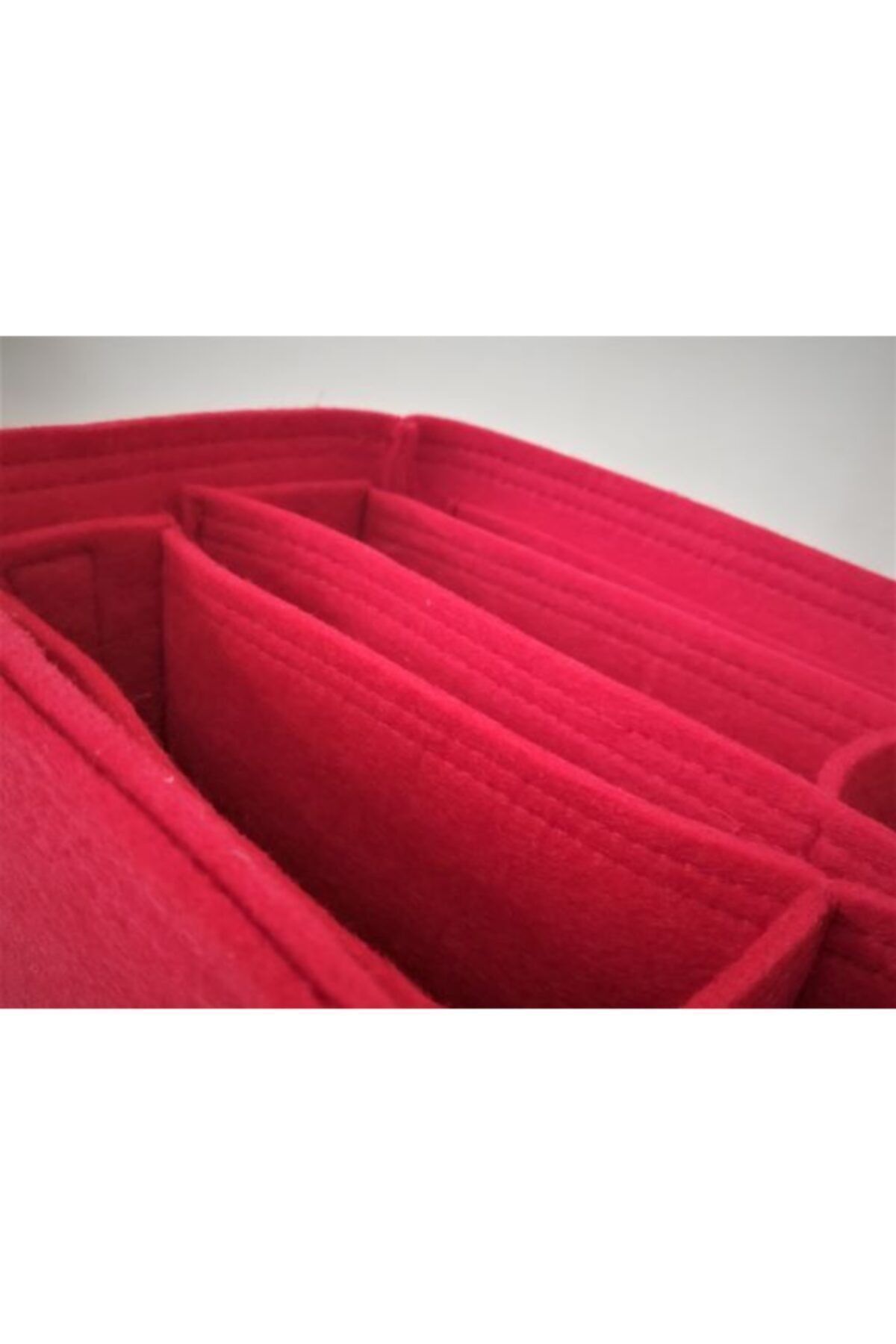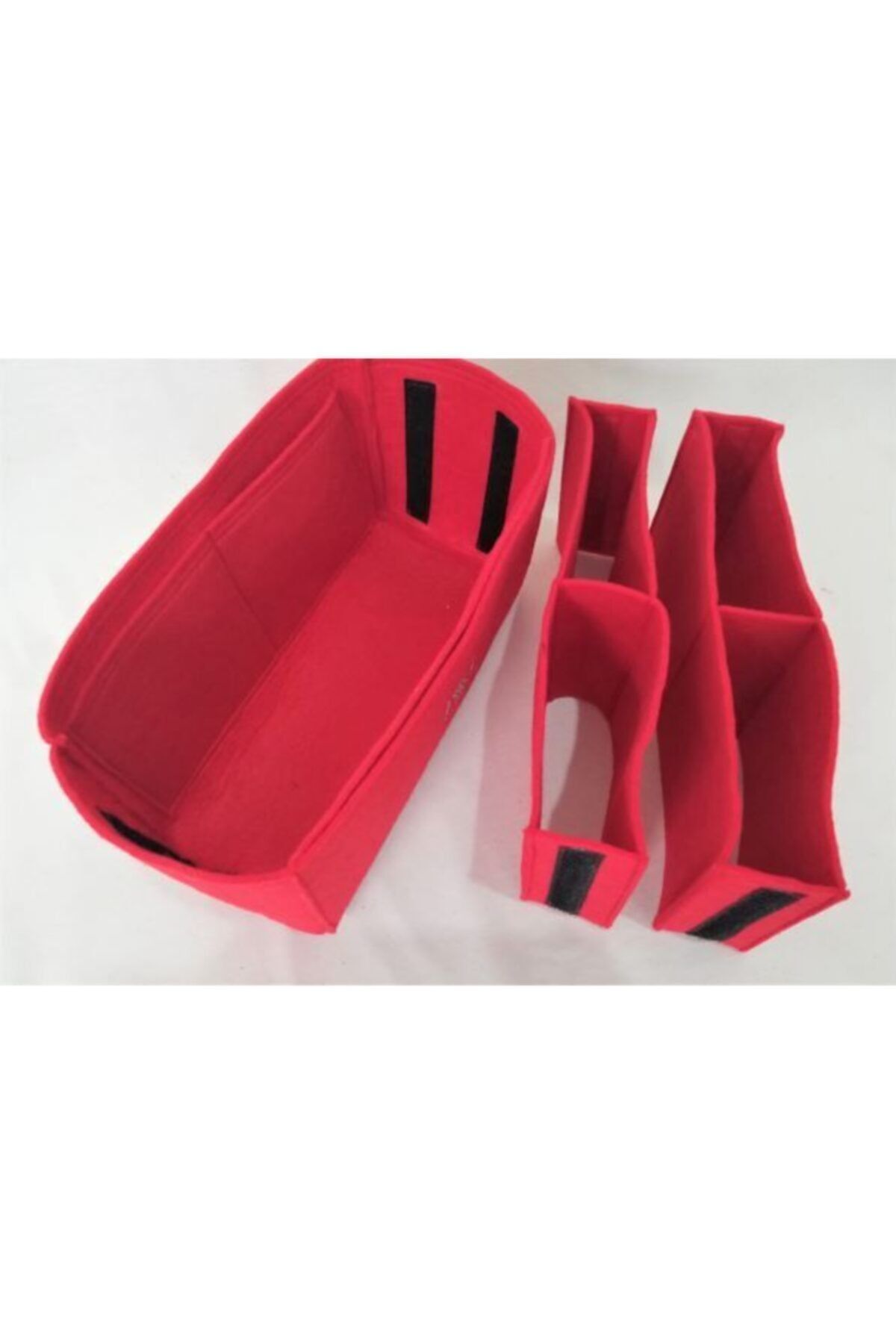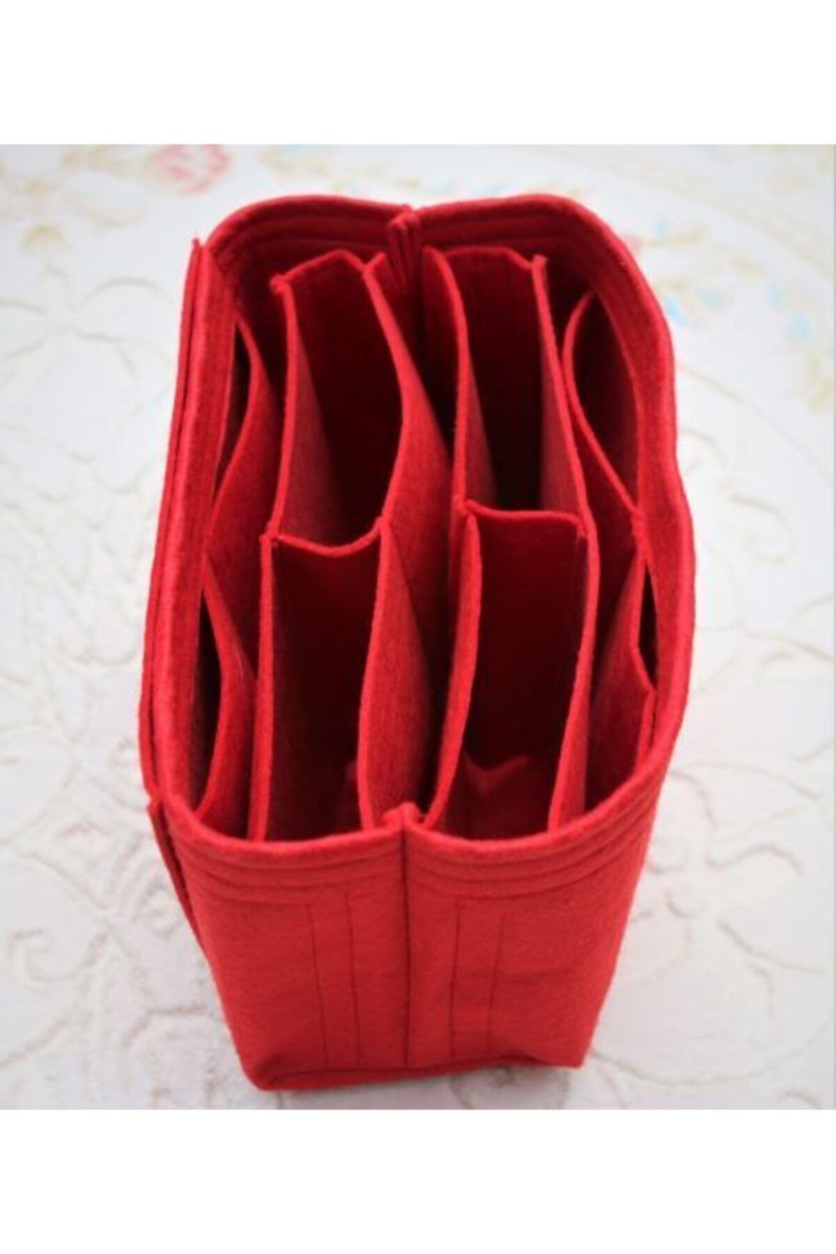 ,4 adet ic cep ,4 adet gozden olusan cikarilabilenorta bolme ,disinda 1 adet buyuk cepten olusan 28 cm uzunlukda ,15 cm yuksekliginde , 12 cm genisliginde olan kırmızı renk keçe organızer.
