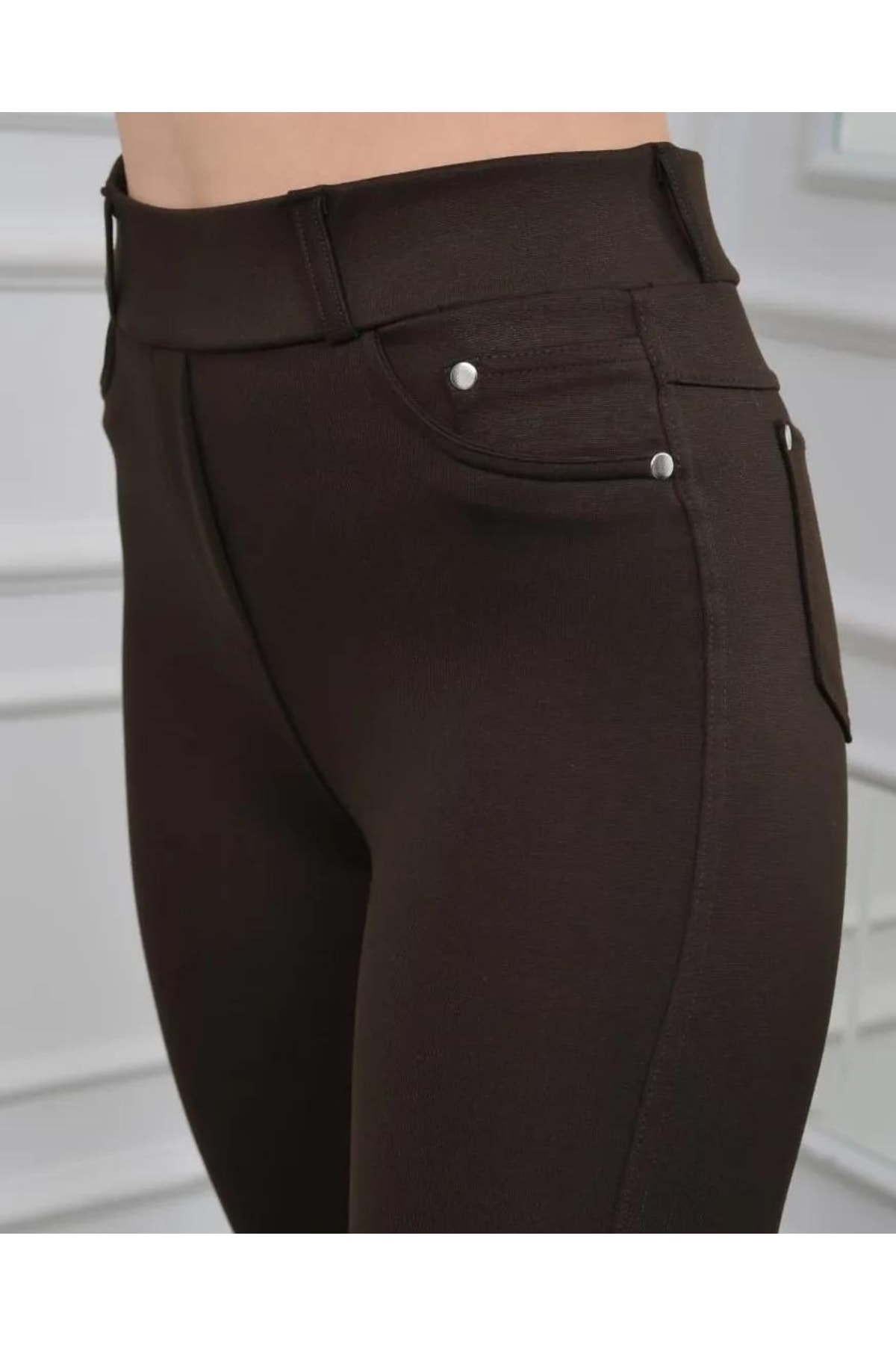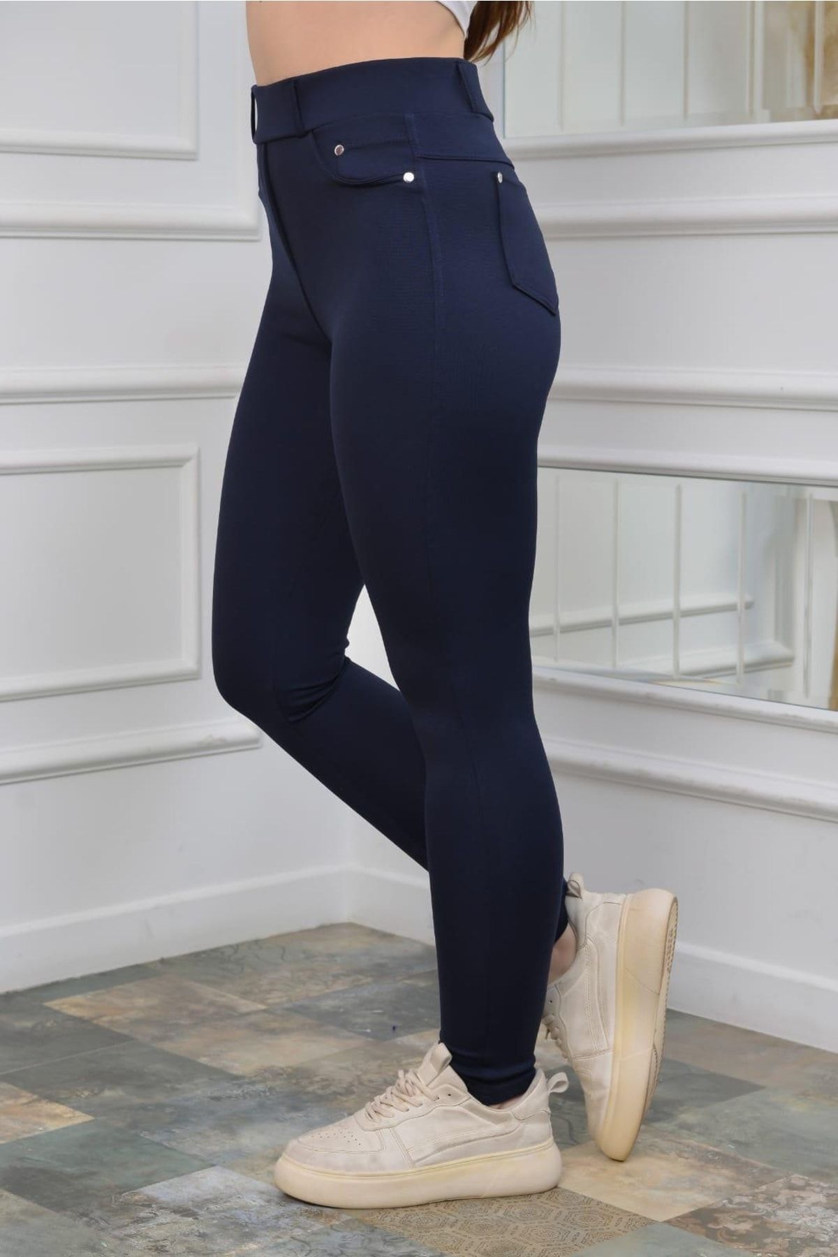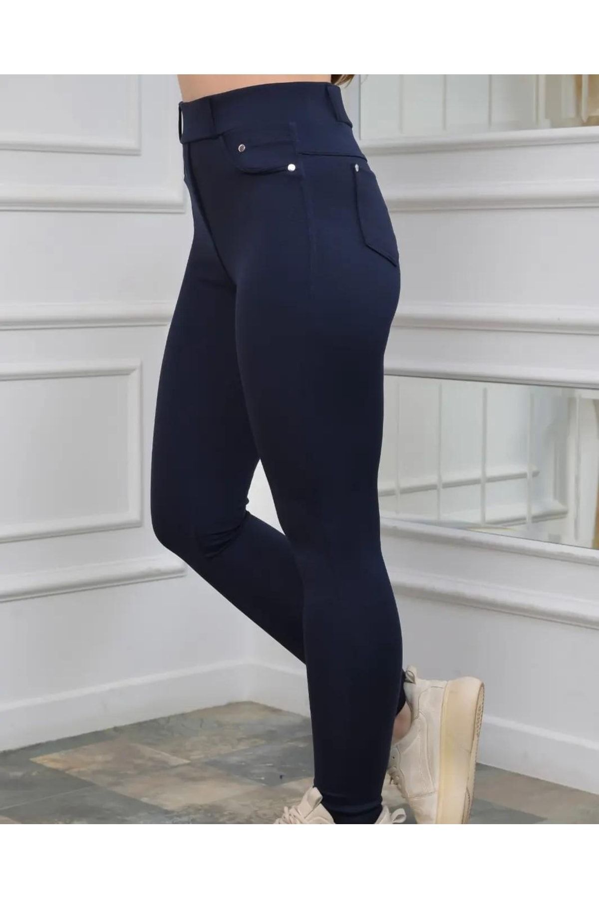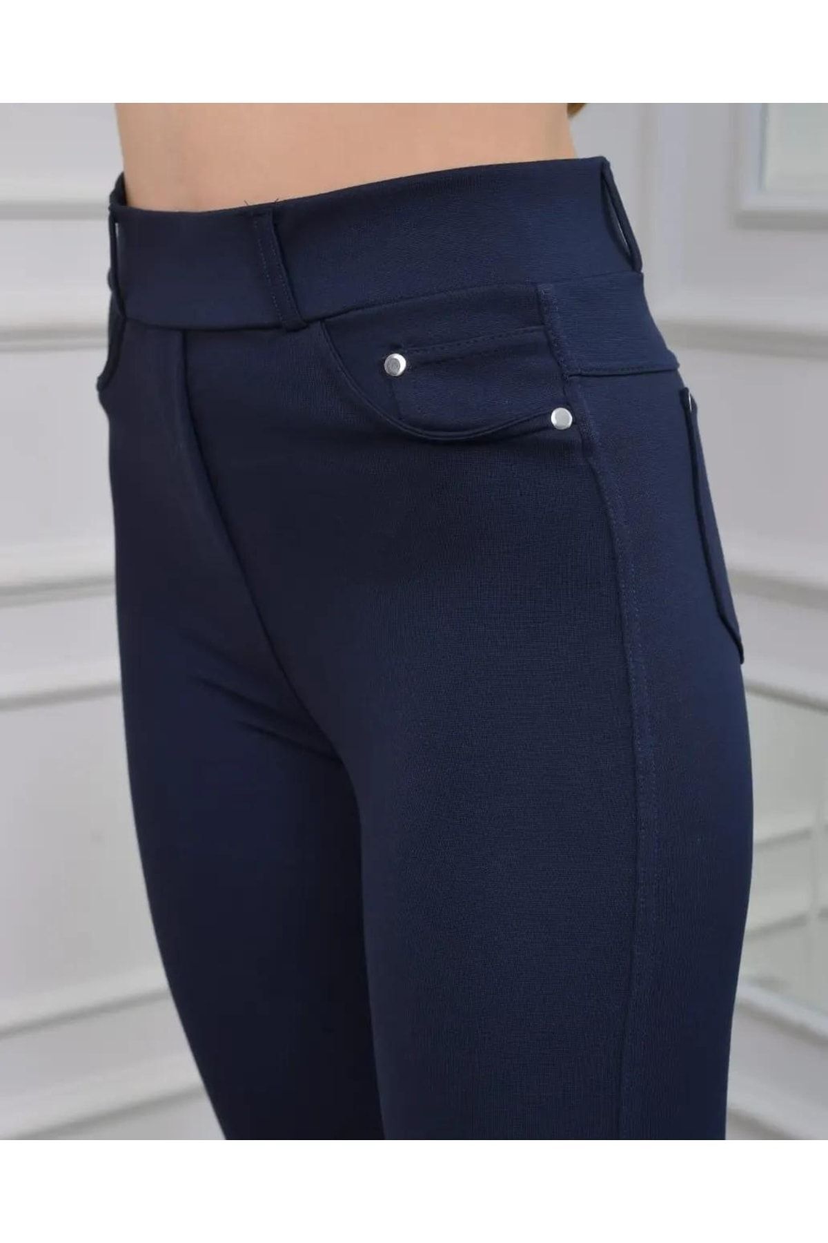 - Lacivert rengiyle şıklığı ve rahatlığı bir arada sunan çelik kumaş cepli tayt modeli, günlük kullanım için idealdir.