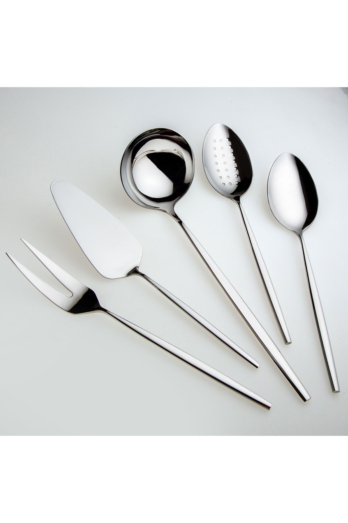 Parçaların her birinin birinci sınıf çelik malzemeden imal edilmiş olduğu bu set içinde bir adet servis kaşığı, servis kevgiri, servis kepçesi, servis çatalı ve servis spatulası bulunuyor.