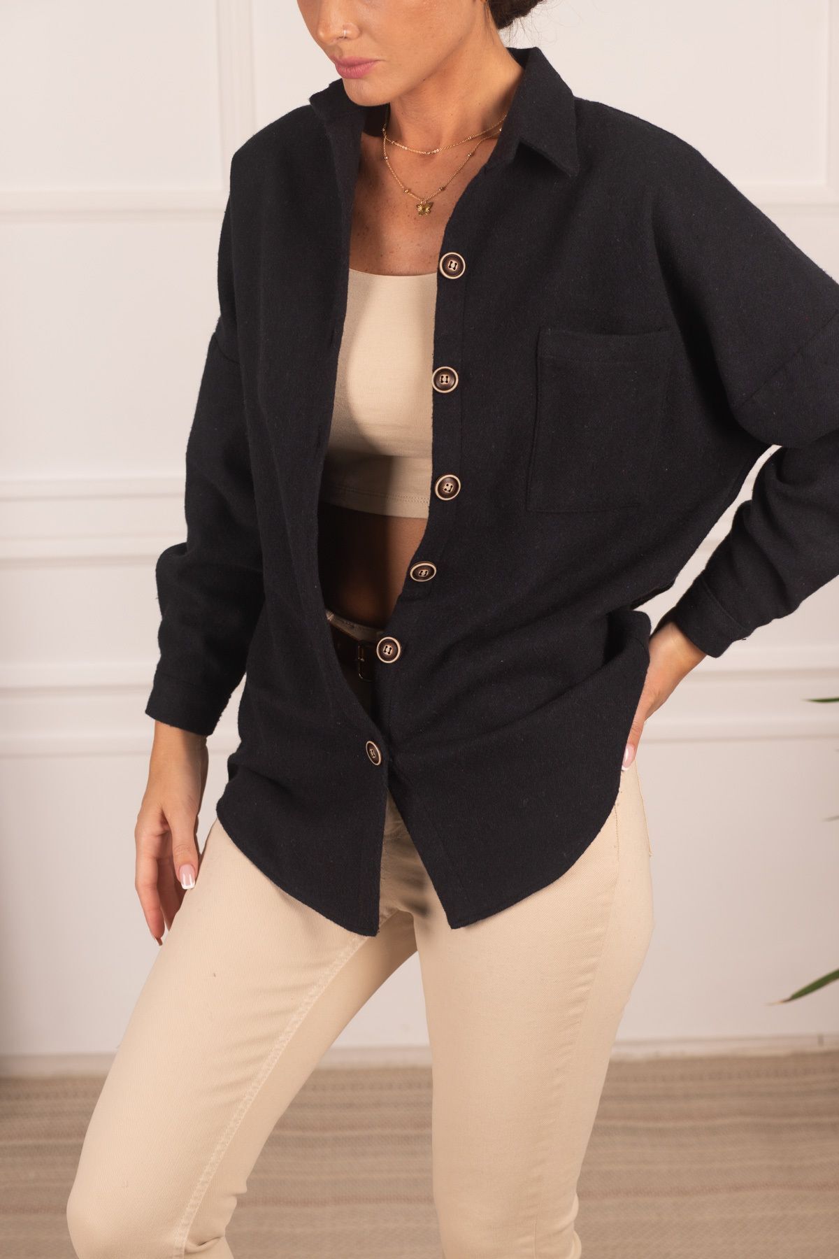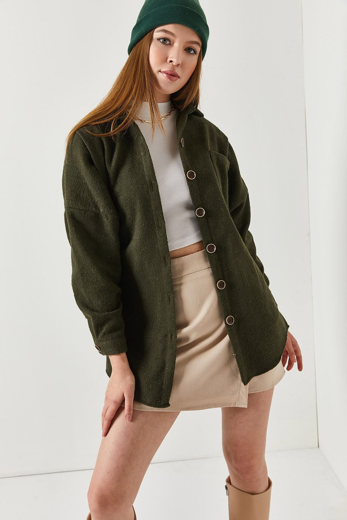 Kadın Açık Kahve Oversize Kaşe Cepli Gömlek Arm-22y001156