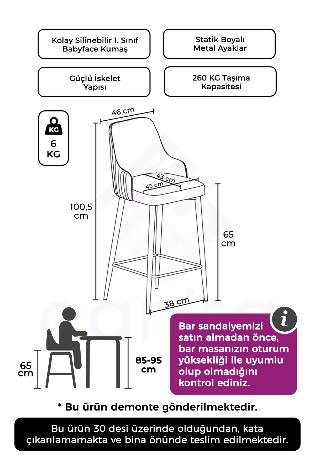 Oturma yüksekliği 65 cm mutfak bar sandalyeleri toplam yüksekliği 100.5 cm olması yüksek tezgah ve masa alanlarında kullanılabilir.