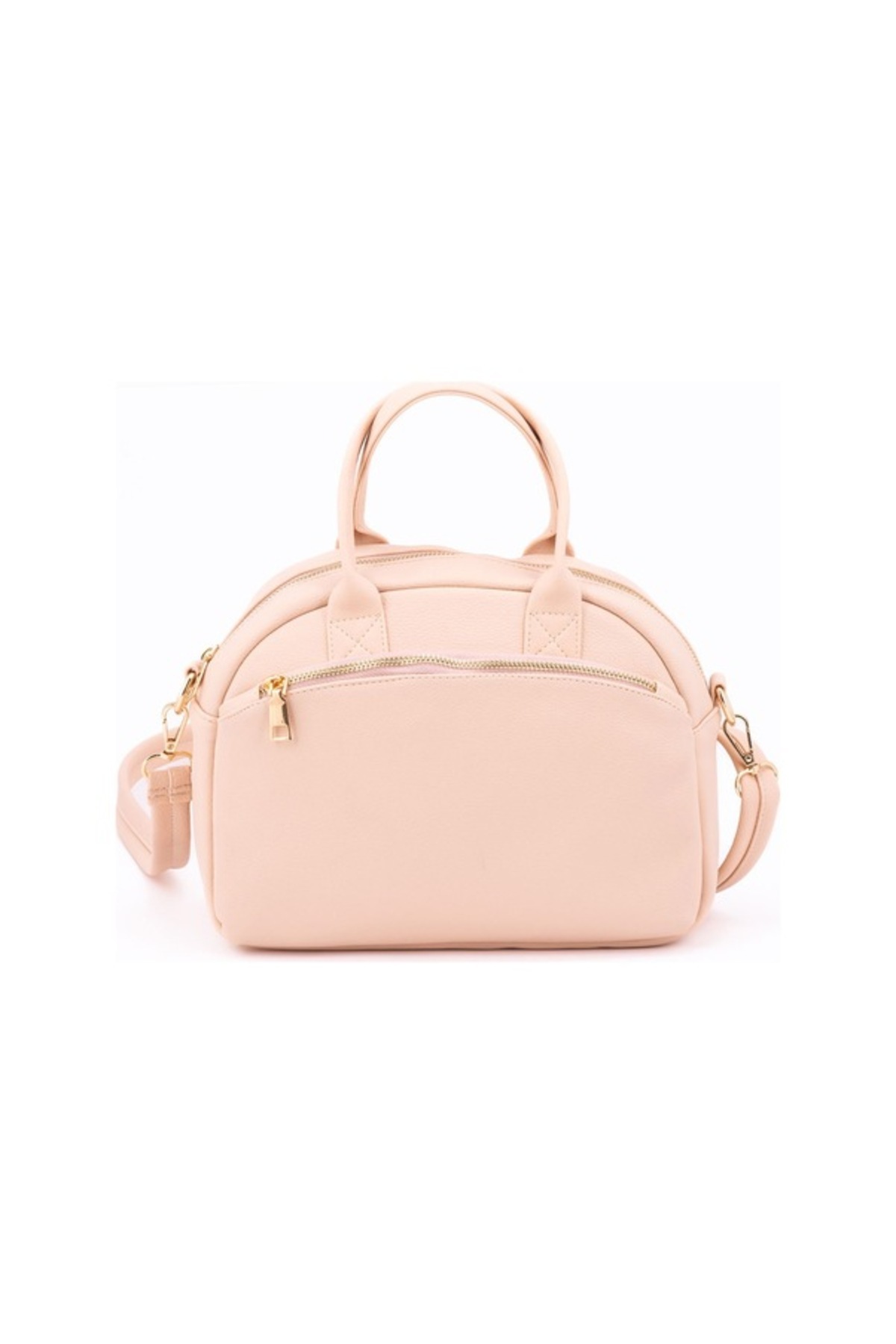 Bu şık yemek çantası, altın rengi metalik donanımı ve fermuarları ile modern bir tasarıma sahiptir.