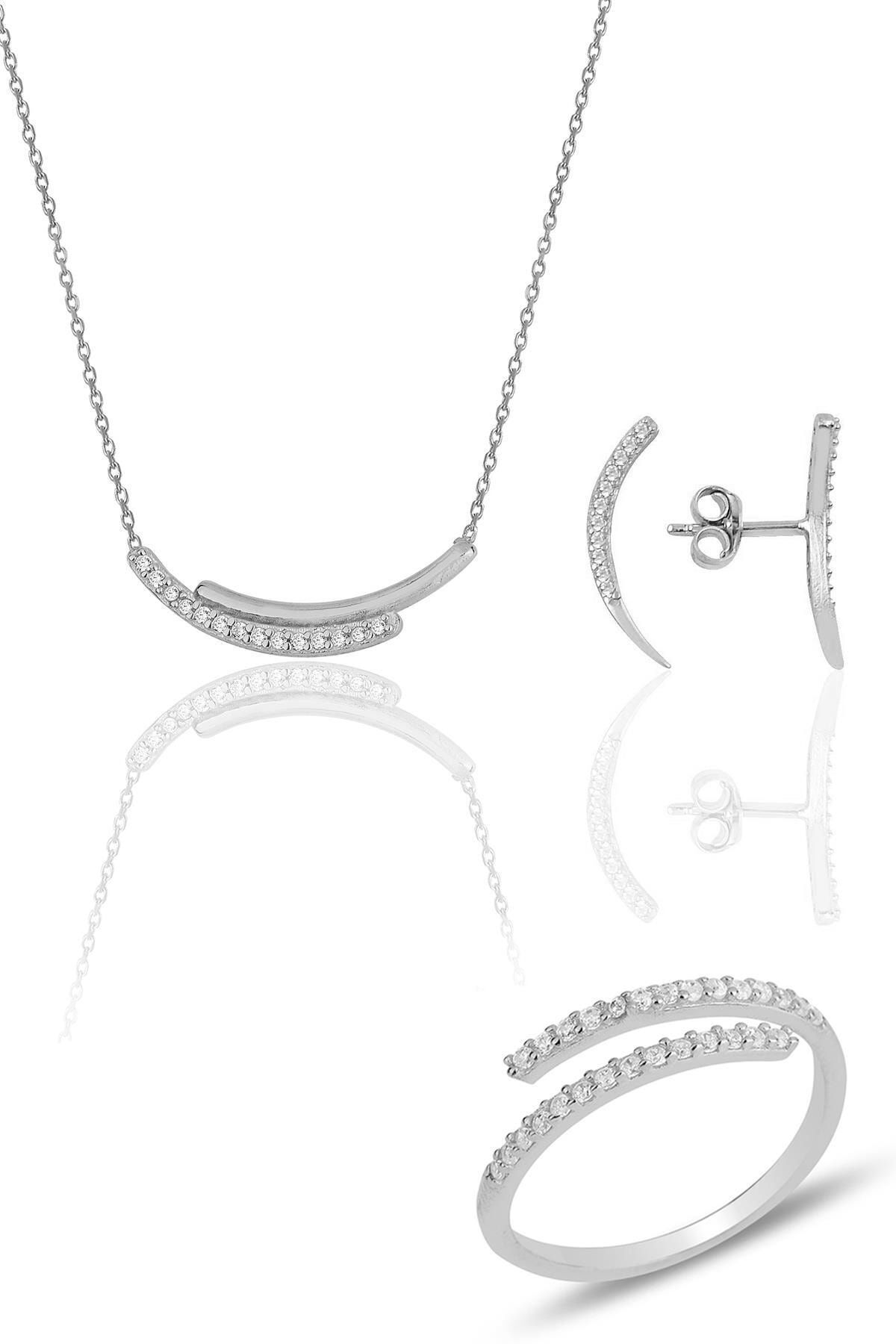 925 ayar gümüş rodyumlu zirkon sıra taşlı kolye küpe ve yüzük üçlü set.