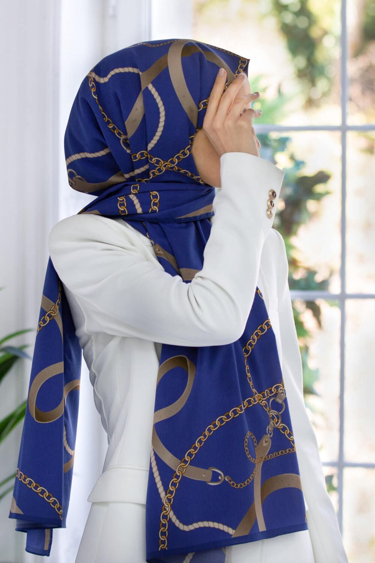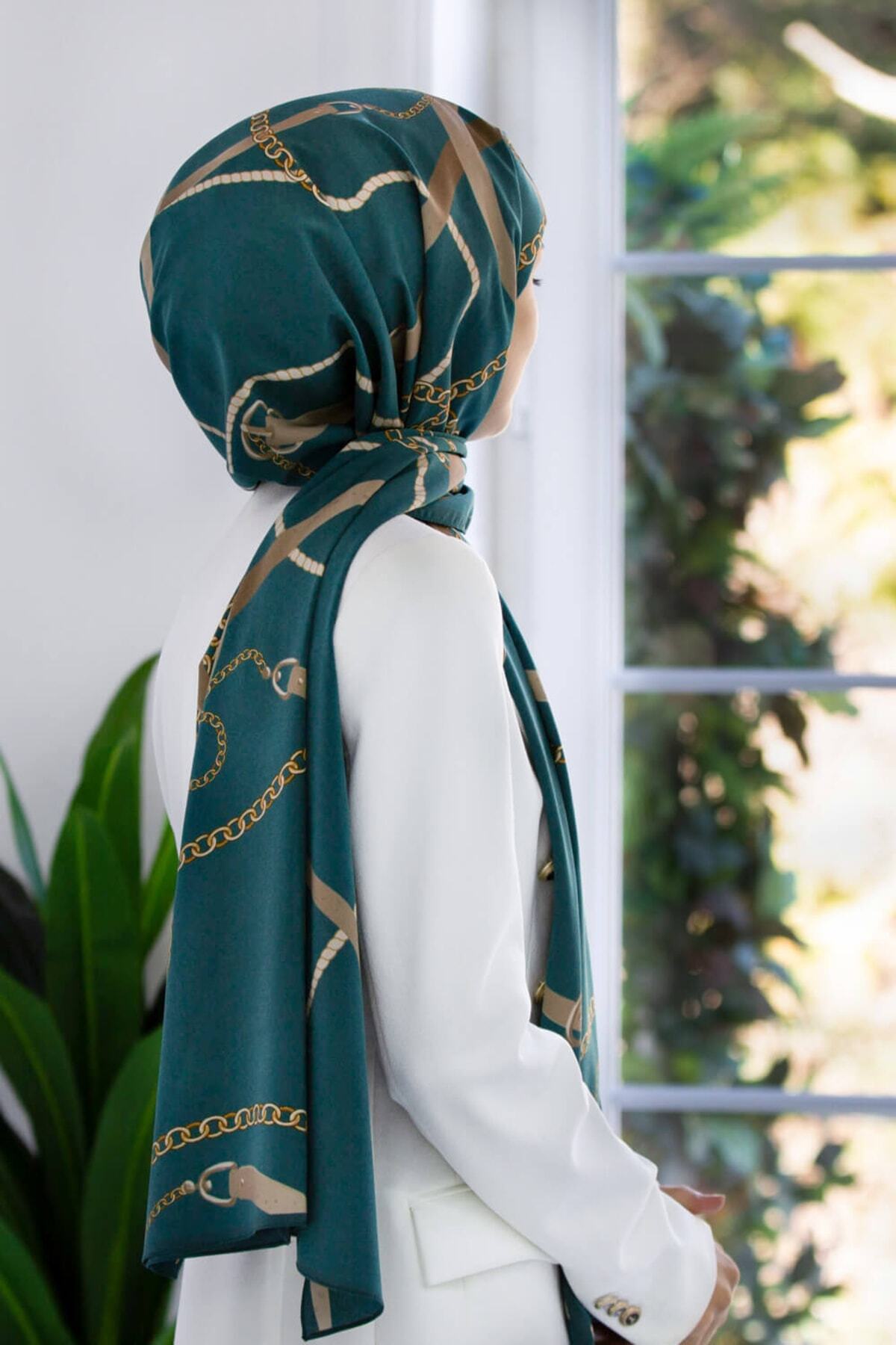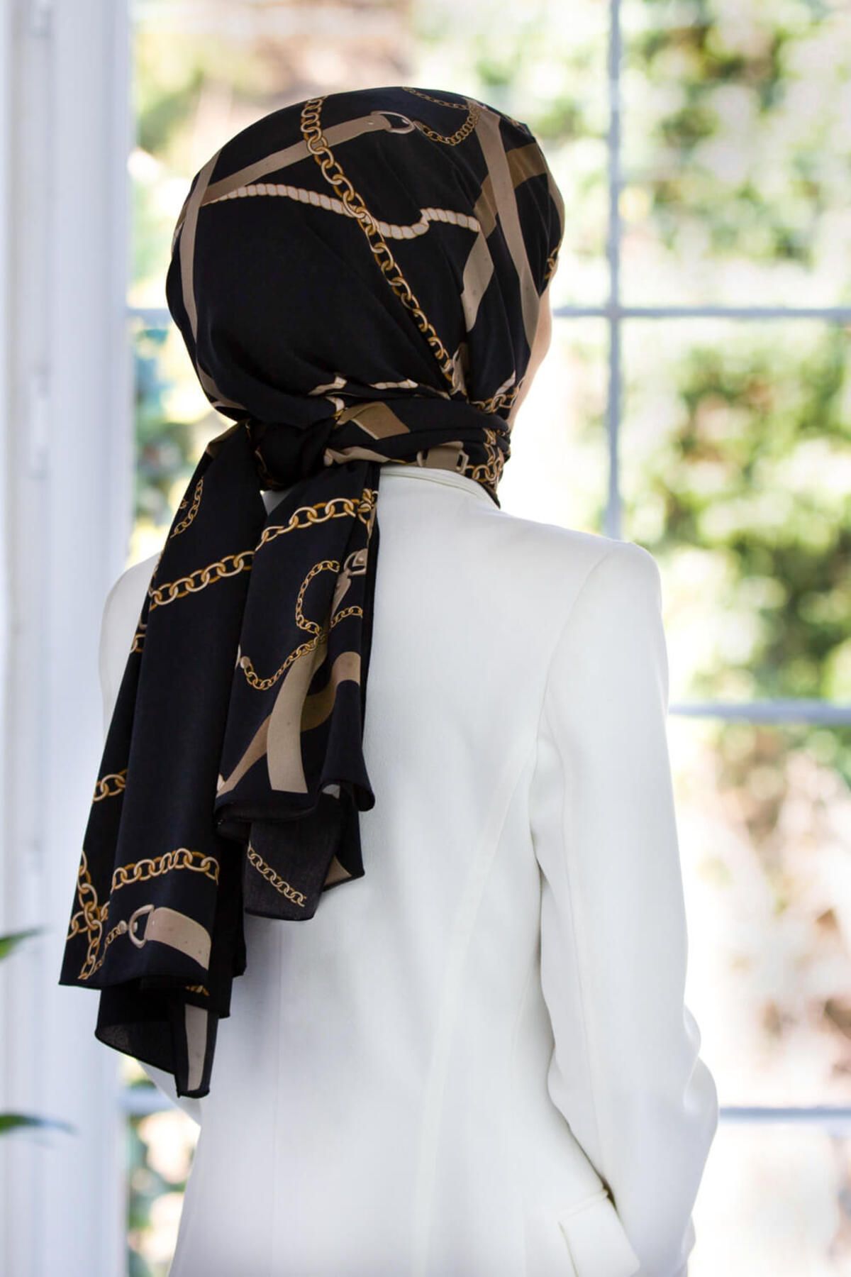 Lüks Medine Ipeği Zincirli Kemer Desenli Siyah Renkli 75x195 Kırışmaz Şal Moss Krep Dikiş Tipi Italy