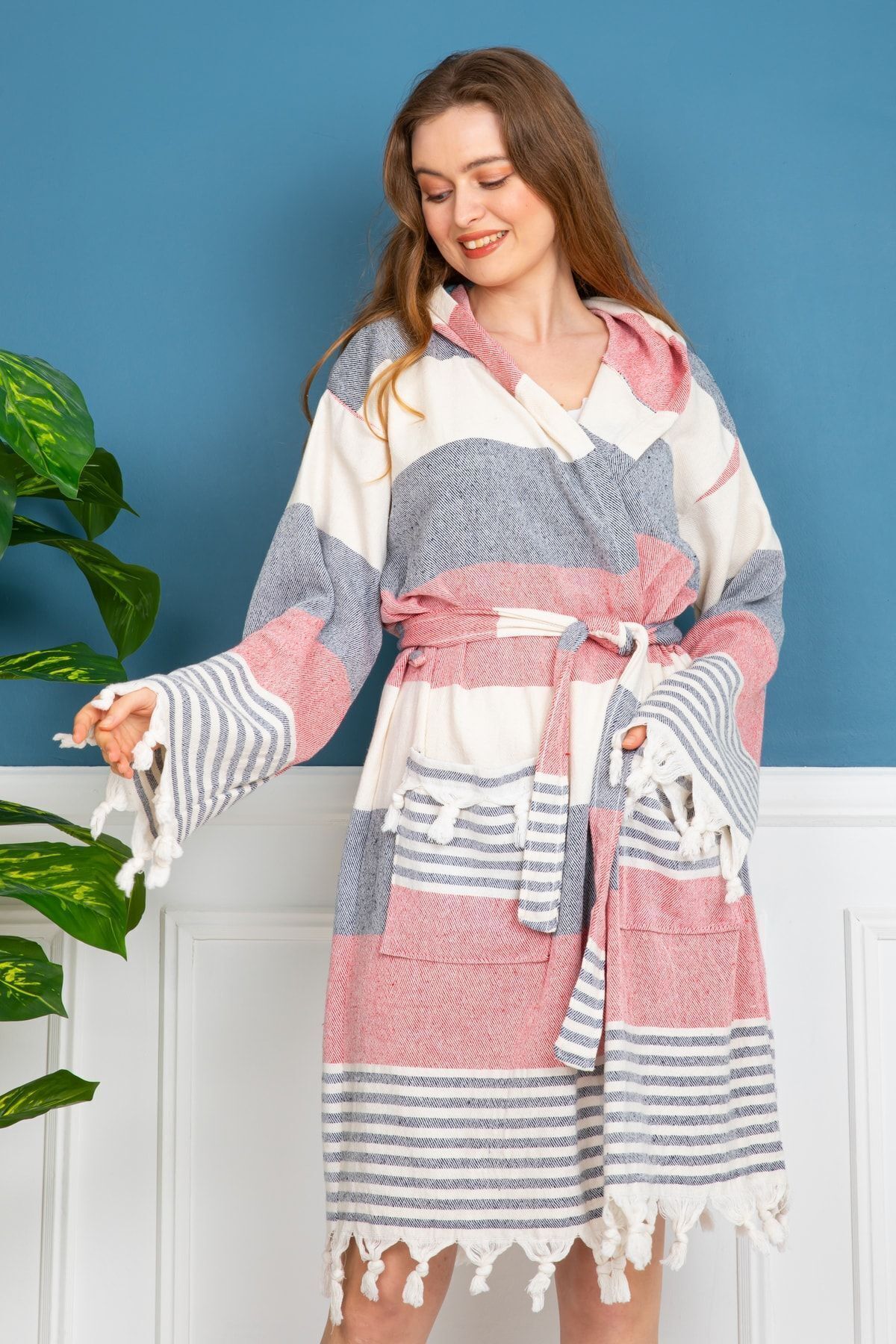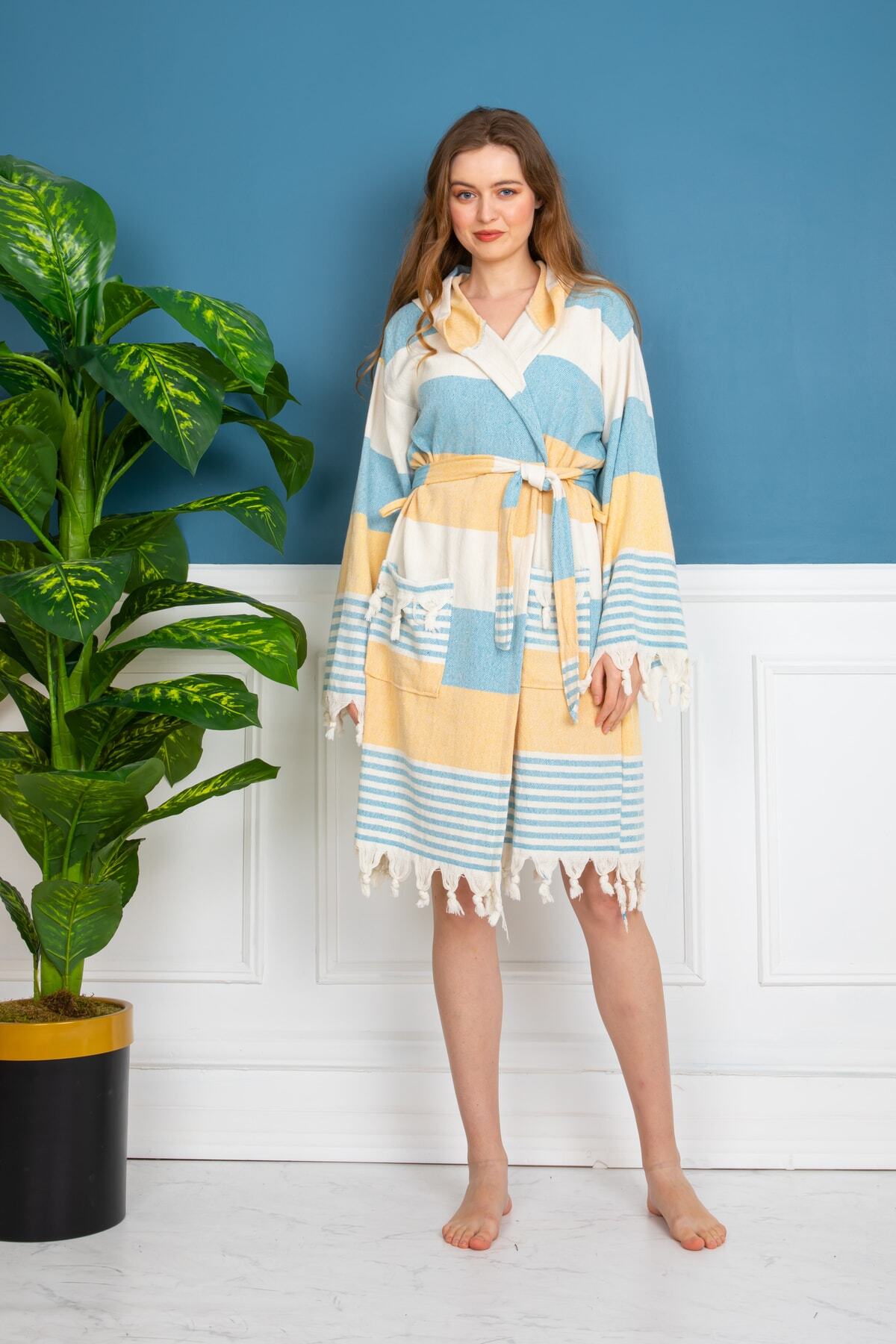 Tek parça halinde gelen bu bornoz, pratik kullanım için idealdir