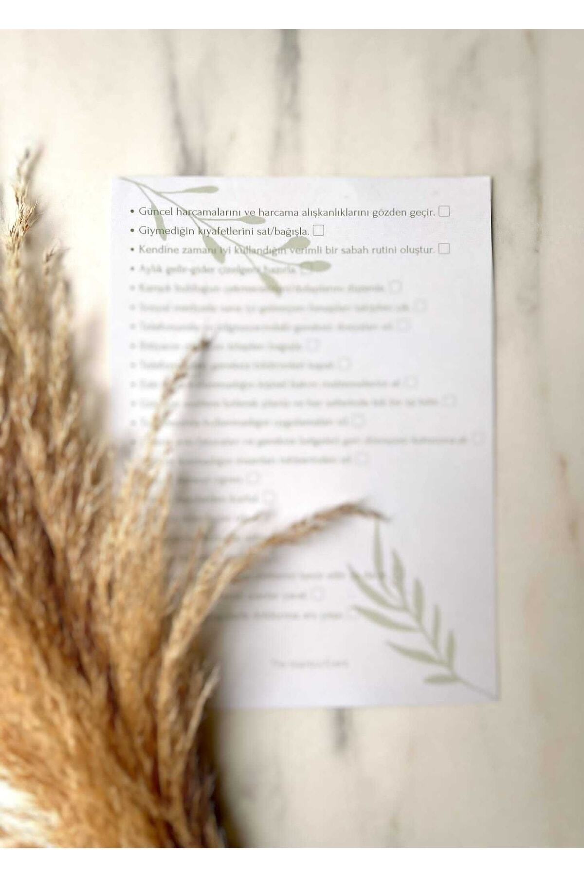 Ürün içeriği hayatını sadeleştirmeye, daha minimal yaşamaya karar verenler için özenle hazırlanmış maddelerden oluşur. Tamamladığınız maddelerin yanına tik atabileceğiniz kutucuk mevcuttur.