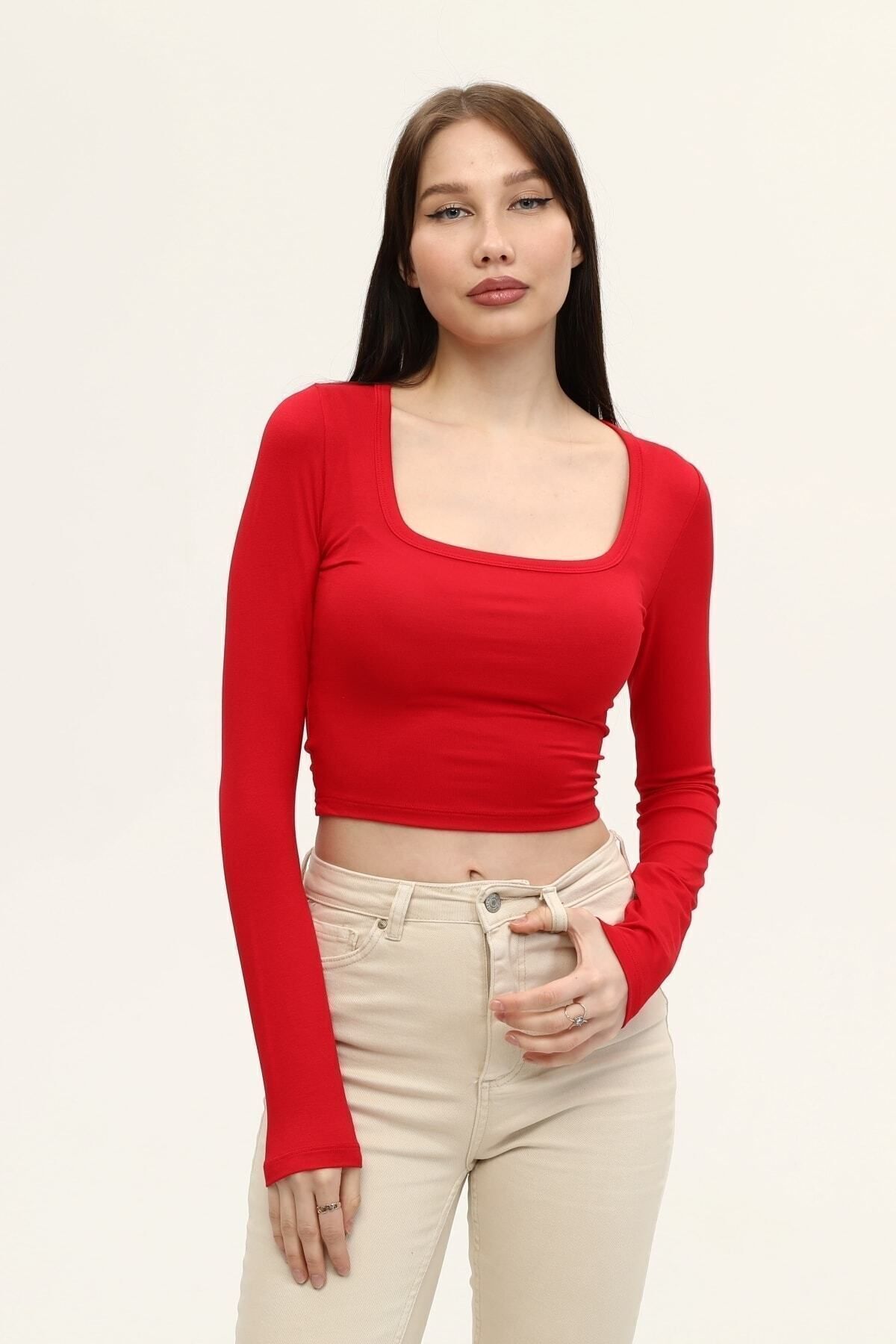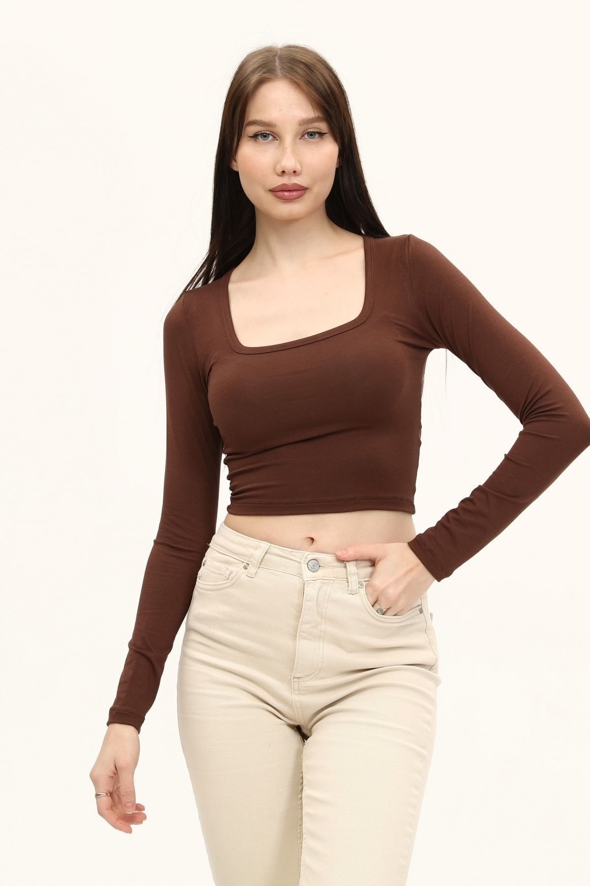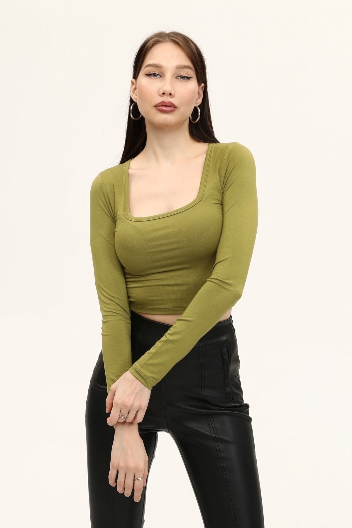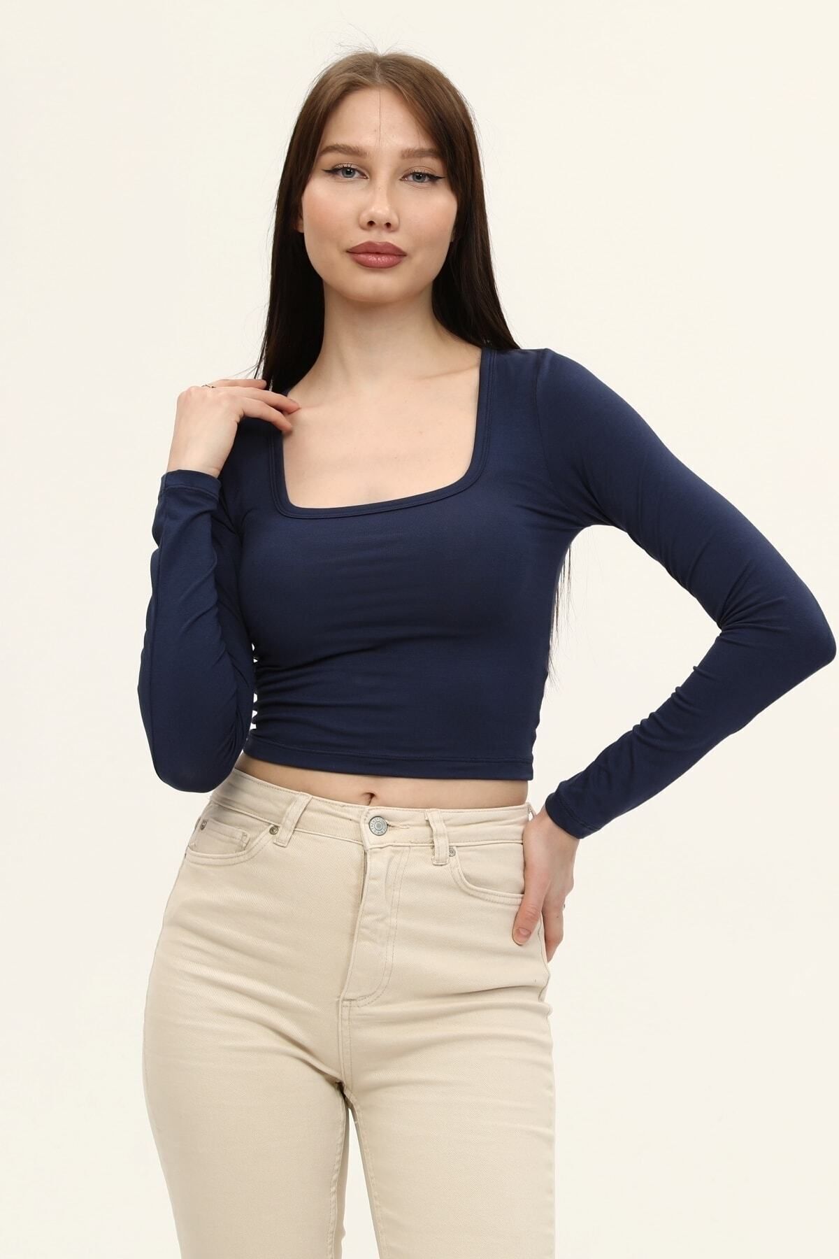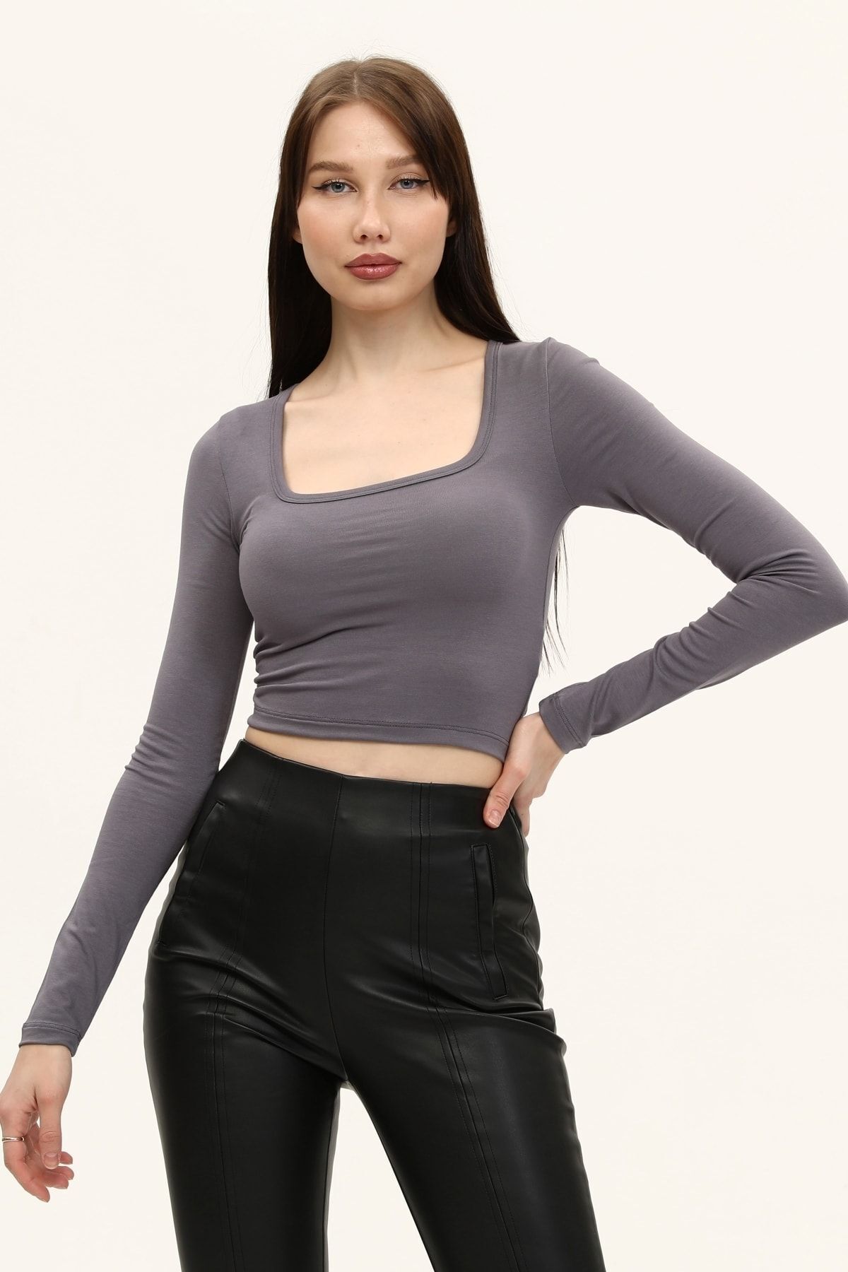 Kare yaka tasarımı ile modern ve şık bir görünüm sunar.