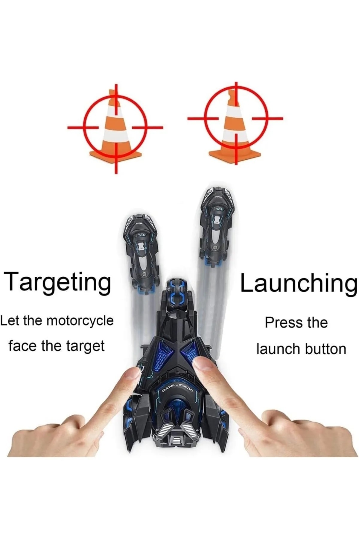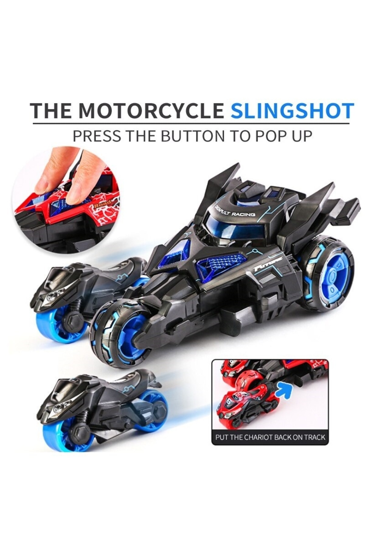 Oyuncak, arabanın kendisinden ve ileri doğru ateş eden 2 motosiklet vardır Tek yapmanız gereken motosikletleri arabanın önüne yerleştirmek ve düğmeye basmak.