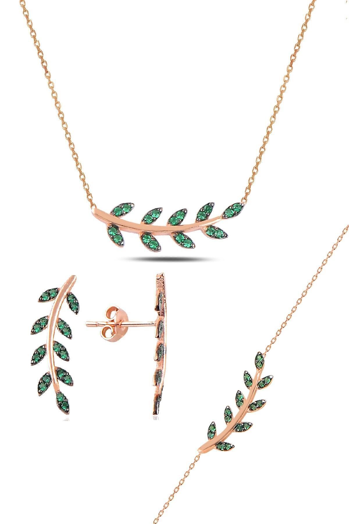 925 ayar gümüş rodyumlu zirkon taşlı yaprak kolye küpe ve bileklik üçlü set…Kolye Montür boyutu:20mm Zincir uzunluk:42+3 cm Bileklik Montür boyutu:20 mm Uzunluk :16+ 3 cm Küpe Boyut:20x6 mm Gümüş malzeme kullanımı, hem şıklığı hem de dayanıklılığı bir arada sunar