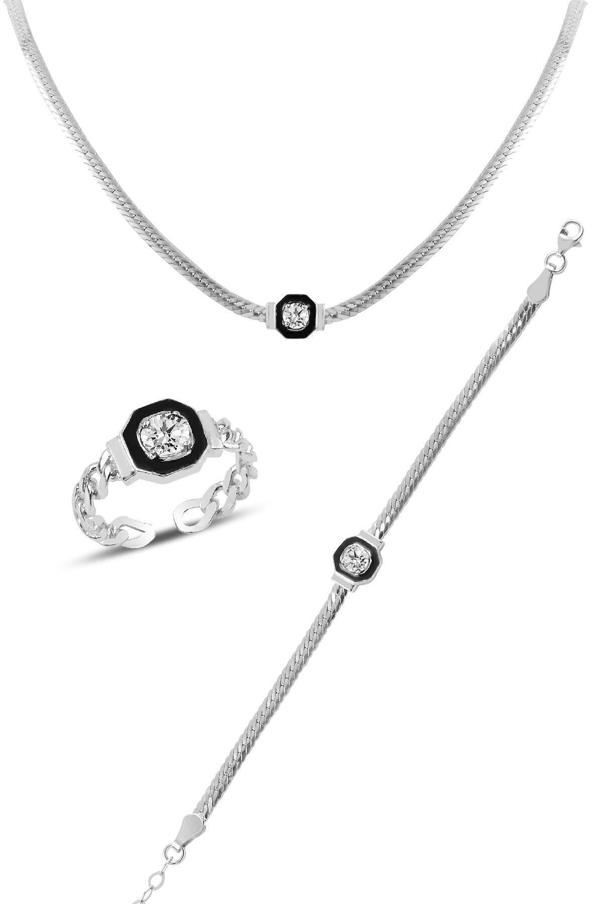 Kolye Tek Taş Boyut:9 mm zincir uzunluğu :40 +5 cm kalınlık:3,3 mm Bileklik uzunluğu :17+3 cm kalınlık:3,3 mm Yüzük Taş Boyut Kısım:9 mm - Zarif tasarımıyla dikkat çeken gümüş takı seti, şıklığınızı tamamlayacak bir aksesuar seçeneği sunar