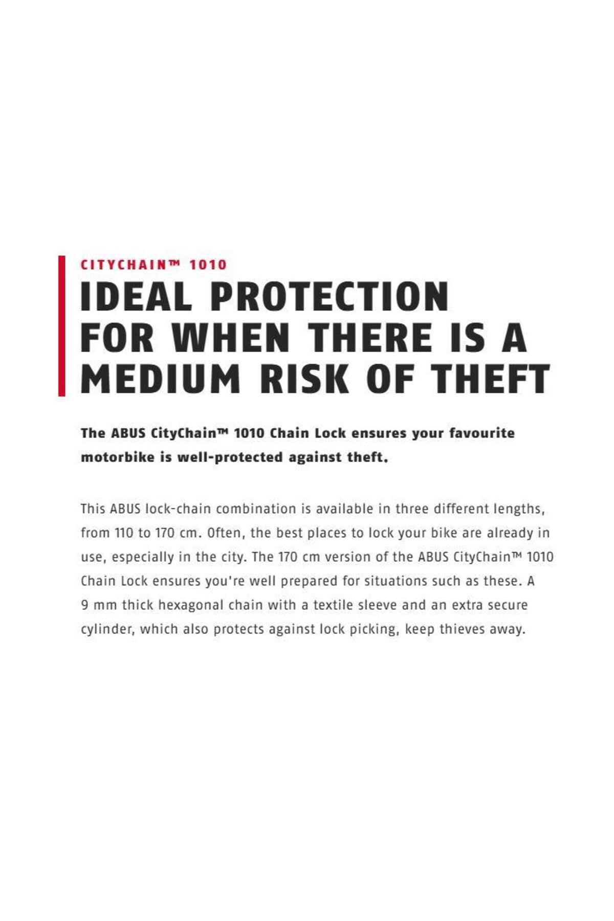 Abus cıtychaın 1010 moto 170cm orta hırsızlık riski olduğu durumlar için ideal koruma abus citychain™ 1010 zincir kilidi, favori motosikletinizin hırsızlığa karşı iyi korunmasını sağlar.