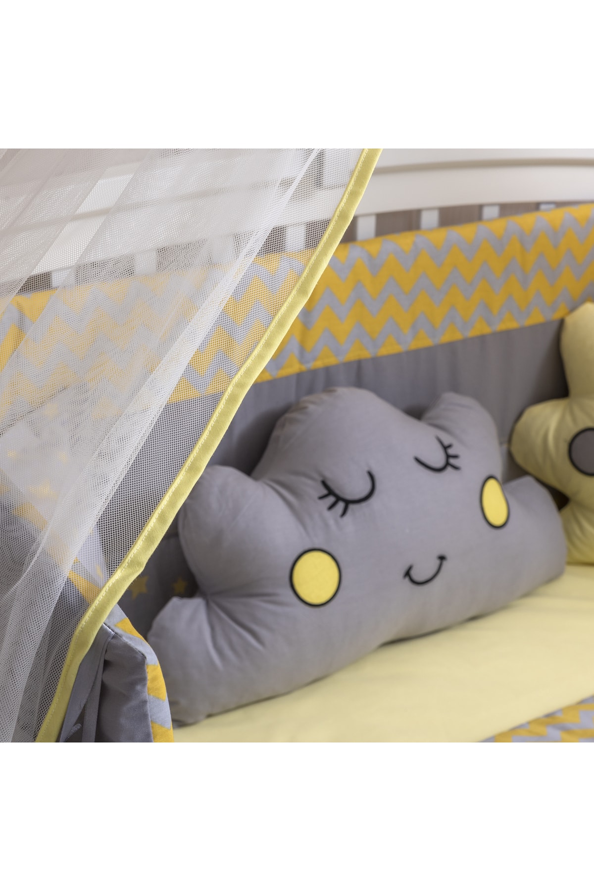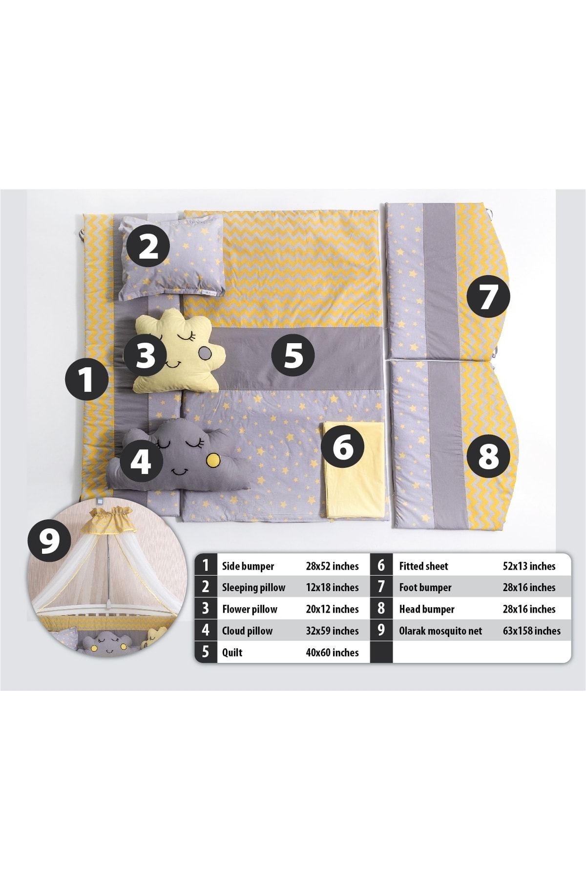 Paket İçeriği: 1 Adet Baş Koruma 80*60 1 Adet Ayak Koruma 80*60 2 Adet Yan Koruma 130*45 1 Adet Çarşaf 100x150 cm 1 Adet Yastık 40x25 cm 1 Adet Süs Yastık 30x30 cm 1 Adet Yorgan 90x140 cm 1 Adet Cibinlik 1 Adet Cibinlik Demiri Halı setlere dahil değildir.
