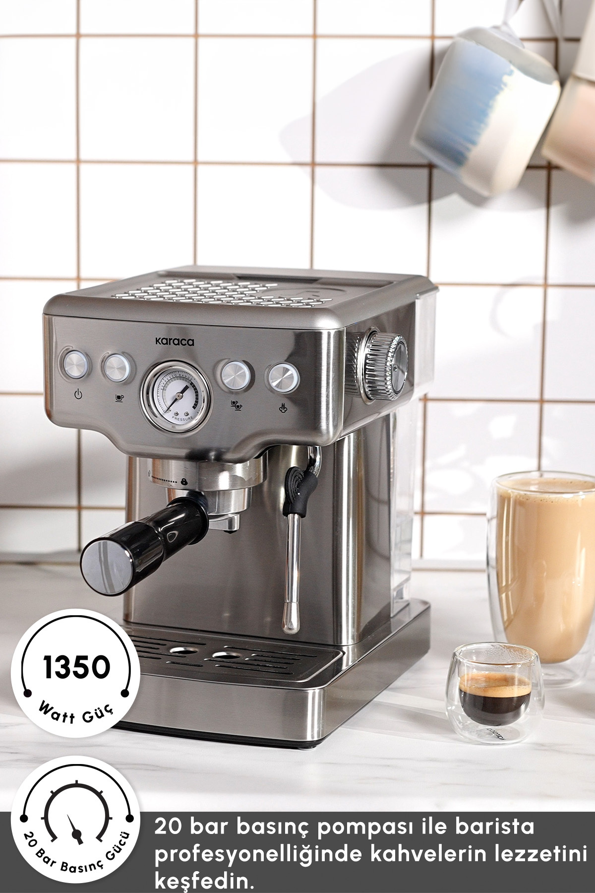 Coffee Art 1353 Süt Köpürtücülü 20 Bar Basınçlı Espresso, Latte Cappuccino Americano Makinesi Karaca Coffee Art 1353 Süt Köpürtücülü, 20 Bar Basınçlı, Espresso, Latte, Cappuccino, Americano Makinesi 1,8L Inox Karaca Coffee Art 1353 Espresso Makinesi ile tercihinize göre espresso, latte, cappuccino, americano, flat white, cortado, macchiato, lungo, affogato, ice latte, ice cappuccino ve ice americano gibi kahveleri tam kıvamında hazırlamak artık çok kolay.