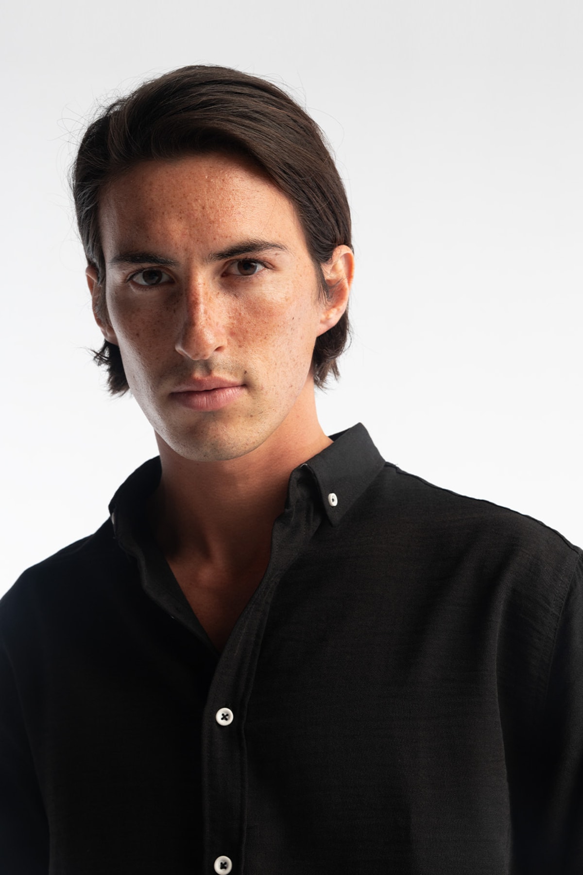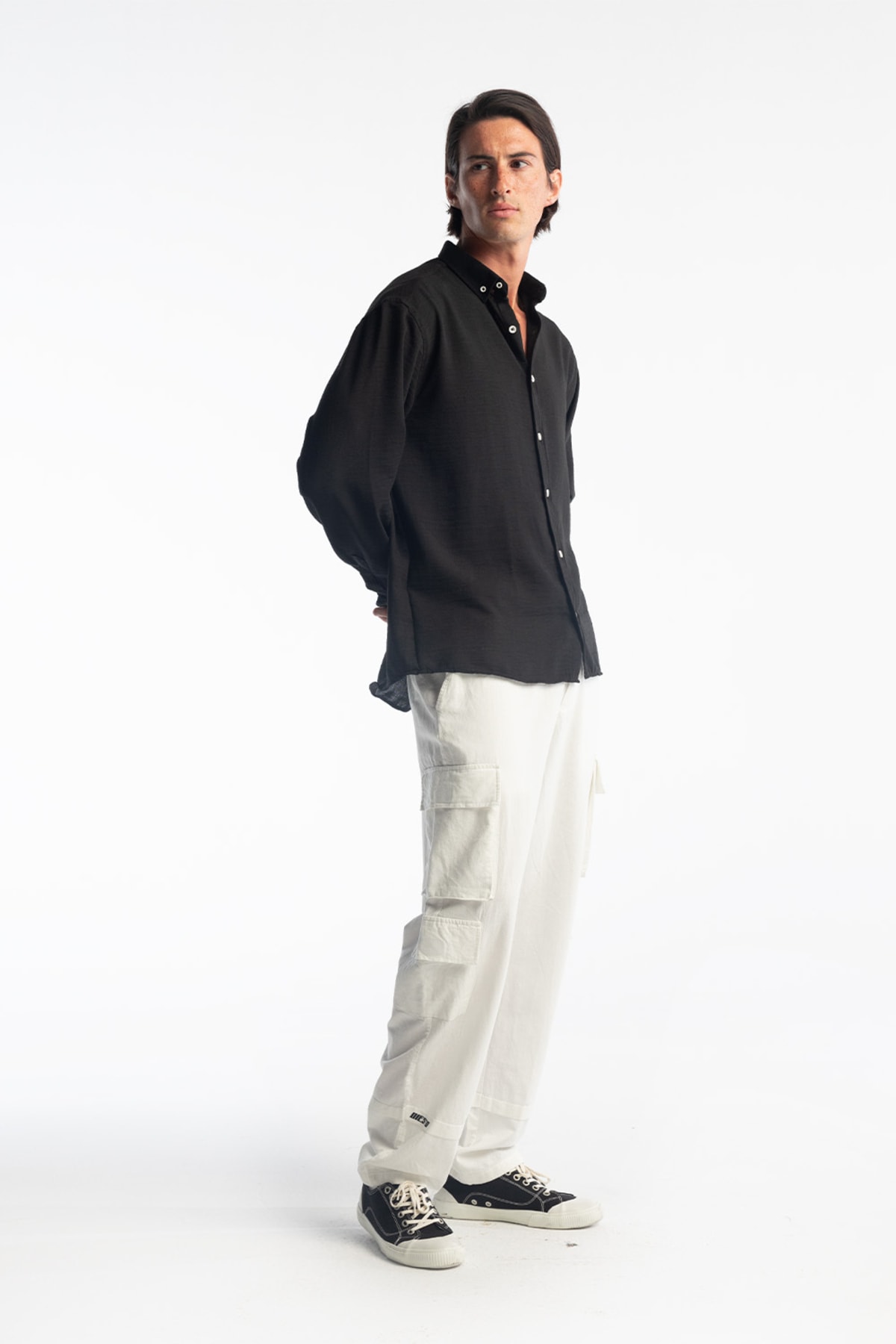 ÜRÜN ÖZELLİKLERİ Oversize, Kırışık görünümlü, Yaka düğme detaylı, Dökümlü oversize erkek gömlek MANKEN ÖZELLİKLERİ Beden: Medium Boy: 1