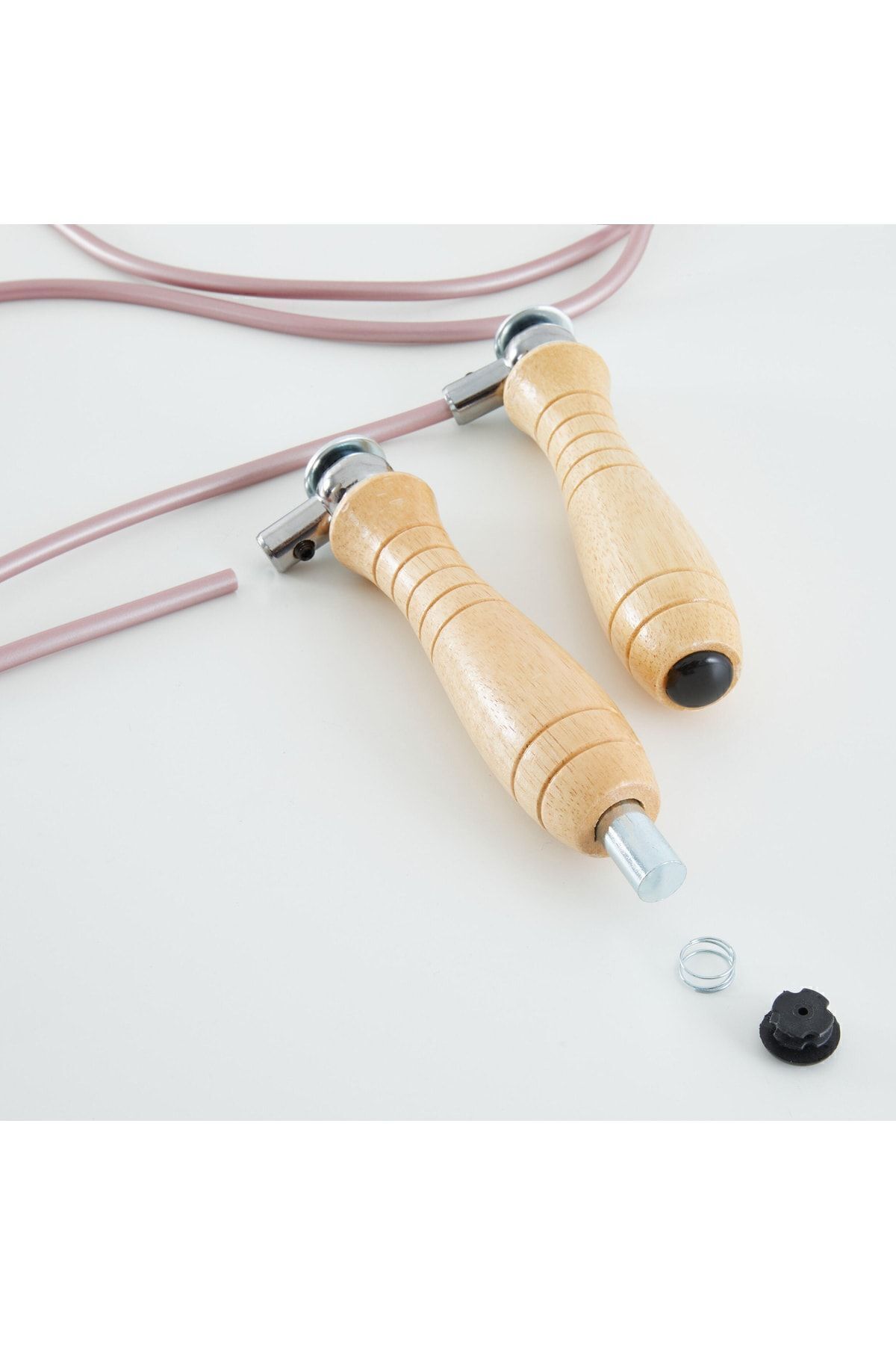 RENK: Ekru/GÜL KURUSU ÜRÜN FAYDALARI Yıpranmaya karşı dayanıklılık: 0,8 cm PVC ip, sürtünmeye karşı ideal direnç sağlar. İlerleme kalitesi: Merkezi eksene ve metal parçalara sahip yenilikçi dönüş sistemi. Ağırlık: İki adet çıkarılabilir 45 gram ağırlığa sahip entegre ağırlık sistemi . Ergonomik kavrama: Daha iyi kavrama için yivli ergonomik ahşap saplar. Vücuda uygunluk: Uyarlanabilir ip uzunluğu. ÜRÜN KONSEPTİ VE TEKNOLOJİSİ ÜRÜN BİLEŞİMİ: Sap/tutma yeri 65% Ahşap, 30% Demir, 5% Polipropilen Halat 100% Polivinil Klorür KULLANICI TALİMATLARI: Herhangi bir ısı kaynağının yakınına koymayın. TEKNİK BİLGİLER TASARIM : Bu ipi, aşınmaya karşı çok dayanıklı olması için kaliteli malzemelerle tasarladık. 0,8 cm PVC ip genişliği çoğu zeminde aşınmaya karşı dayanıklılık sağlar. Ahşap saplar ve çelik döndürme sistemi benzersiz bir kullanım ömrü sunar.