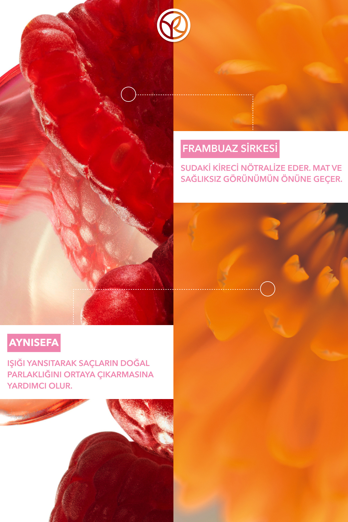 -- İçeriği Nedir? -- İçeriğindeki Frambuaz Sirkesi , kireç önleyici ve anti oksidan özelliği sayesinde saçların mat ve sağlıksız görünümünün önüne geçer.