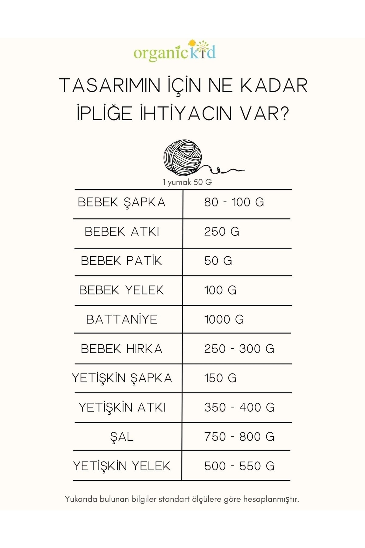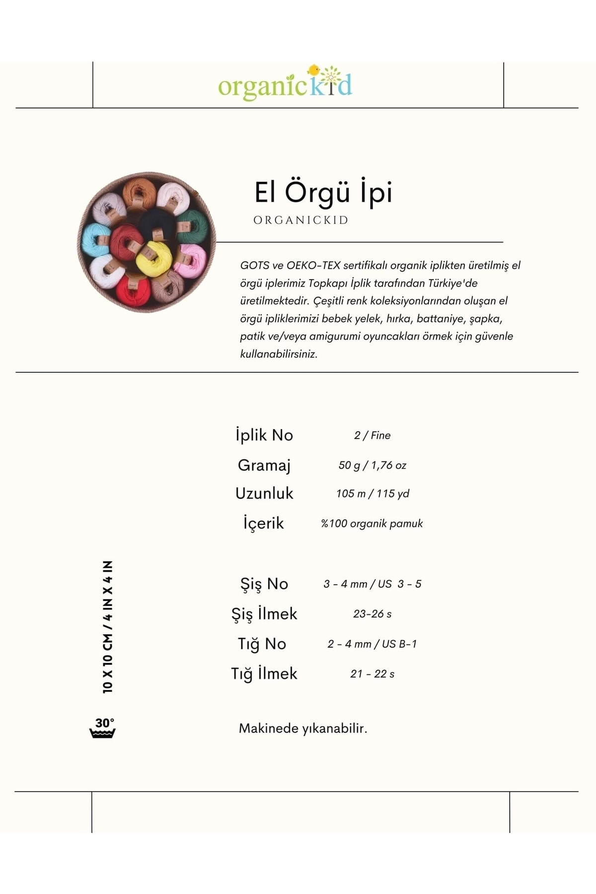 İplik No: 2 / Fine Gramaj: 50 g / 1,76 oz Uzunluk: 105 m / 115 yd İçerik: %100 organik pamuk Şiş No: 3-4 mm / US 3 - 5 Şiş İlmek: 23-26 s Tığ No: 2 - 4 mm / US B-1 Tığ İlmek: 21 - 22 s Makinede 30°C sıcaklıkta benzer renklerle yıkanabilir.
