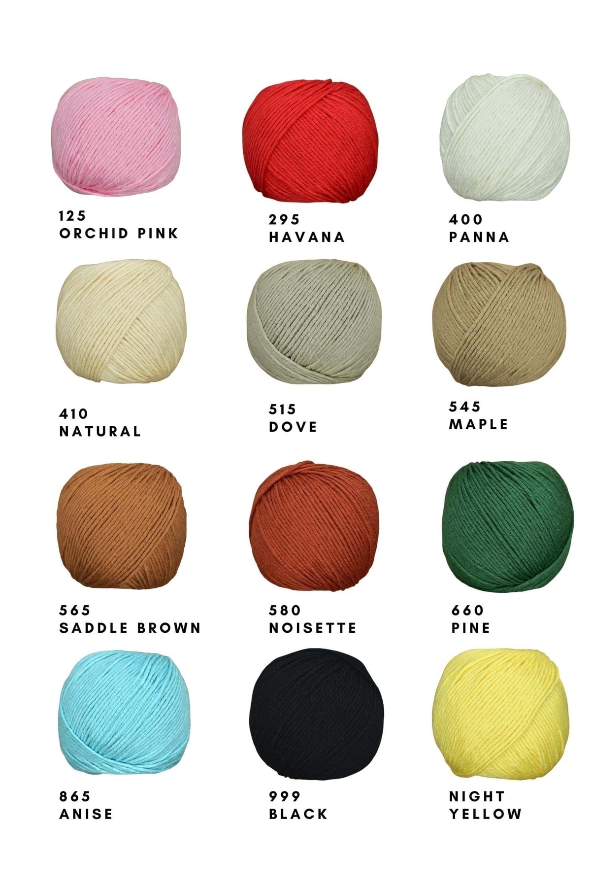 Çeşitli renk koleksiyonlarından oluşan el örgü ipliklerimizi bebek yelek, hırka, battaniye, şapka, patik ve/veya amigurumi oyuncakları örmek ve punch için güvenle kullanabilirsiniz.